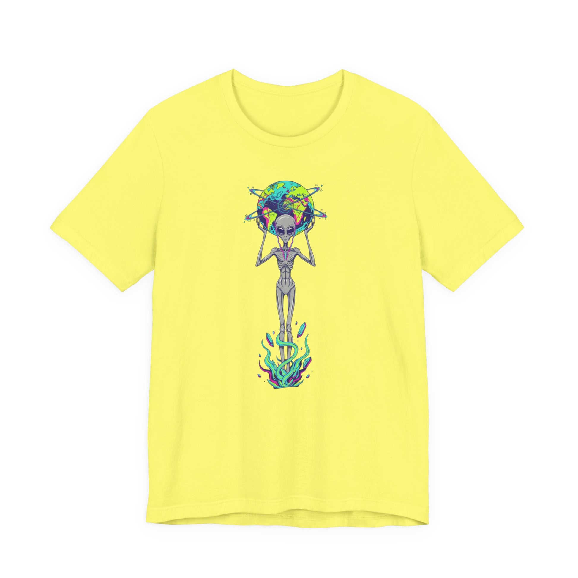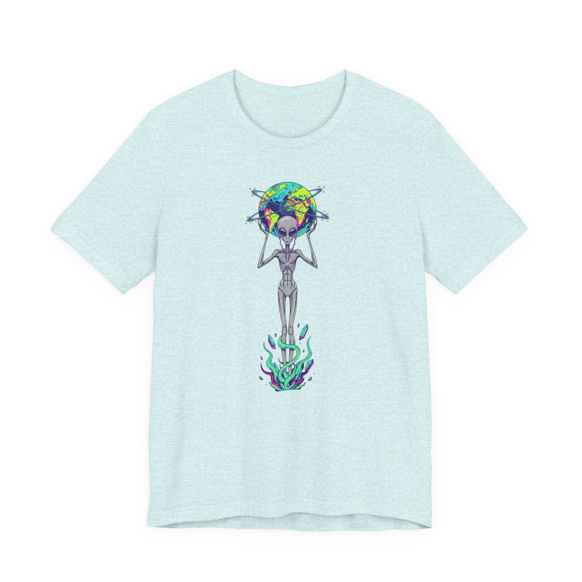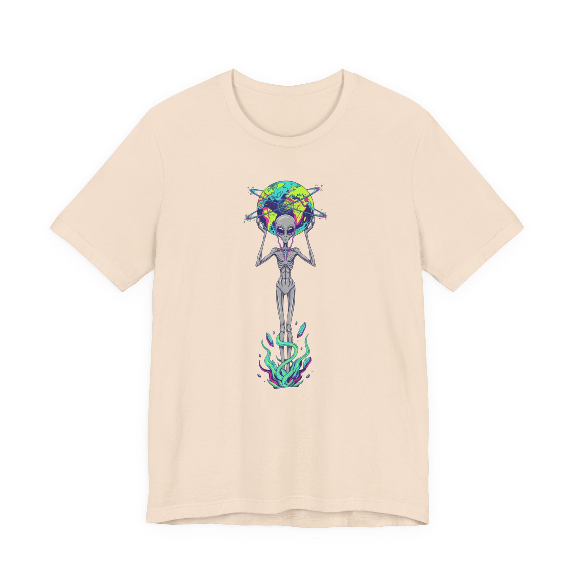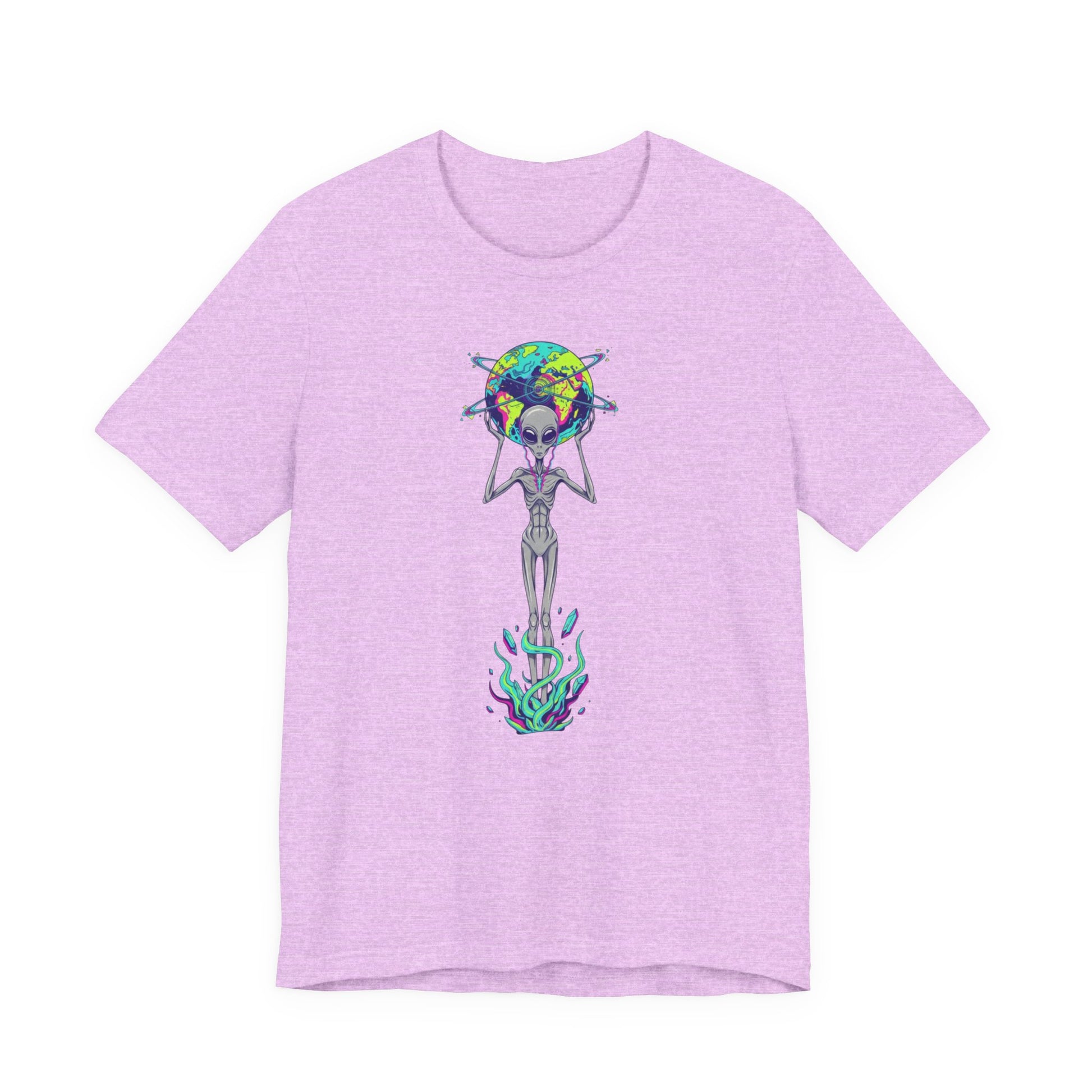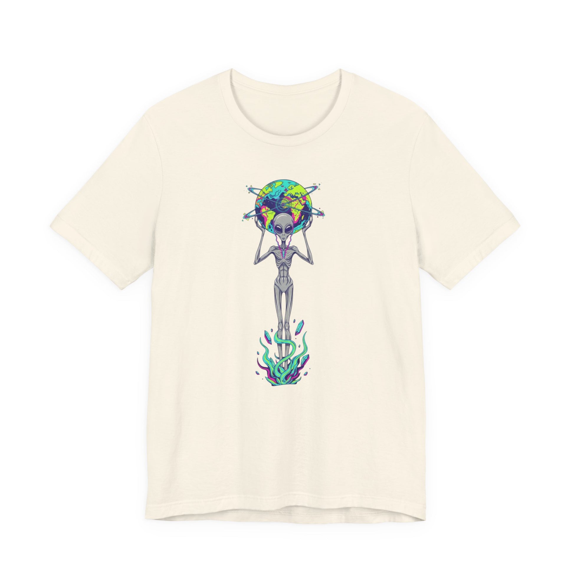 This lightweight jersey tee wears like a cool afternoon on a summer road trip — breezy, soft, and a little bit strange in the best way. A slender, alien figure rises in vivid greens and purples, holding a trembling, watercolor-streaked planet overhead while ethereal smoke coils beneath. The artwork feels like a midnight alleyway mural that remembers constellations and skateboard decks: bold lines, neon accents, and an otherworldly calm. The retail cut keeps the silhouette neat for layering under jackets or worn alone with high-waisted jeans. Thoughtfully made from Airlume combed and ring-spun cotton, it stays breathable during long days and retains shape through repeat wears. REACH-certified and produced with attention to ethical manufacturing, this tee connects visual attitude with comfortable, wearable quality.