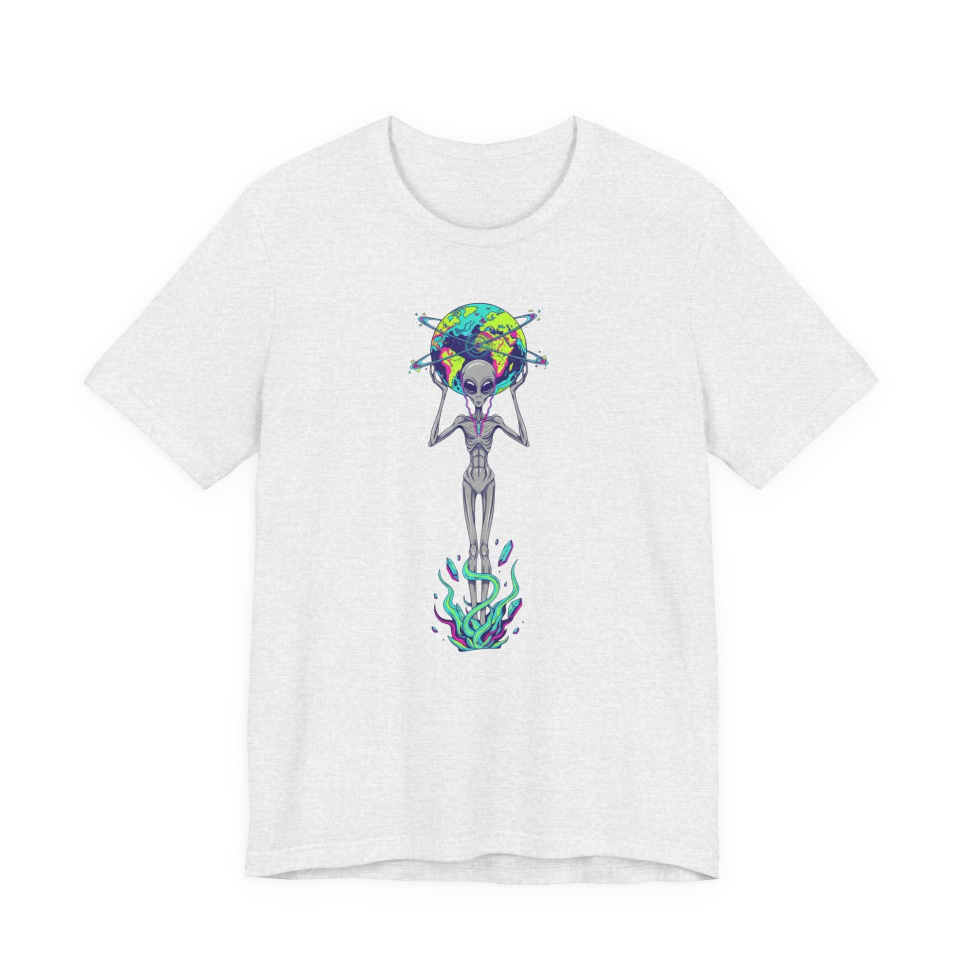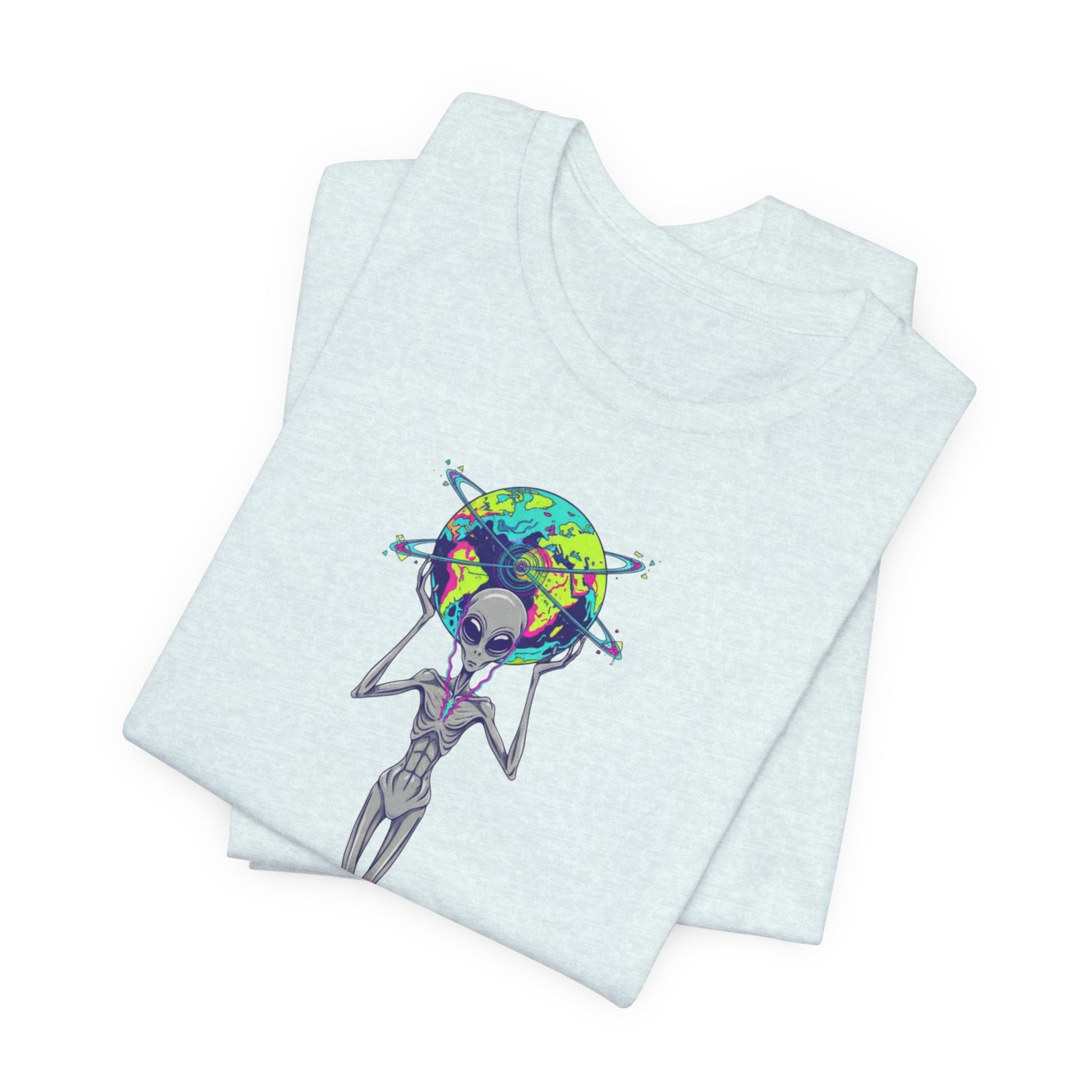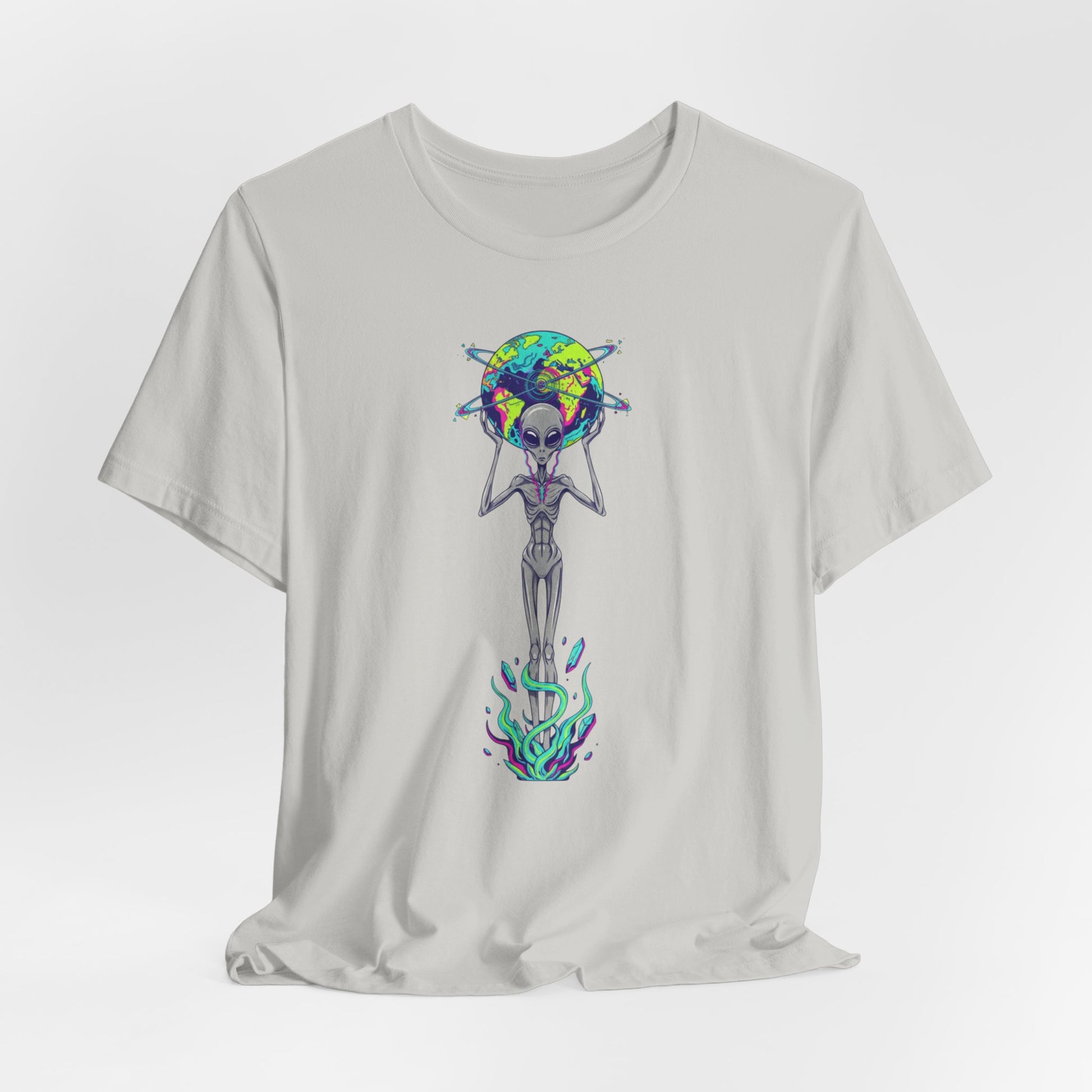 Alien Holding Earth Graphic Tee — Cosmic Sci‑Fi Alien Shirt