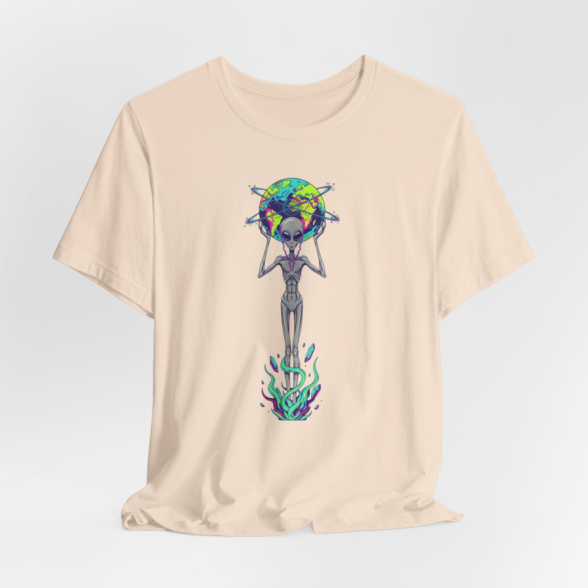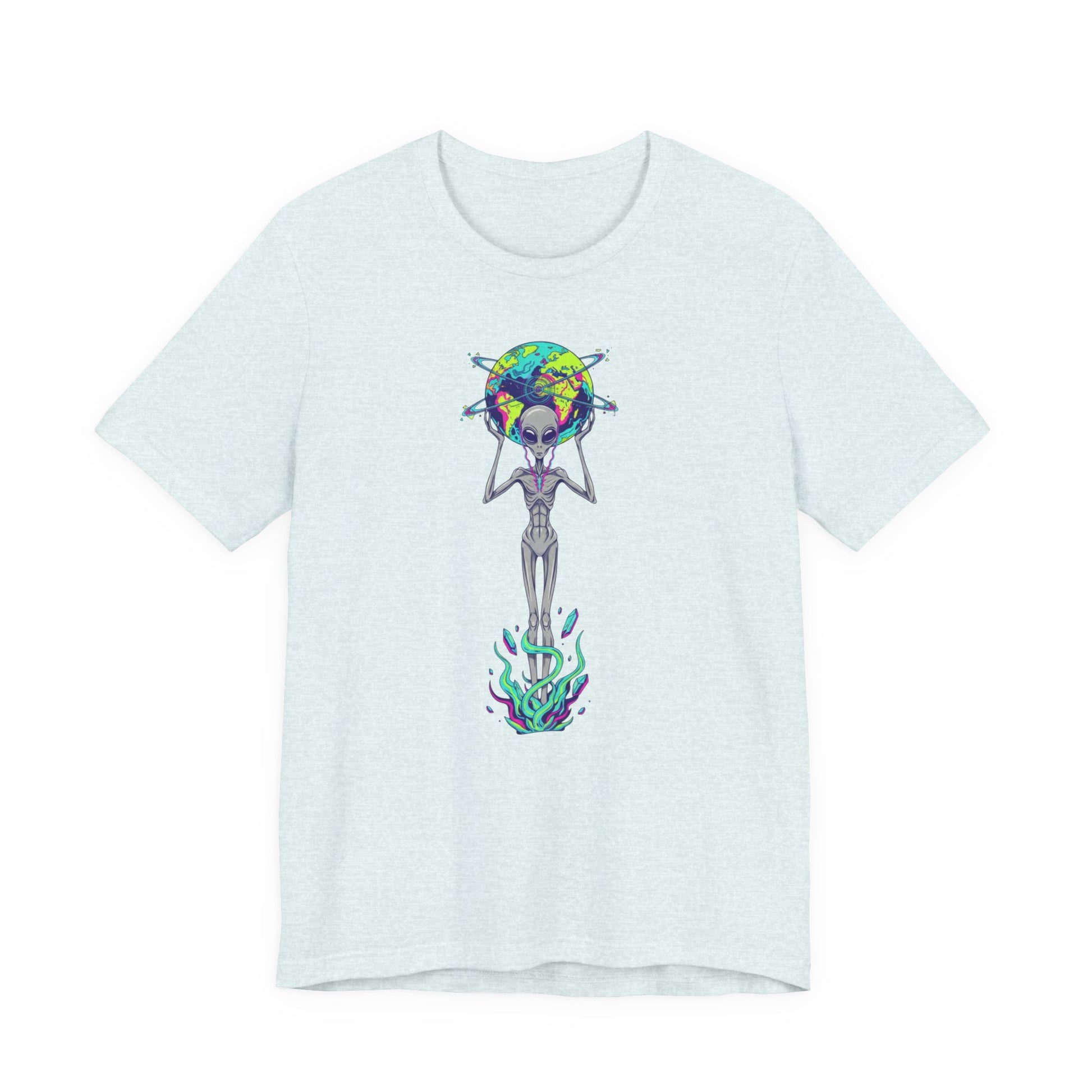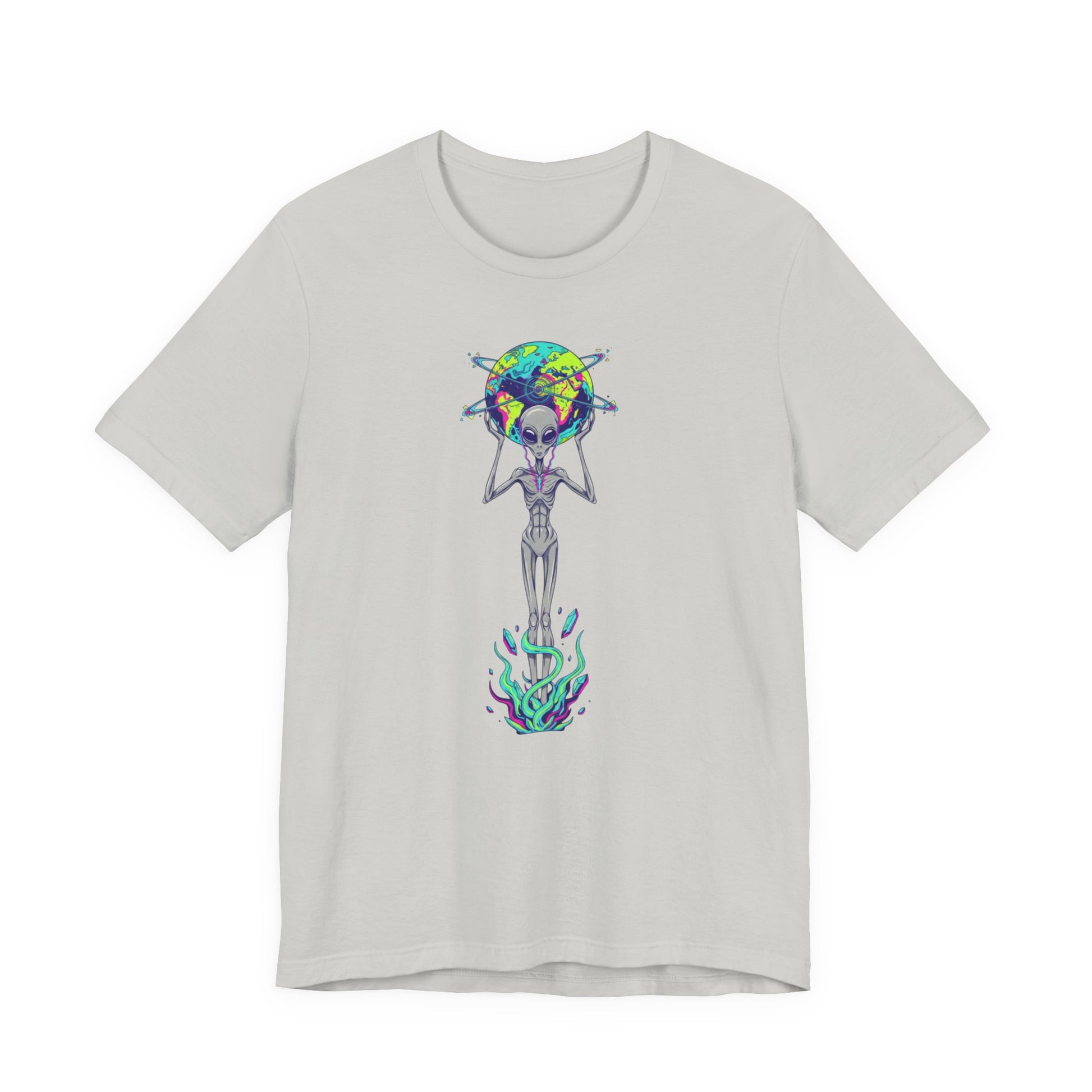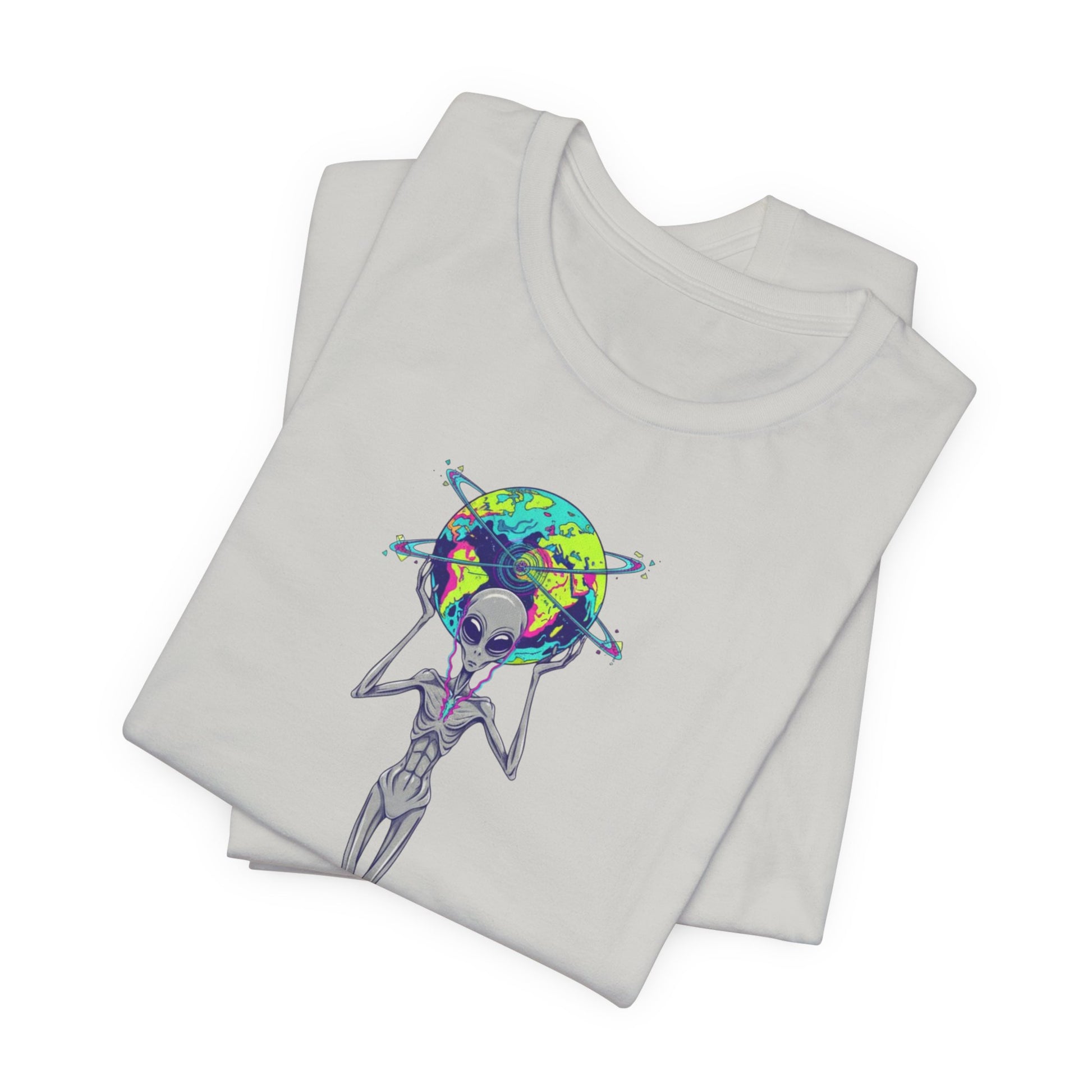 Alien Holding Earth Graphic Tee — Cosmic Sci‑Fi Alien Shirt