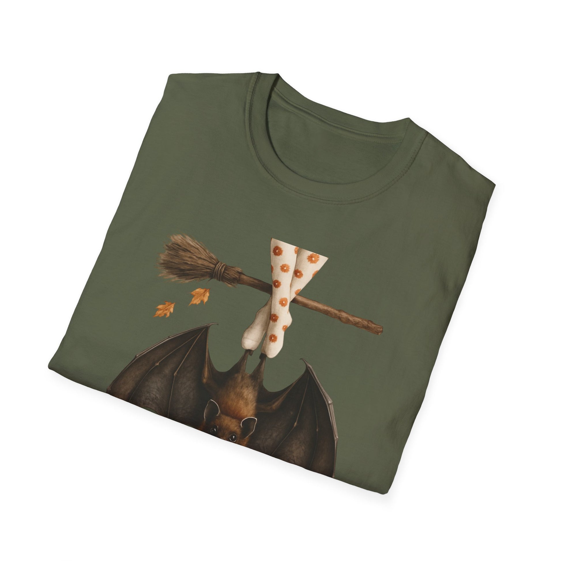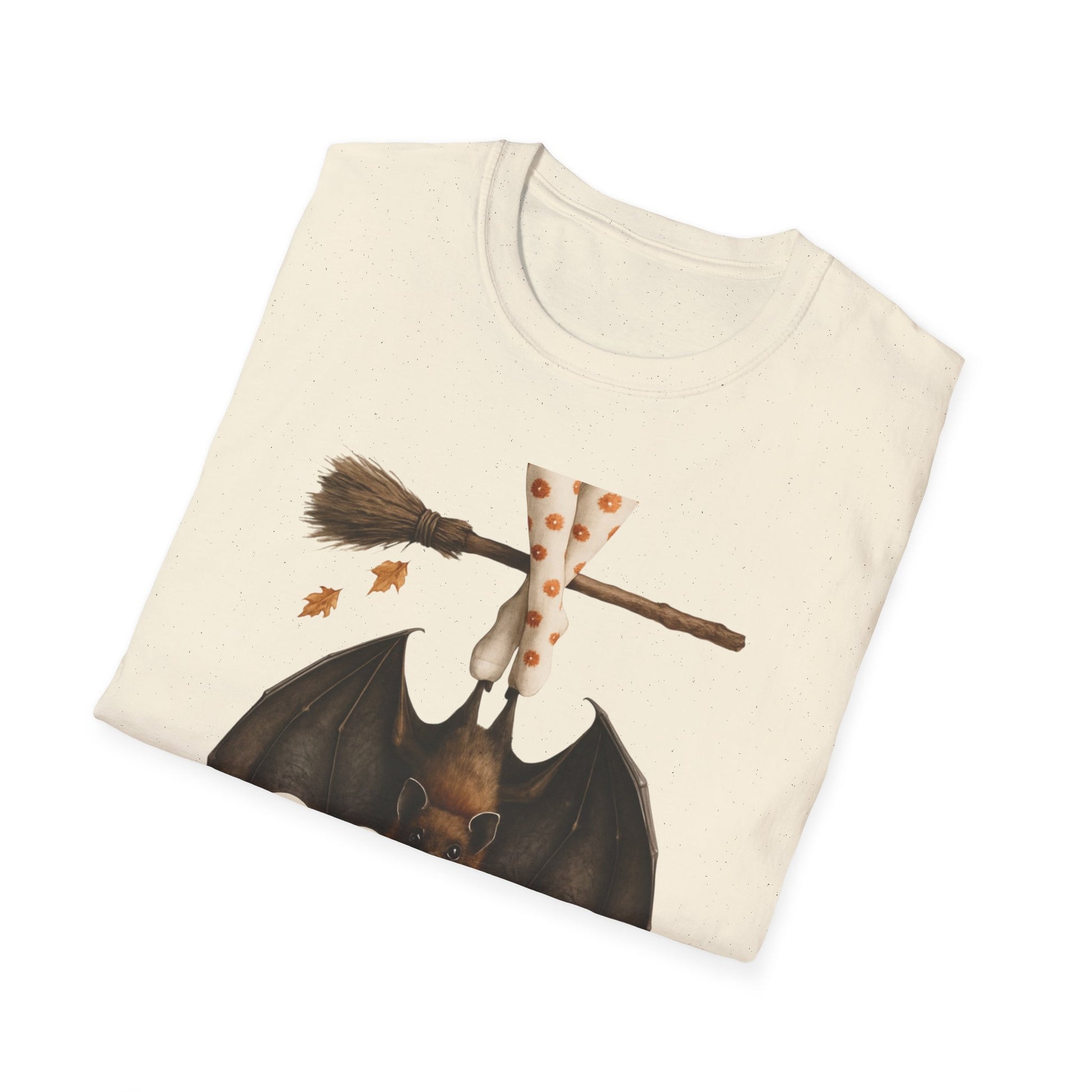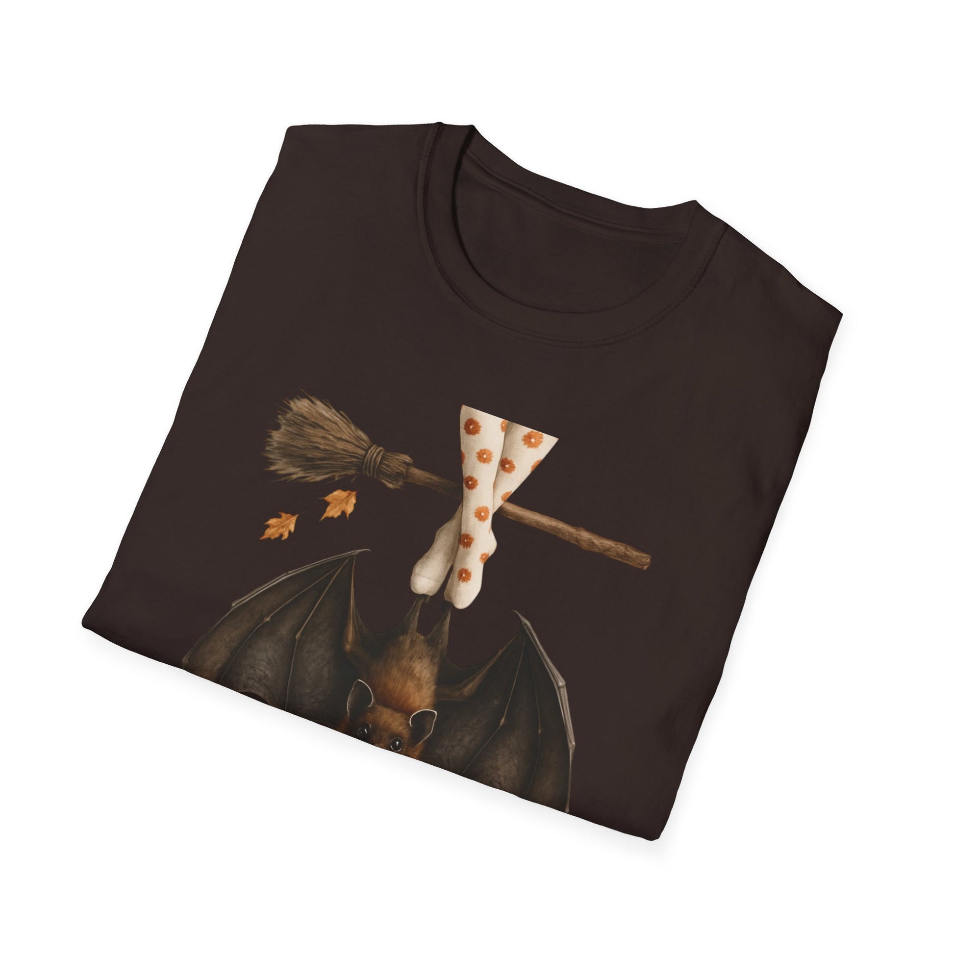 Bat and Bubblegum Unisex Softstyle T-Shirt, Halloween Top, Whimsical Graphic Tee, Cute Gift for Animal Lovers, Fall Vibes