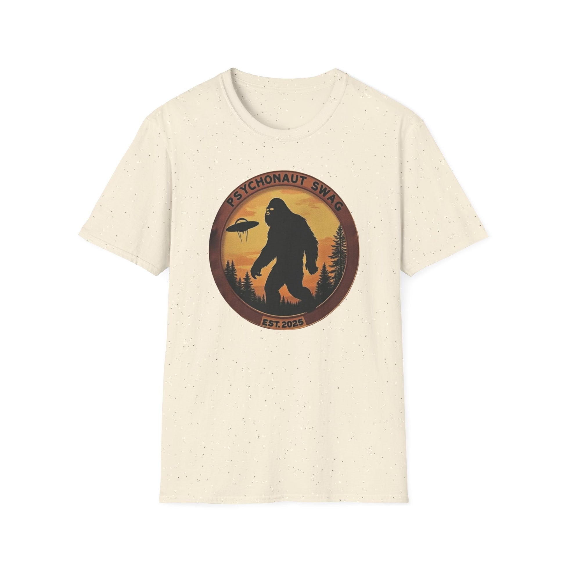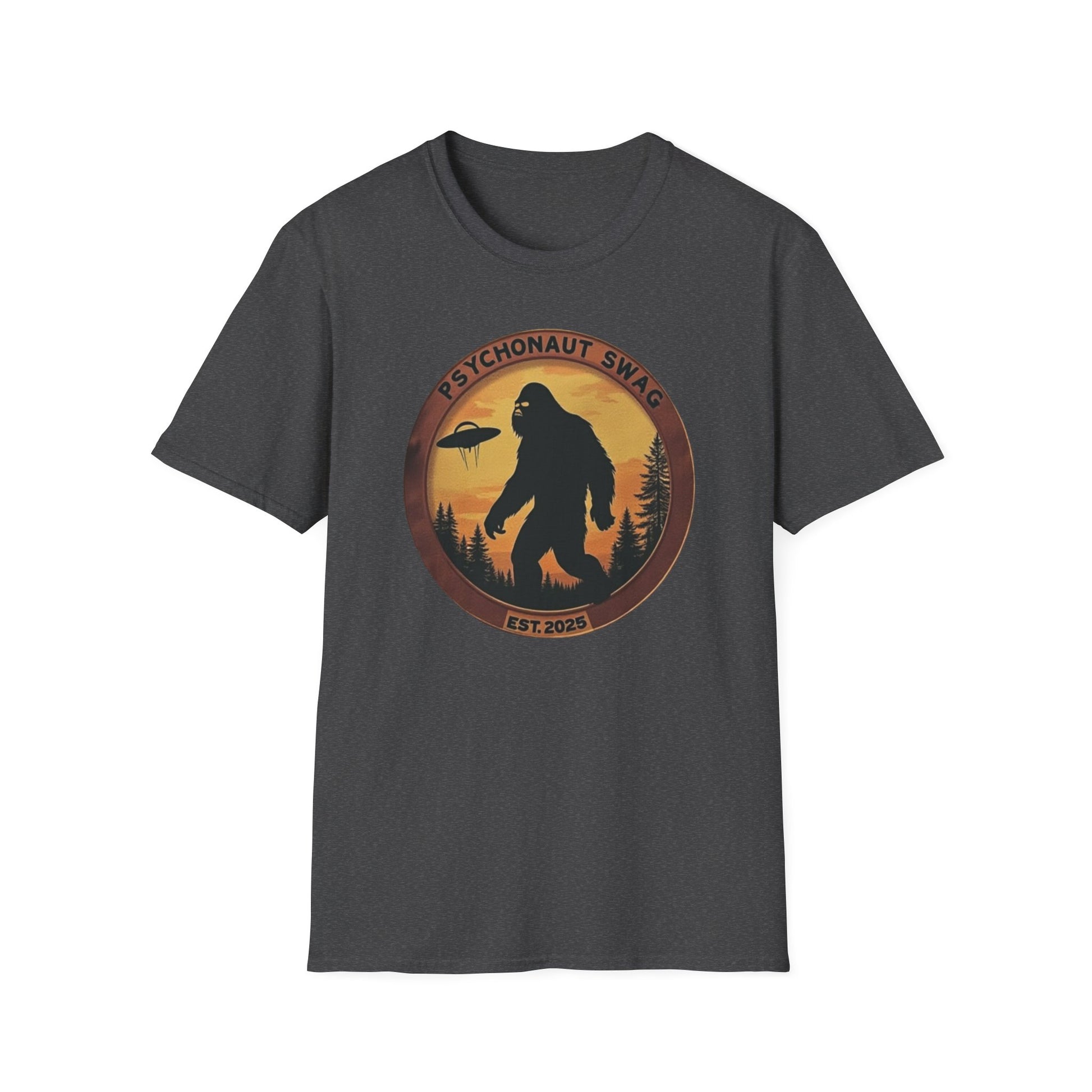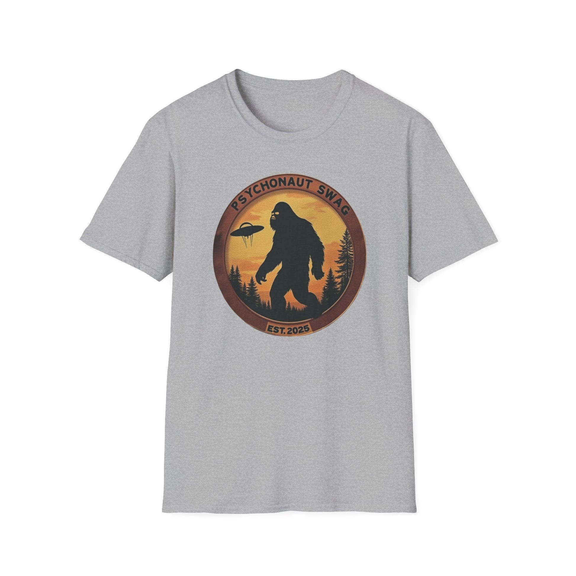 Bigfoot and UFO, Unisex Softstyle T-Shirt, Trendy Graphic Tee, Funny Bigfoot Shirt, Adventure Apparel, Gift for Nature Lovers