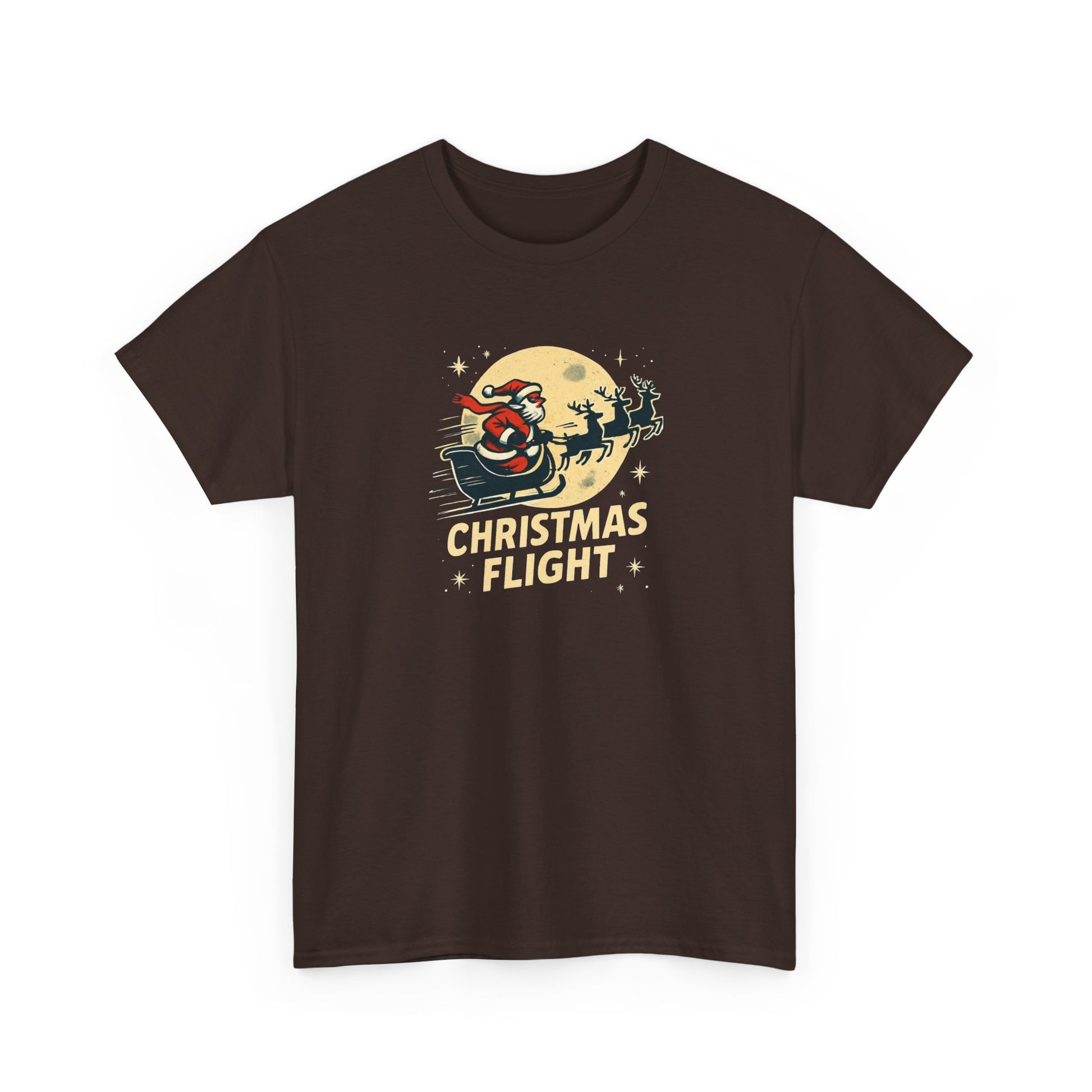 A soft, classic crew tee that carries a playful holiday spirit. The vintage-inspired “Christmas Flight” artwork shows Santa mid-sleigh beneath a glowing moon, printed with crisp, durable inks that hold their color wash after wash. Wear it to add a cozy, nostalgic touch to chilly evenings, tree-decorating sessions, or casual holiday get-togethers. The relaxed fit and smooth knit make it comfortable layered under a flannel or worn on its own while wrapping presents or sipping hot cocoa. Thoughtful details like a tear-away label and reinforced shoulder tape keep the shirt feeling comfortable and familiar for seasons to come.