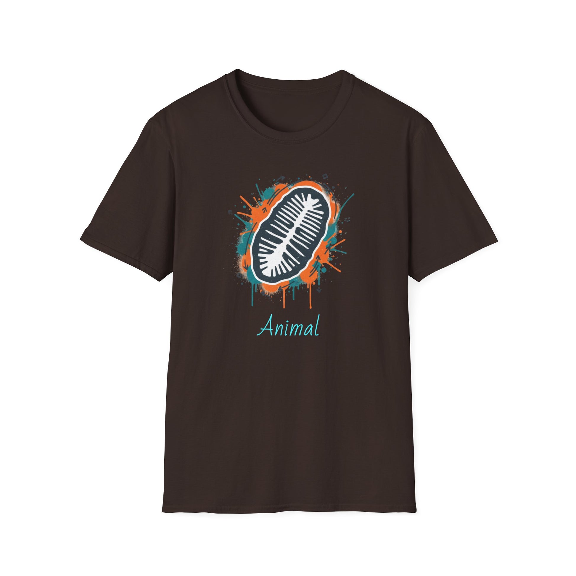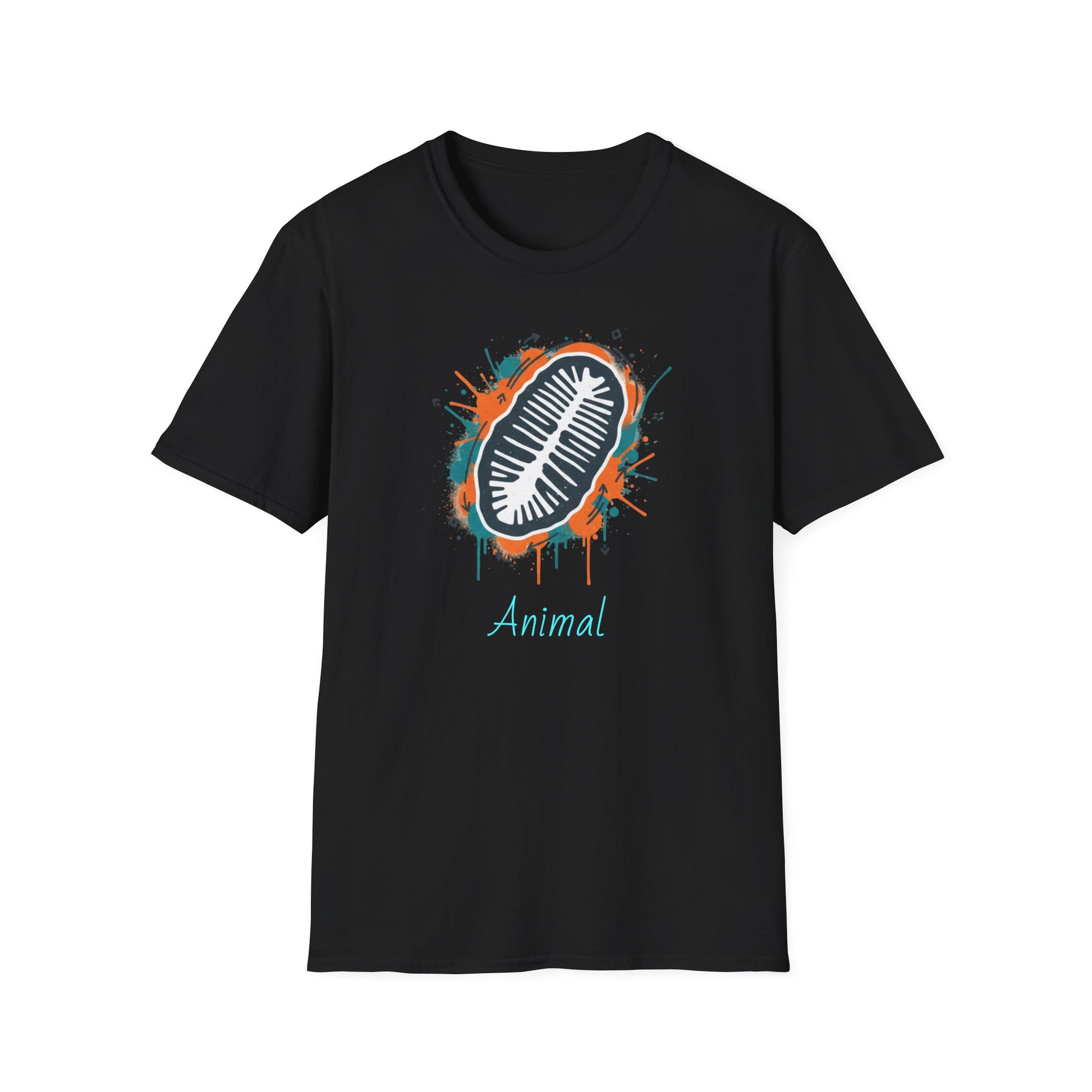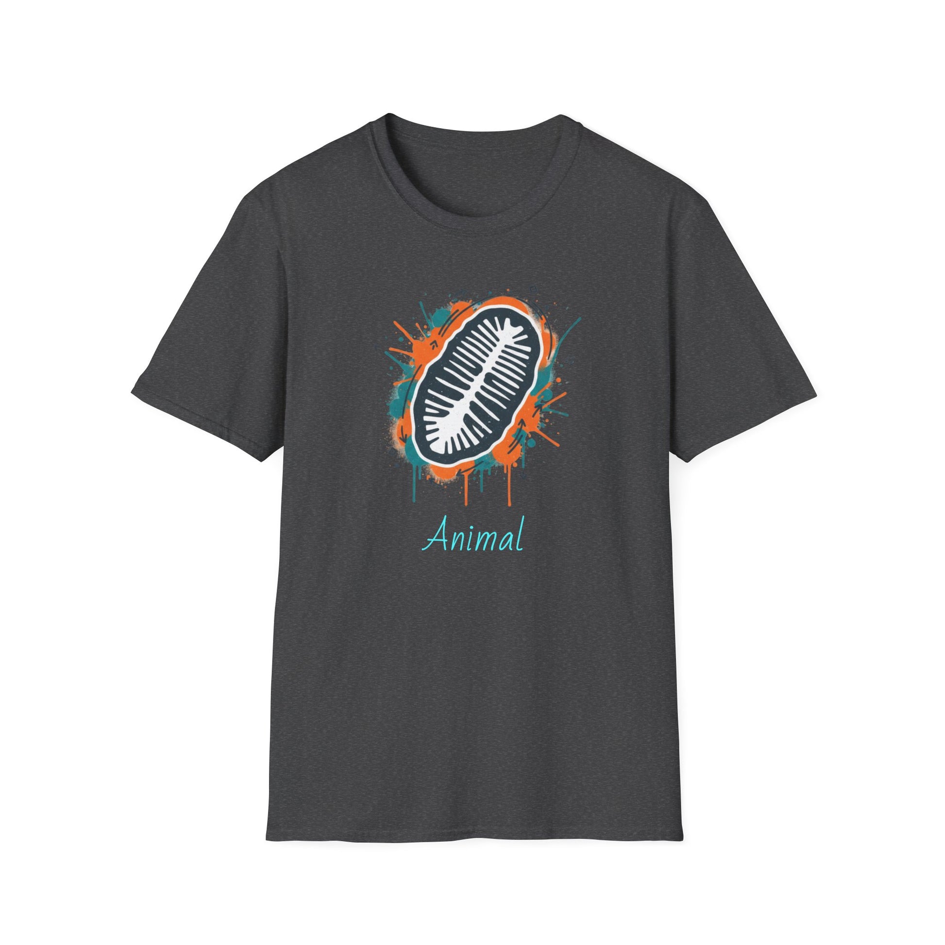 This lightweight cotton tee carries an urban-natural vibe: a bold, hand-painted chiton fossil graphic sits at the chest in splashy turquoise and rust tones, with the word “Animal” beneath in a casual script. It feels like a walk through tide pools after a storm — tactile, slightly weathered, and quietly scientific. Wear it with worn jeans or layered under a flannel for museum trips, field notes, or weekend explorations. The soft ring-spun cotton and clean crew neckline make it comfortable all day, while durable printing keeps the design vivid wash after wash.