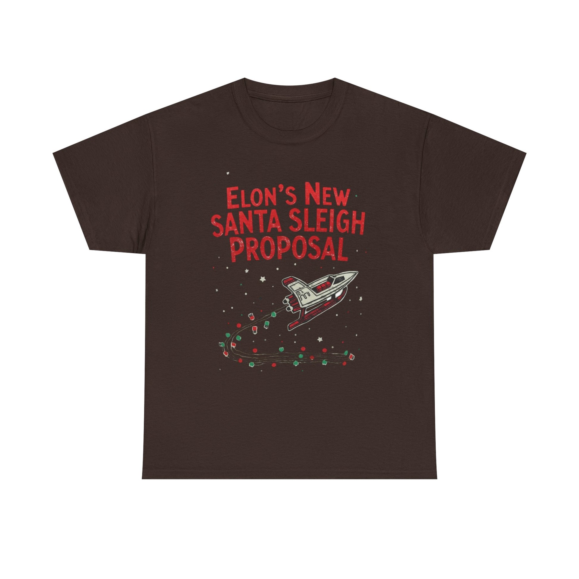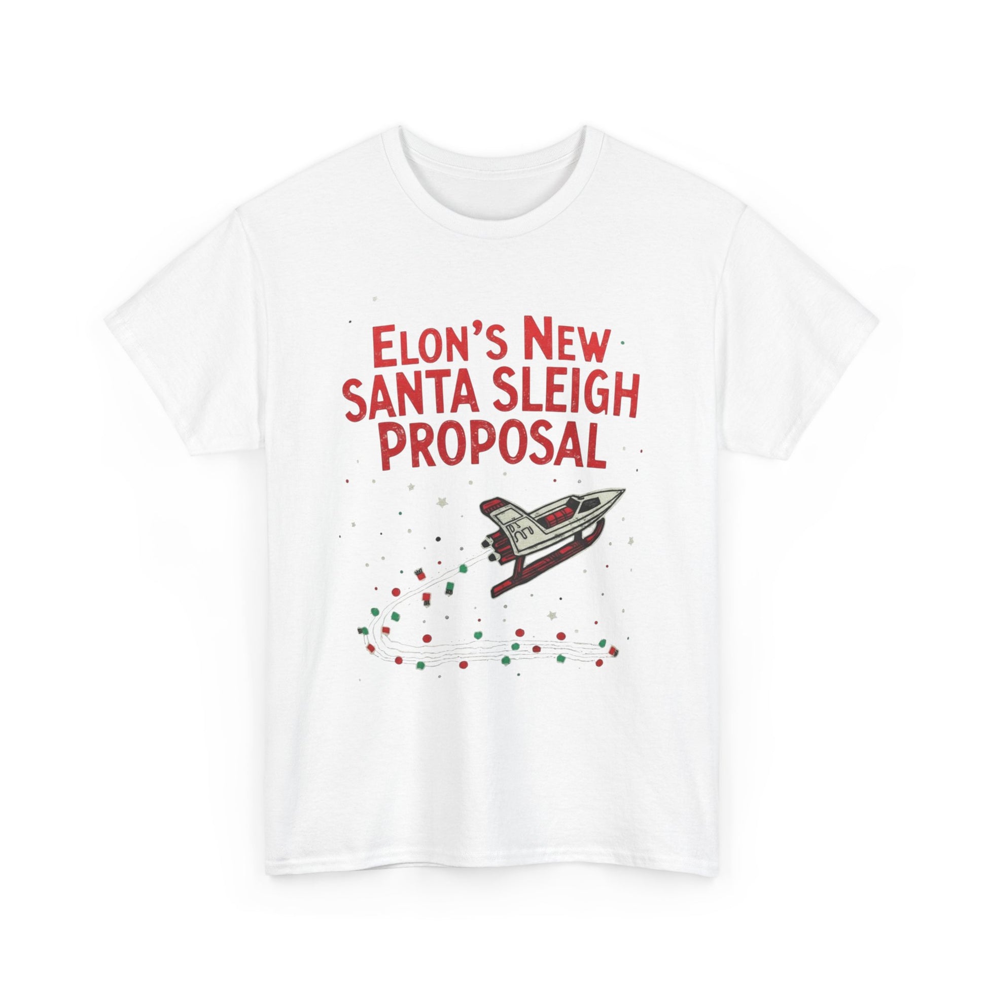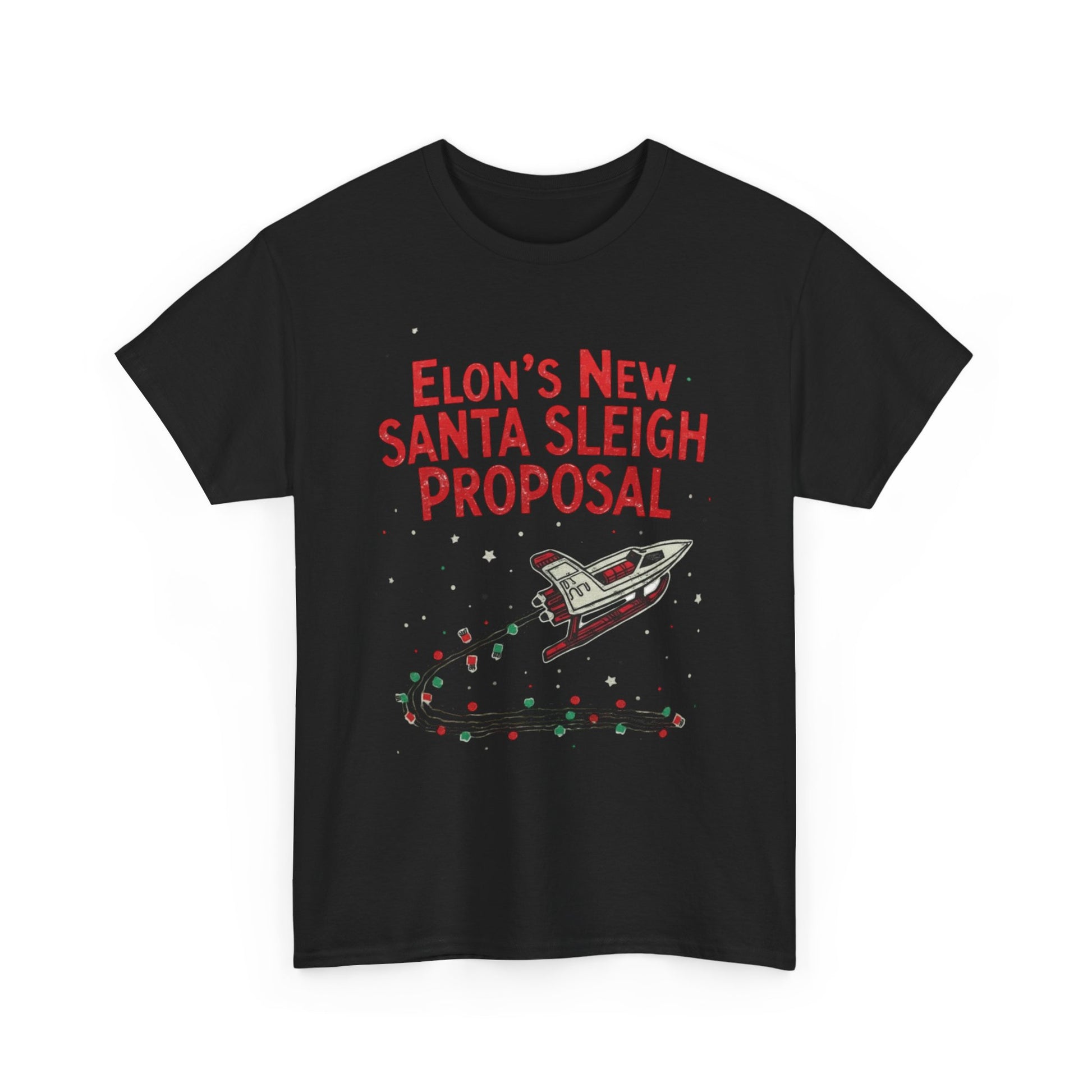 This soft, mid-weight tee carries a playful holiday graphic that swaps reindeer for rockets: a retro-style spacecraft pulls a light-trimmed sleigh across a starlit sky under the headline “Elon’s New Santa Sleigh Proposal.” It’s casual, comfortable, and made to be worn during laugh-filled gatherings — whether you’re trimming the tree, heading to a quirky office party, or handing out cookies to neighborhood trick-or-treaters. The relaxed crew neckline and classic fit layer easily under jackets or over flannel, while the durable cotton fabric keeps the print crisp wash after wash. Wear it when you want a bit of cheeky, science-meets-holiday humor that sparks conversation and smiles.