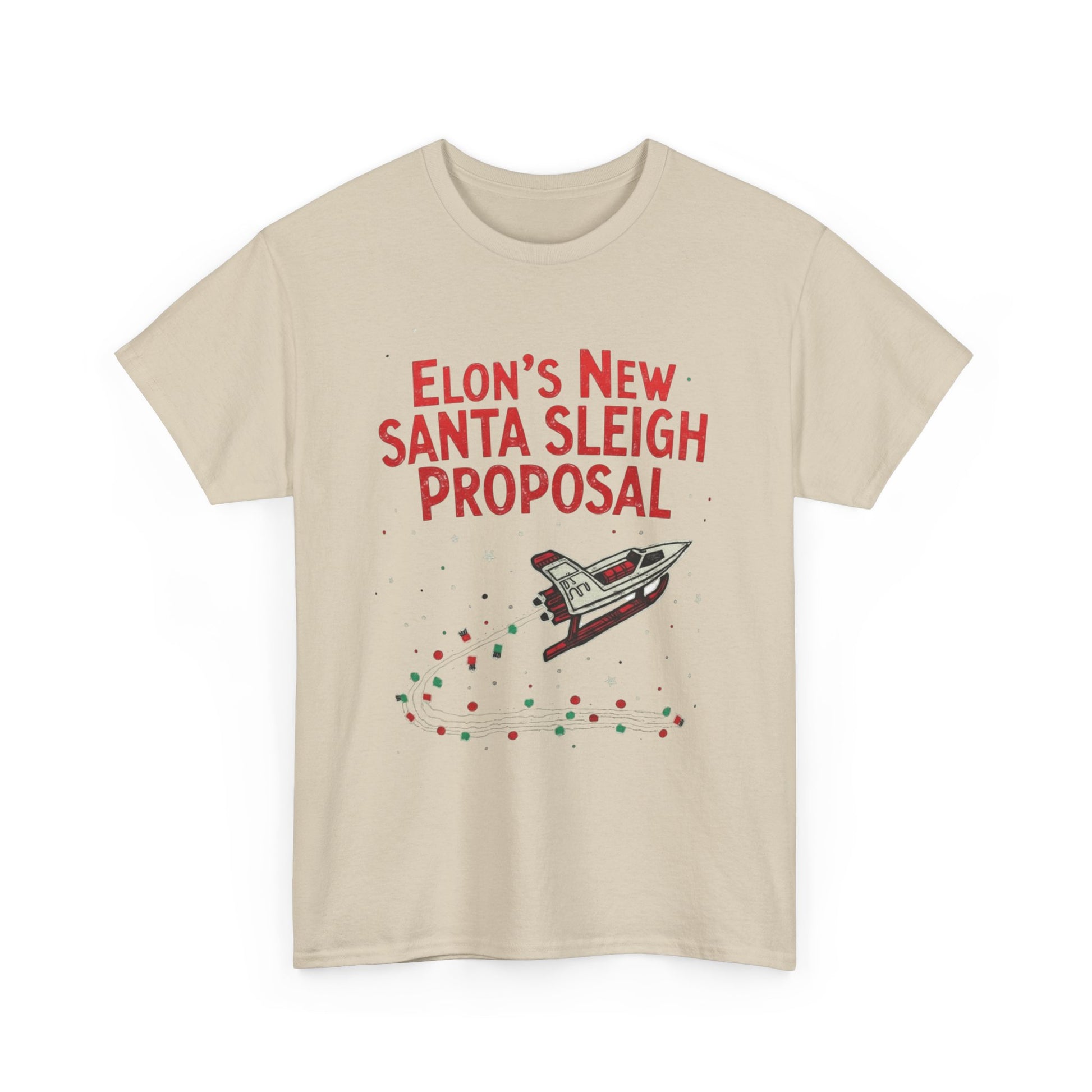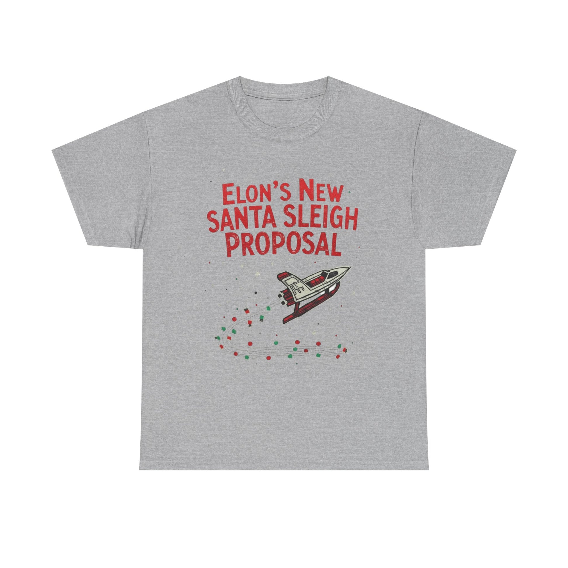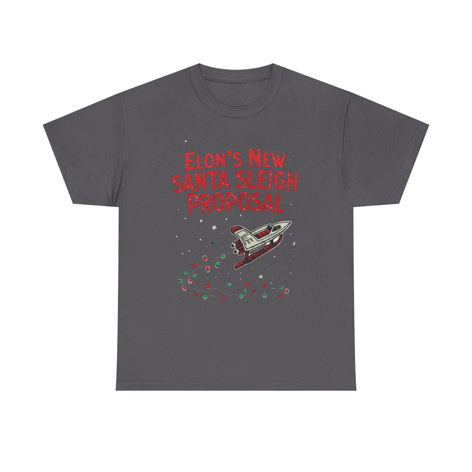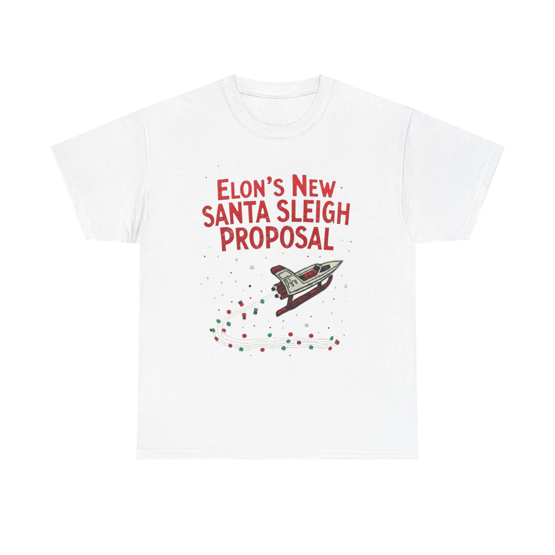 This soft, mid-weight tee carries a playful holiday graphic that swaps reindeer for rockets: a retro-style spacecraft pulls a light-trimmed sleigh across a starlit sky under the headline “Elon’s New Santa Sleigh Proposal.” It’s casual, comfortable, and made to be worn during laugh-filled gatherings — whether you’re trimming the tree, heading to a quirky office party, or handing out cookies to neighborhood trick-or-treaters. The relaxed crew neckline and classic fit layer easily under jackets or over flannel, while the durable cotton fabric keeps the print crisp wash after wash. Wear it when you want a bit of cheeky, science-meets-holiday humor that sparks conversation and smiles.