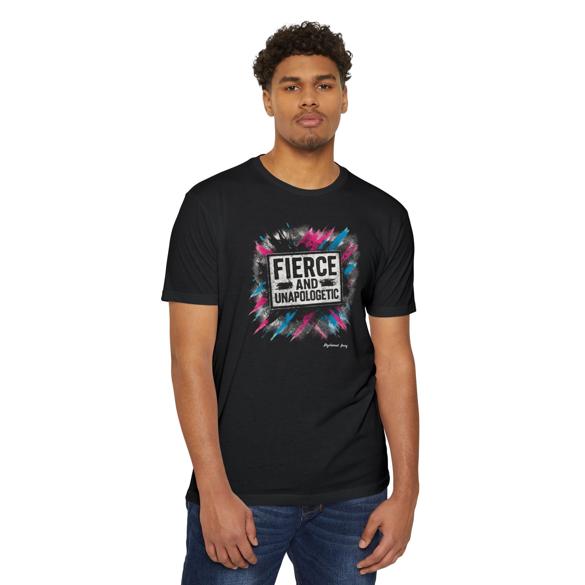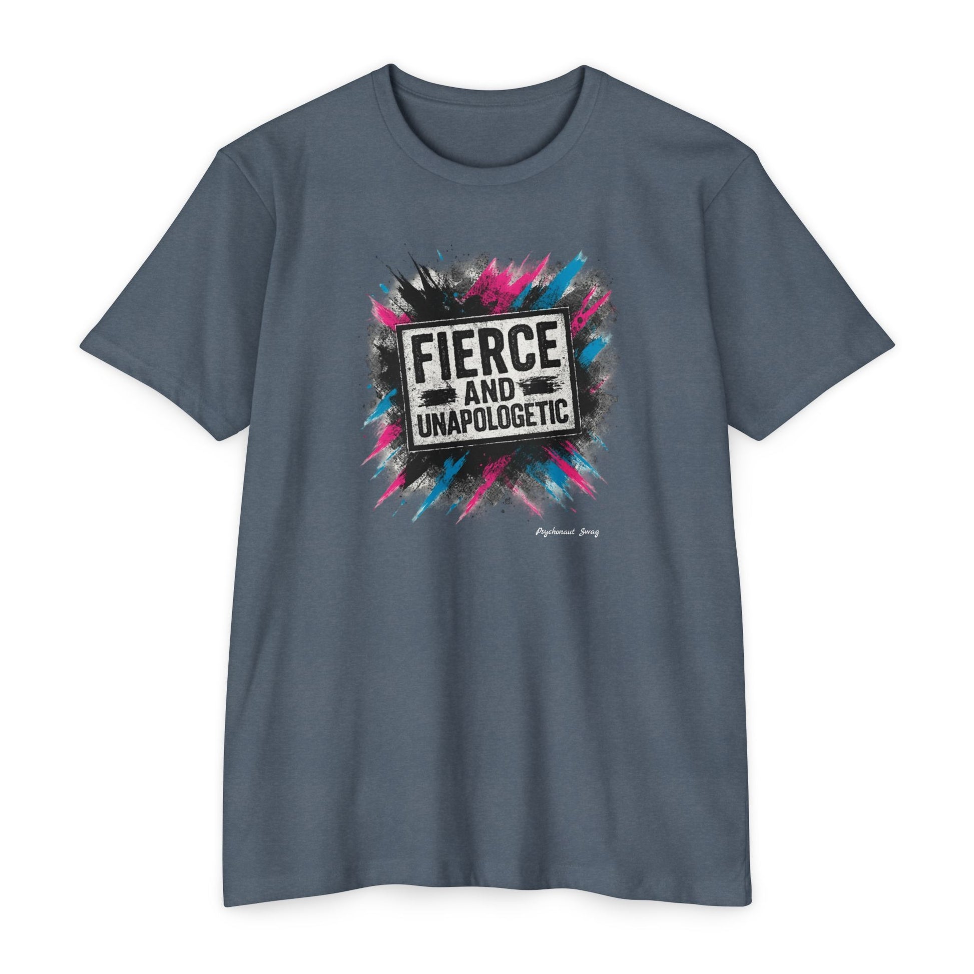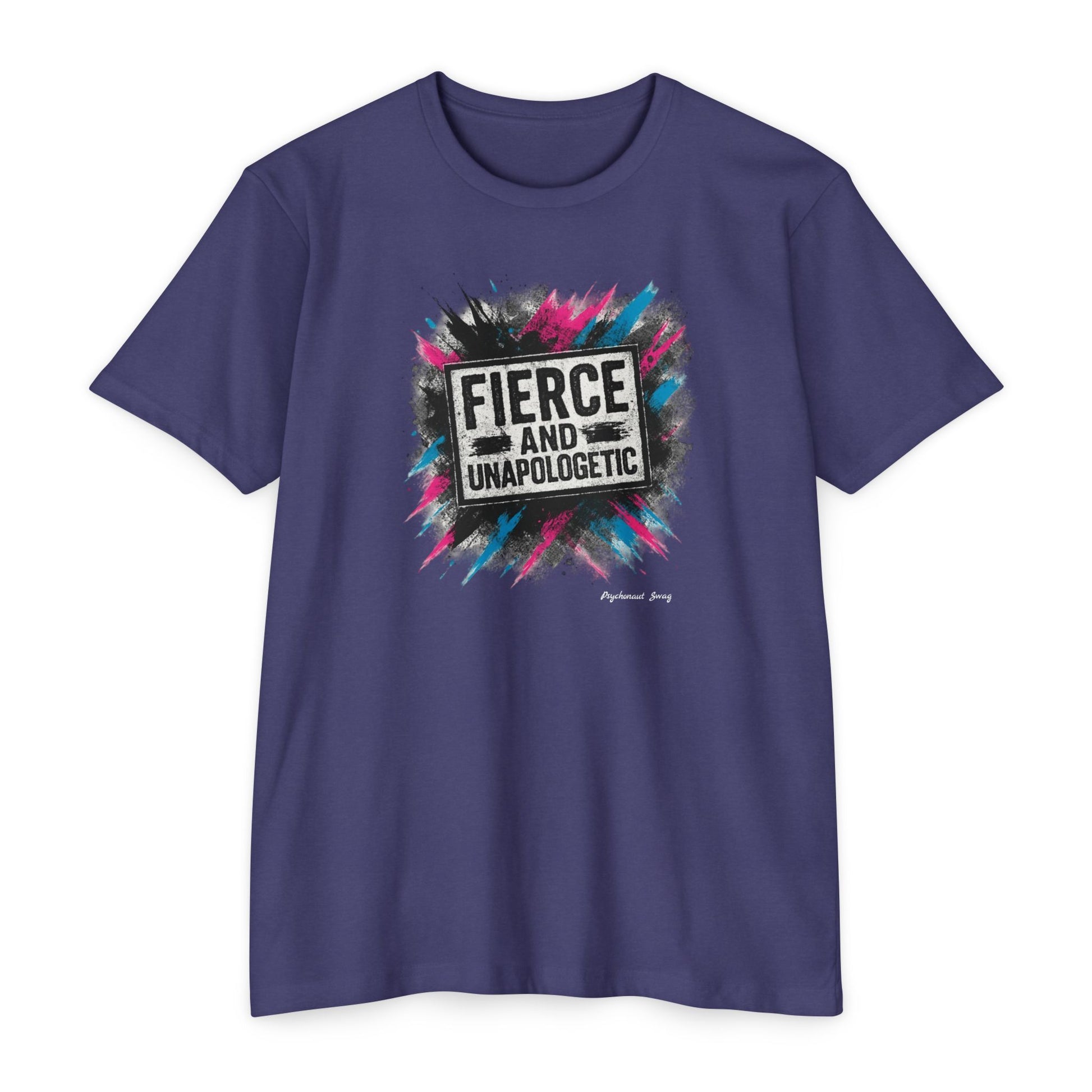 Lightweight and confidently bold — this tee carries a burst of color and attitude right across the chest. The graphic reads “FIERCE AND UNAPOLOGETIC” set against energetic paint splatters in magenta, teal and charcoal, giving the shirt an urban, street-art edge. Wear it when you want your mood to be loud without saying much: layered under a denim jacket for a weekend meetup, thrown on before a protest or march, or paired with high-waisted jeans for a night out where you want to stand your ground. The fabric feels soft against the skin and drapes with an easy, classic silhouette so the message stays the focus. This is for people who show up bold, speak frankly, and prefer clothing that matches their stance.