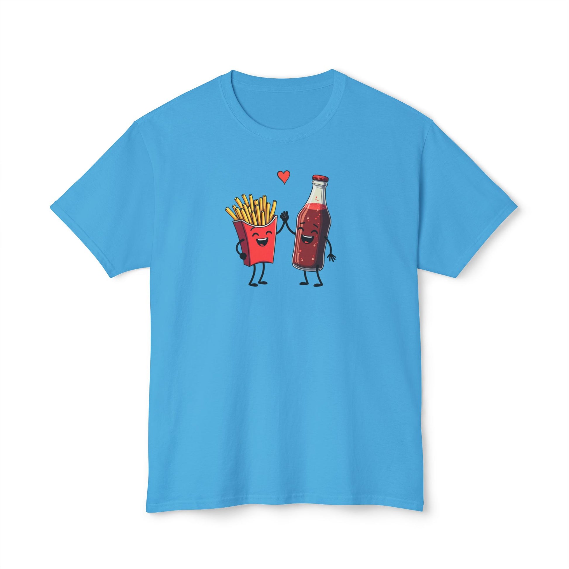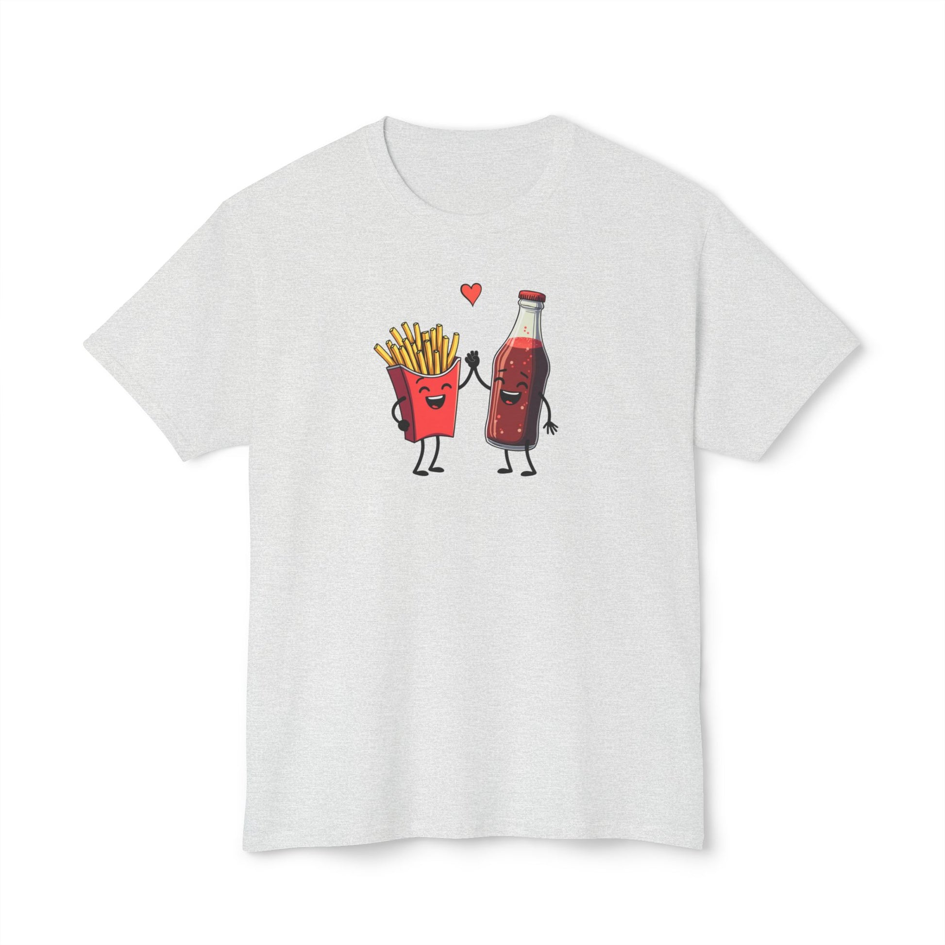 This light, classic-fit tee carries a tiny scene that makes people smile: a cheerful carton of fries and a blushing soda bottle holding hands beneath a small heart. The illustration sits centered on a soft natural fabric, giving the design a friendly, hand-drawn charm that reads playful and low-key. Wear it on casual days when you want to spark a laugh, start conversations, or lean into a relaxed, food-loving vibe. The breathable, preshrunk cotton keeps the shirt feeling easy and familiar after every wash, while subtle details — like a ribbed collar and reinforced shoulder tape — help it keep its shape through repeat wears. It’s a comfortable staple that fits into everyday life: quick coffee runs, laid-back meetups, casual date nights, or lazy weekends in the kitchen experimenting with new fries-and-sauce combos.