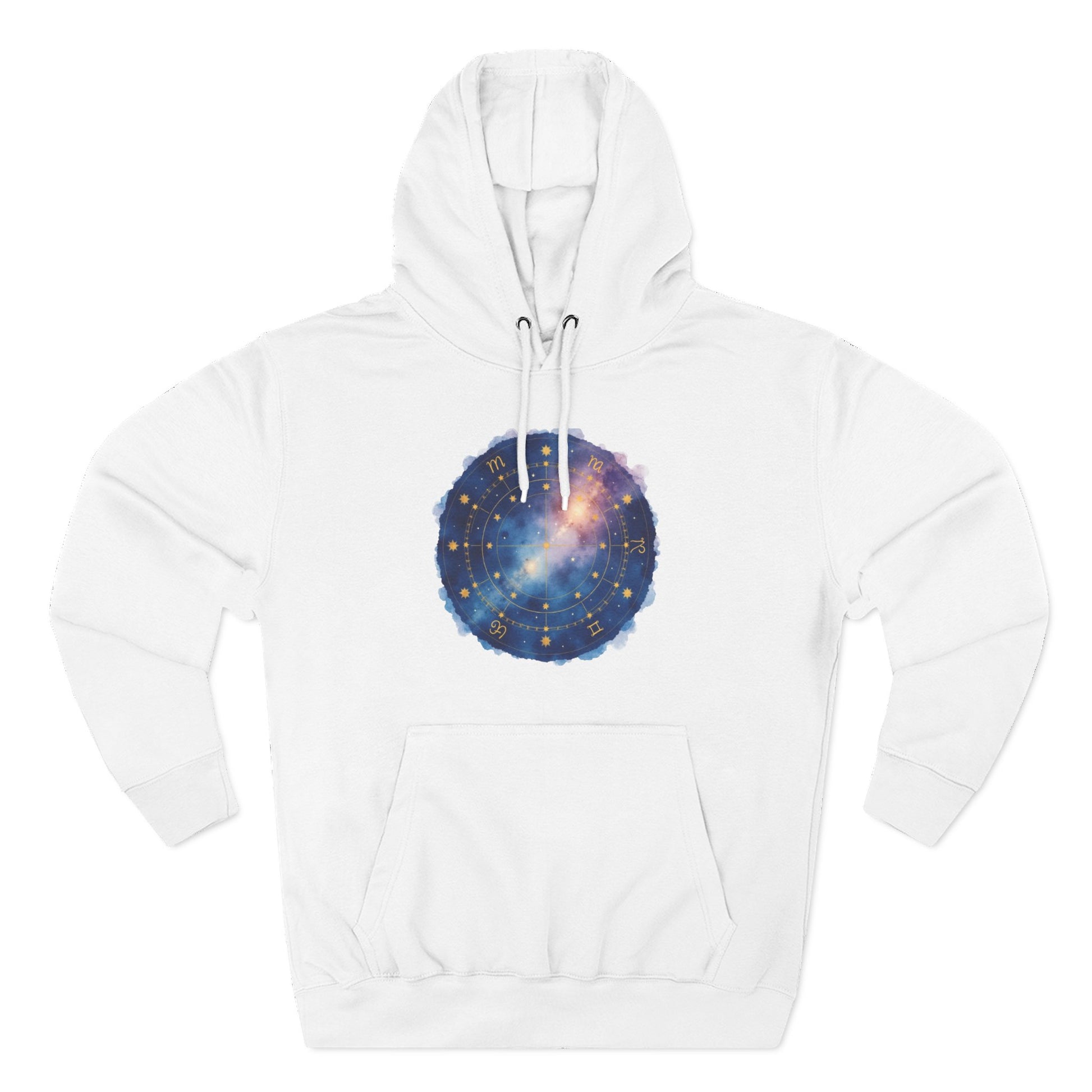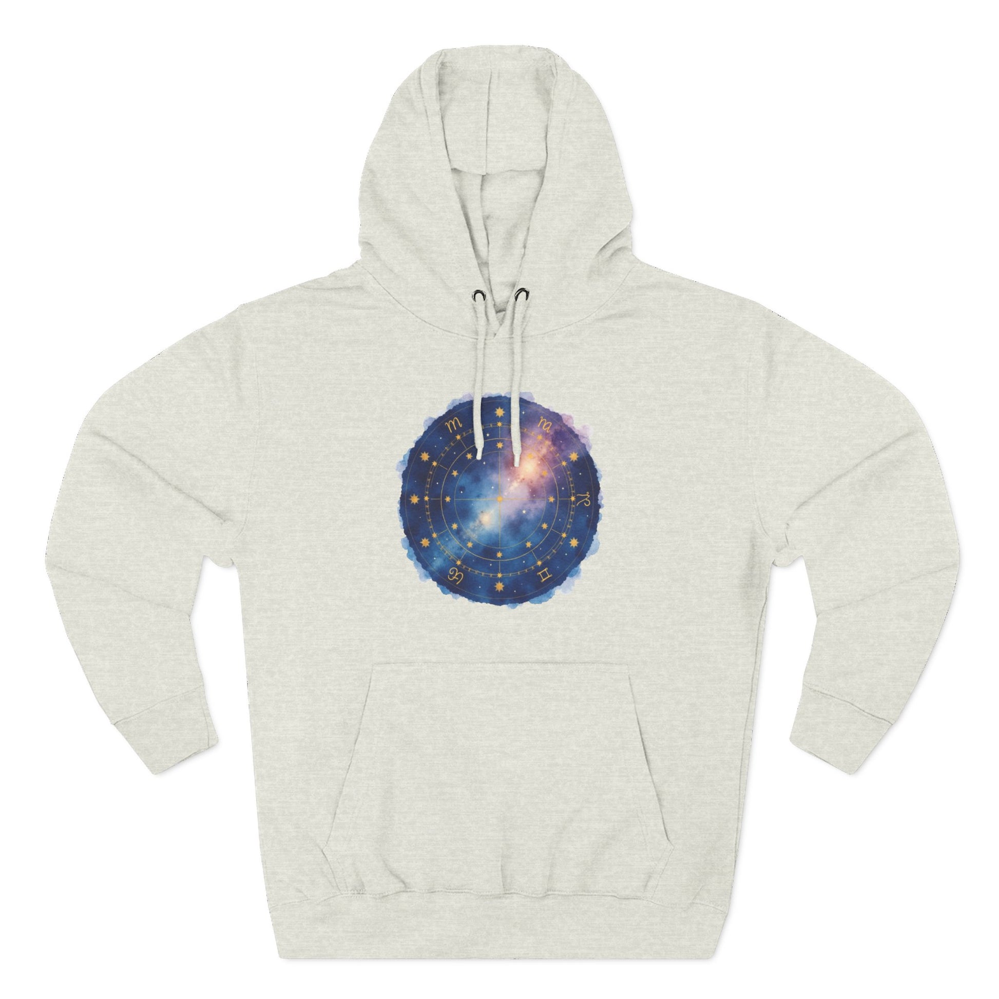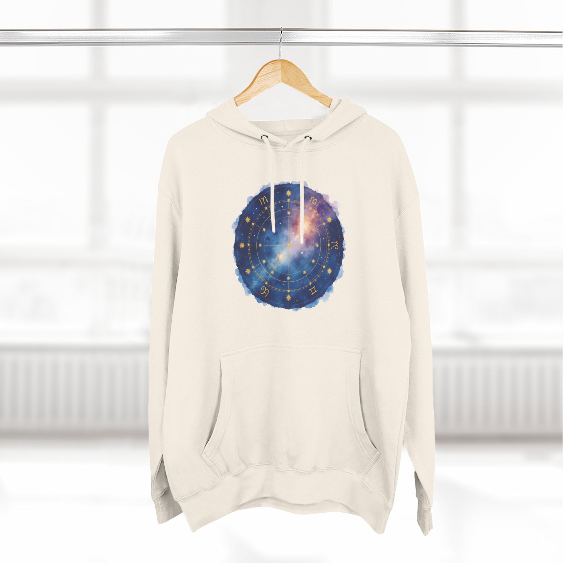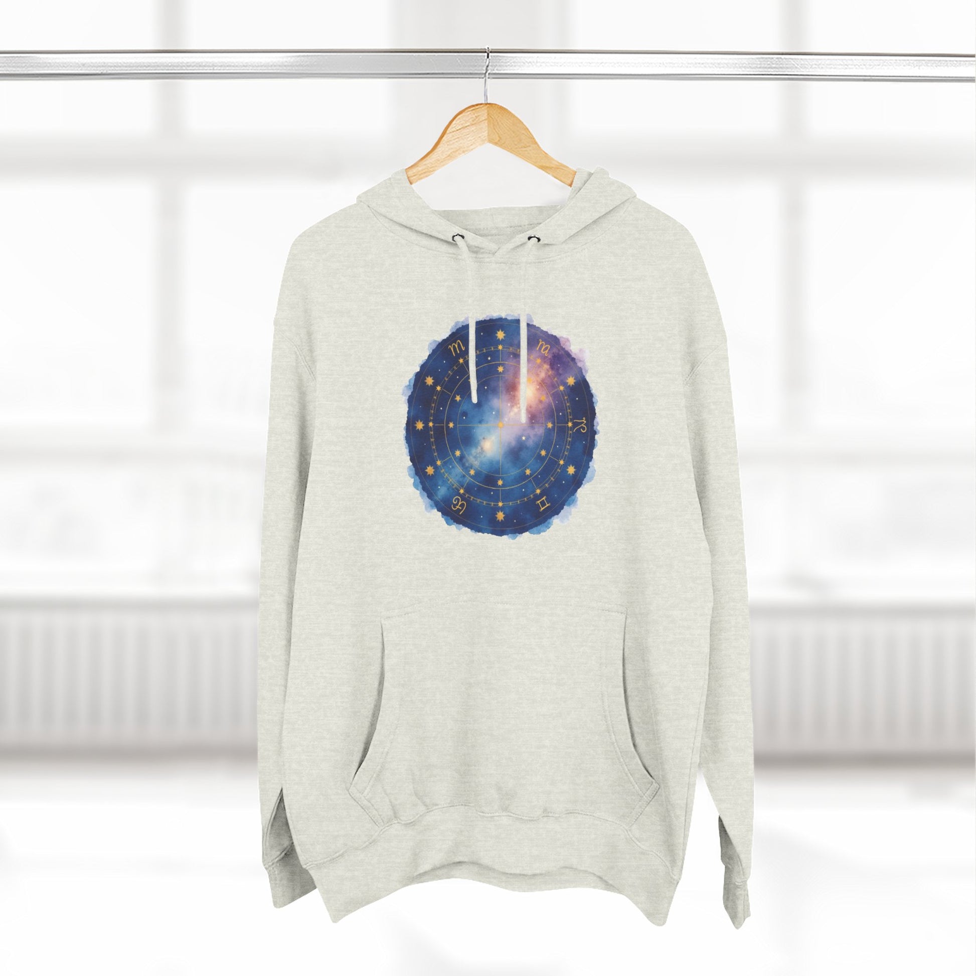 A cozy, medium-weight hoodie embroidered with a three-panel hood and a dreamy celestial motif over the chest. The soft ring-spun cotton blend gives it a luxe hand-feel while the structured twill neck tape and double-needle topstitching keep the fit steady through wear. The roomy kangaroo pocket and adjustable drawstring hood make this hoodie an everyday layer for late-night stargazing, chilly commutes, or slow coffee mornings. Subtle embroidery adds tactile depth to the watercolor-like galaxy, so the design feels handmade and personal rather than flat. It washes well with under 5% shrinkage and runs true to size for reliable, fuss-free wear.