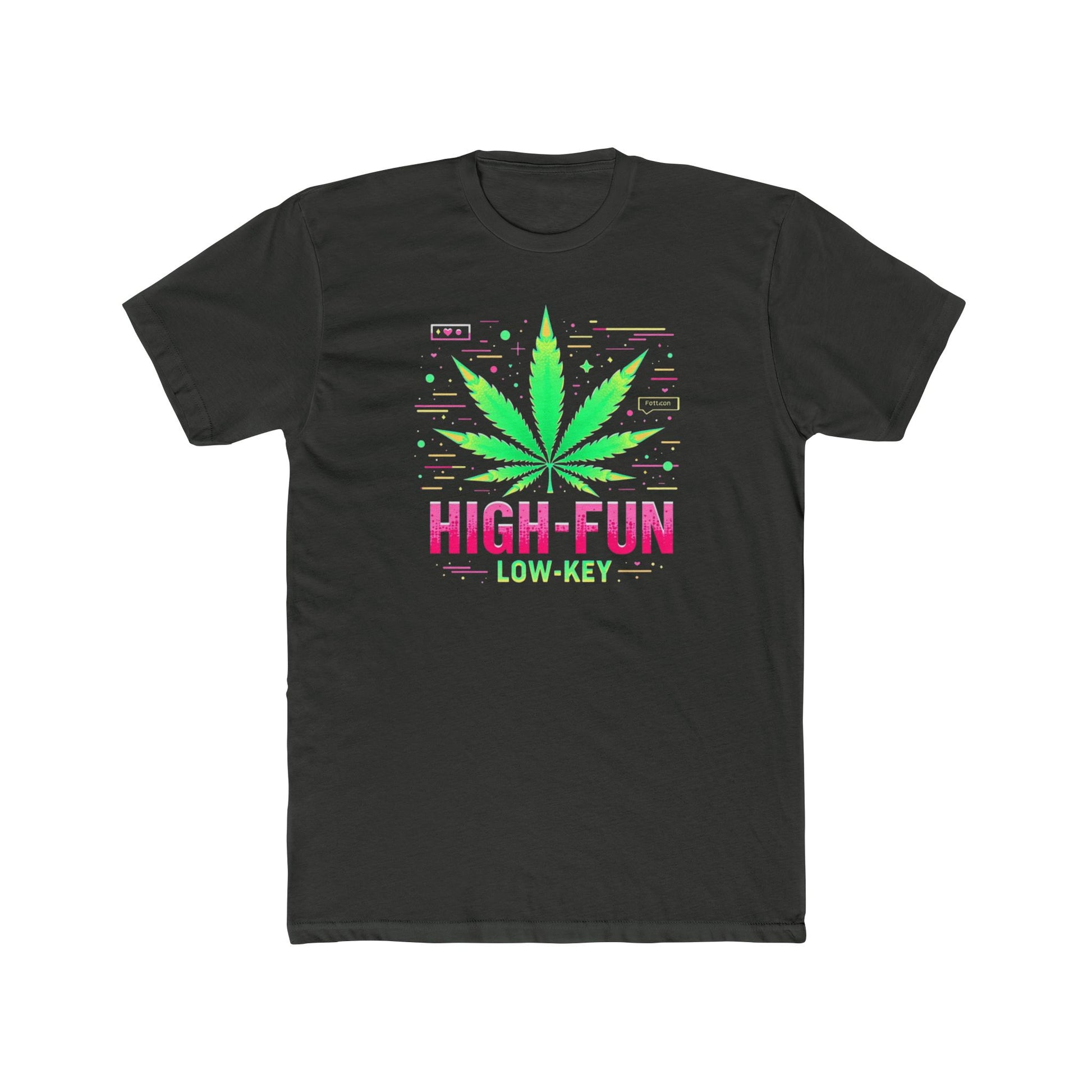 A lightweight cotton crew tee with a retro neon design that vibes with relaxed evenings and laid-back weekends. The bold leaf graphic and playful “HIGH-FUN • LOW-KEY” text read like an inside joke among friends, bringing a wink of nostalgia from old-school arcade palettes. Wear it to low-lit gatherings, record-store hunts, or lazy mornings with coffee — it settles into everyday life without shouting. The soft, classic fit sits comfortably under a denim jacket or over lounge shorts, making it easy to layer or wear alone. Breathable fabric and careful construction mean the tee keeps its shape and color through repeated wear, keeping that casual, lived-in look that feels personal and familiar.