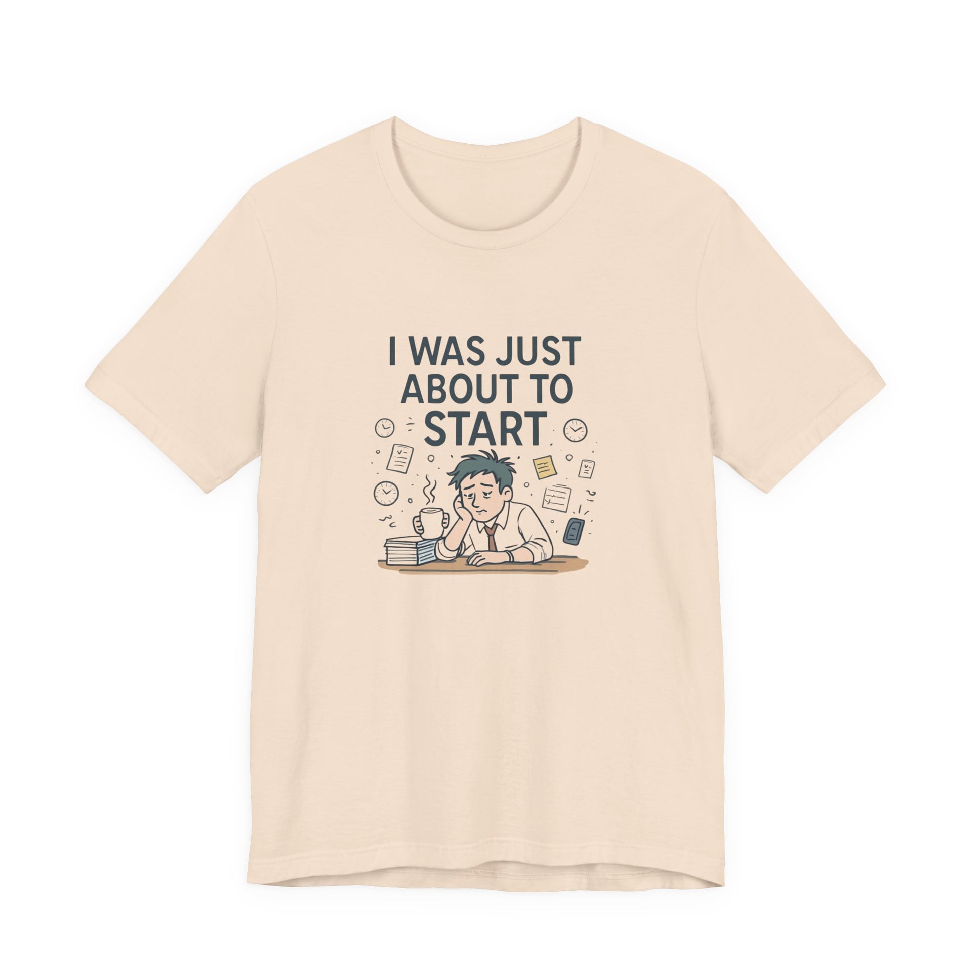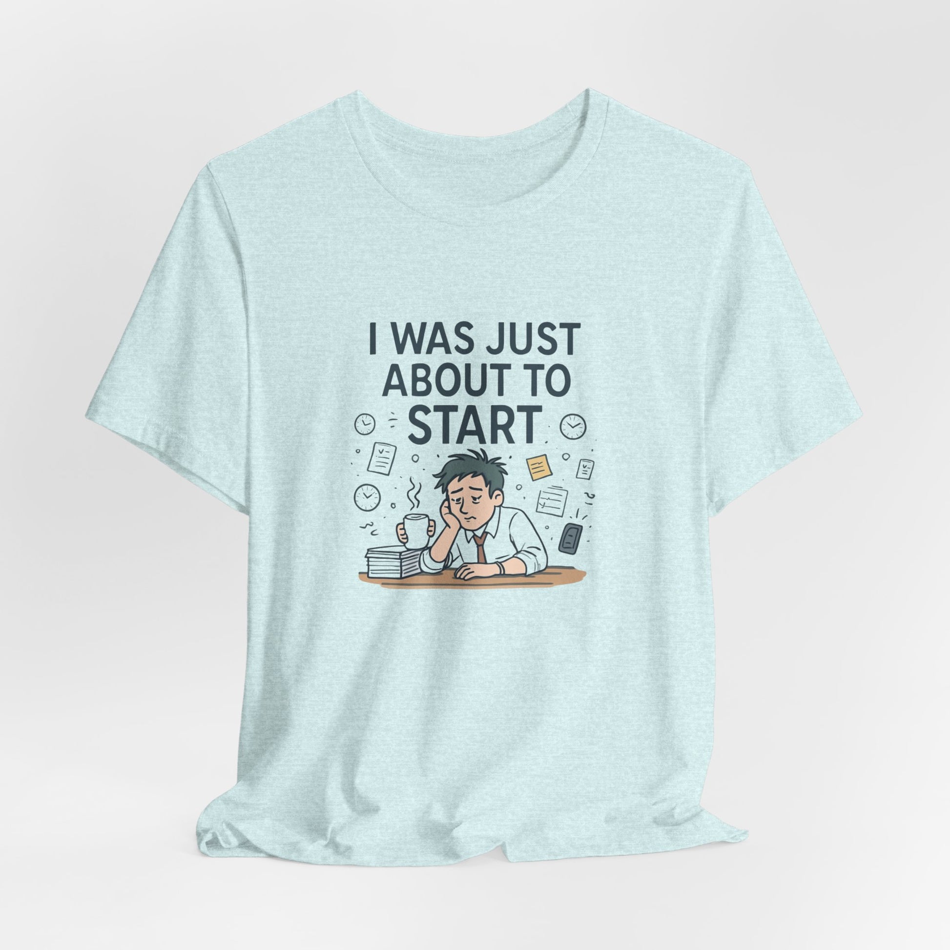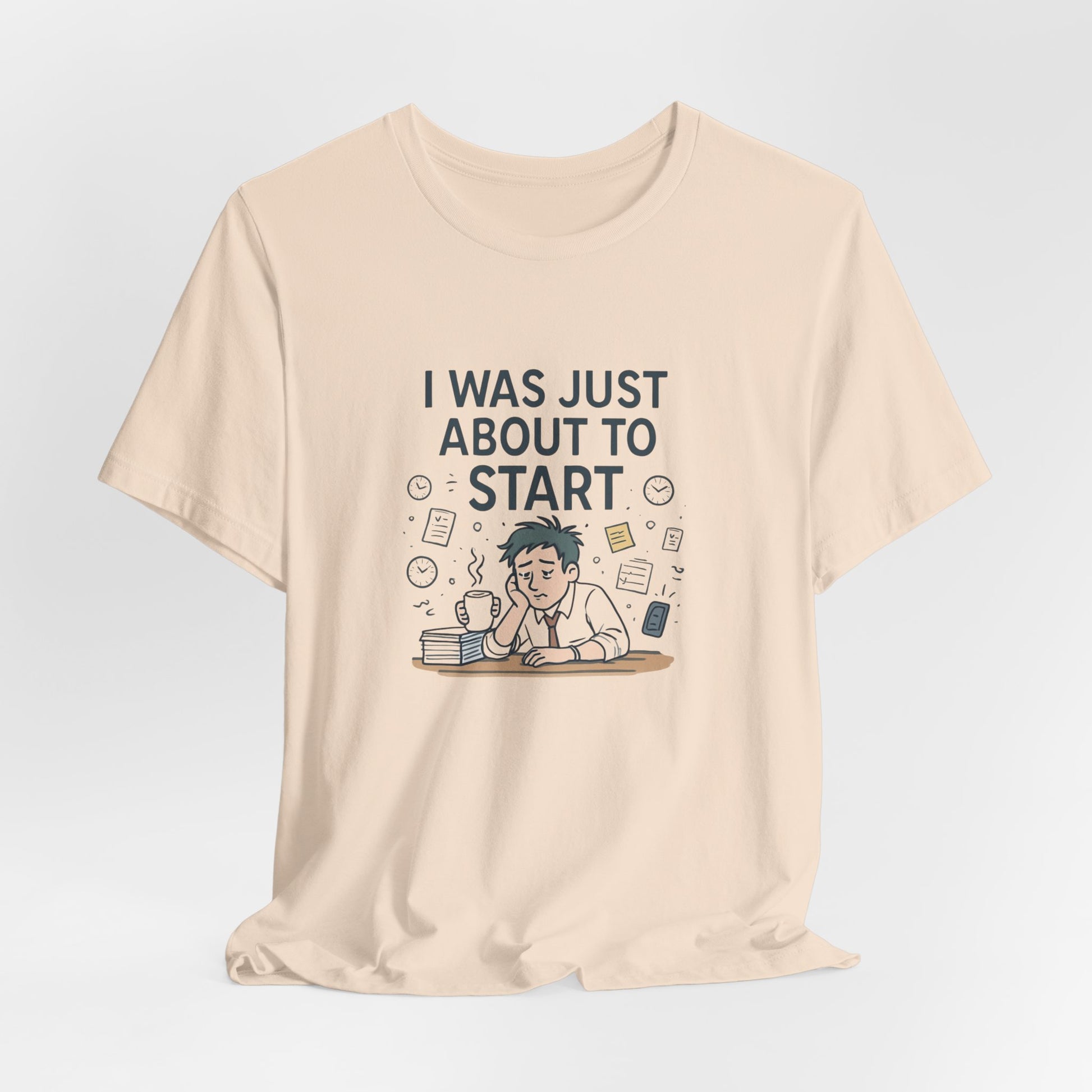 I Was Just About to Start T-Shirt — Funny Procrastination Graphic Tee for Students & Office Workers