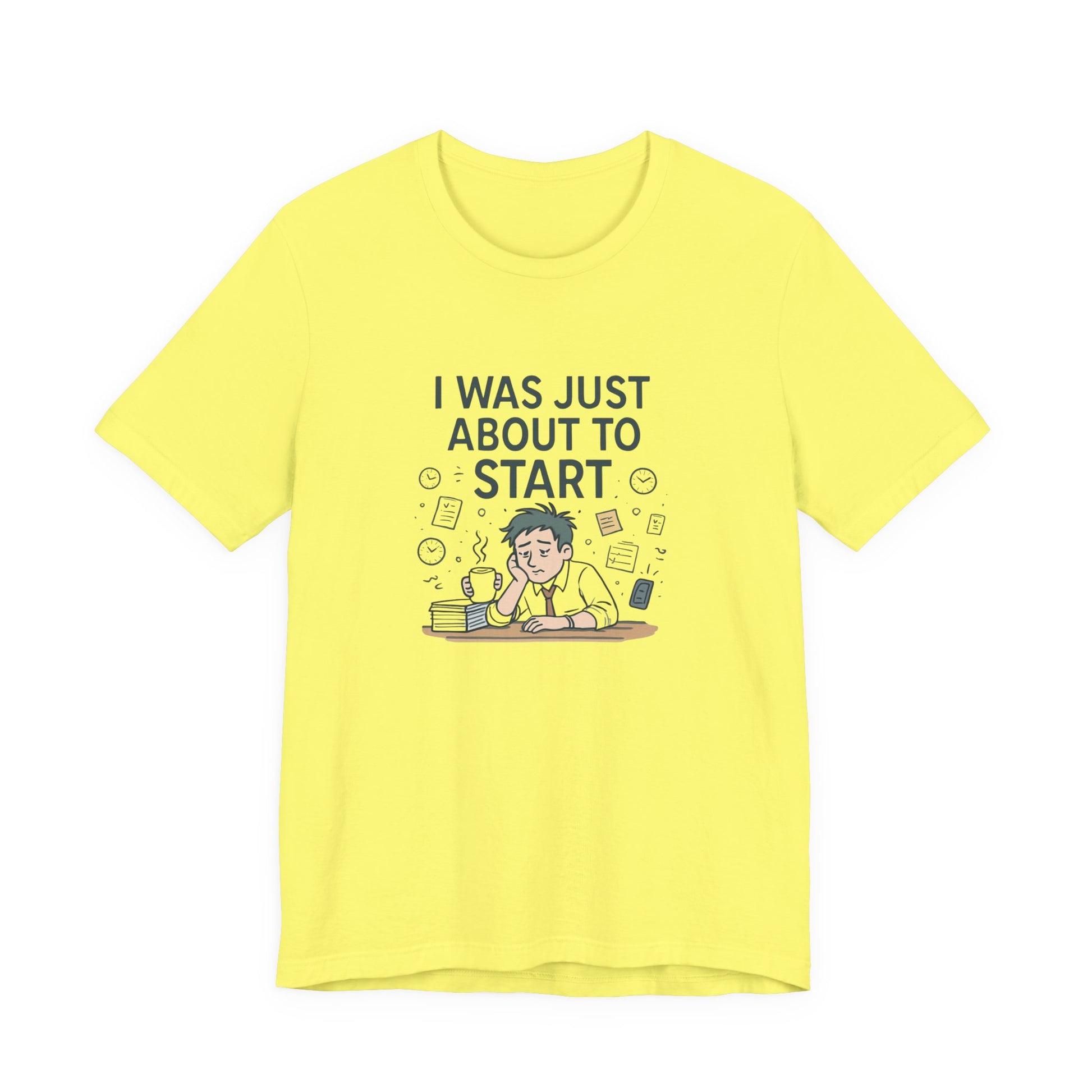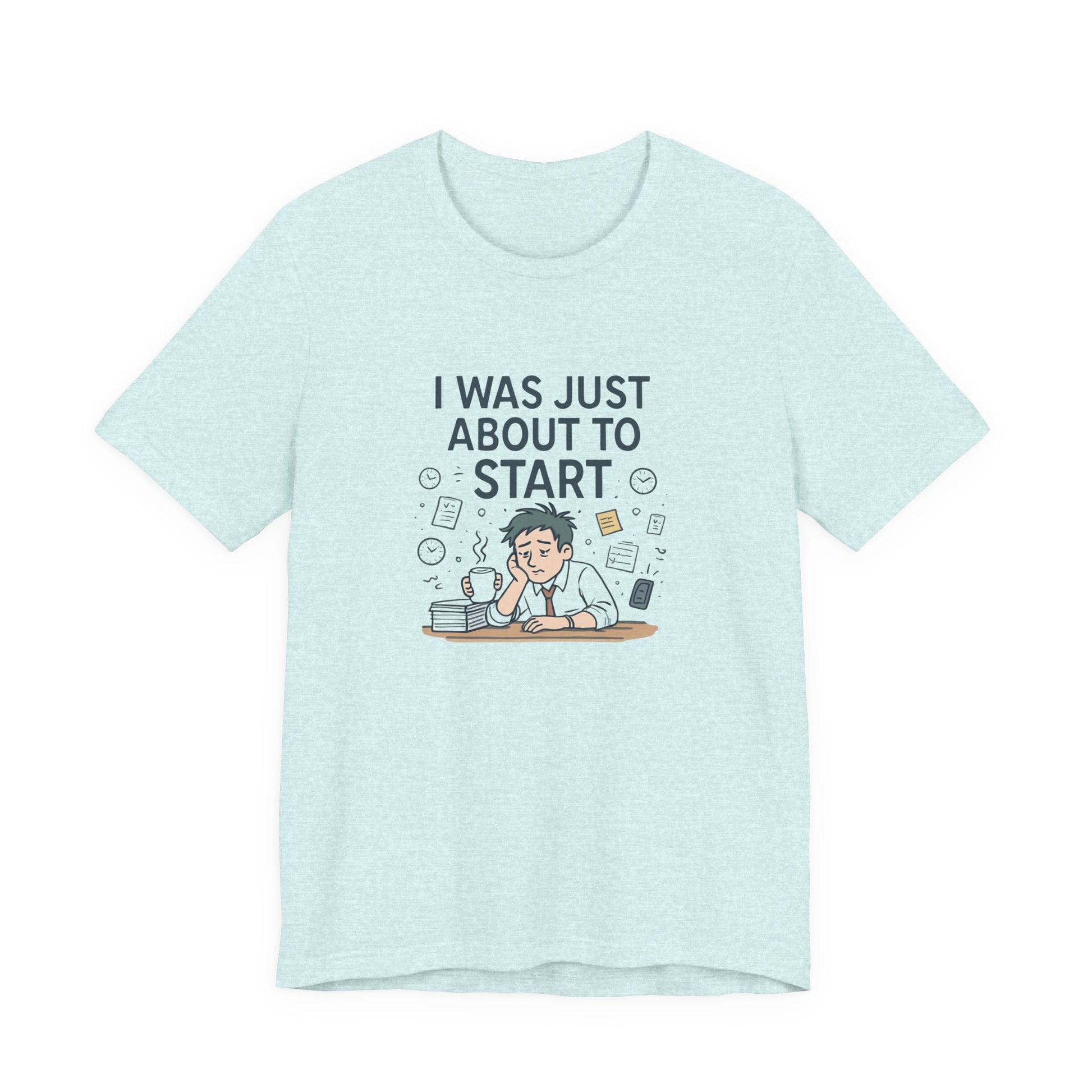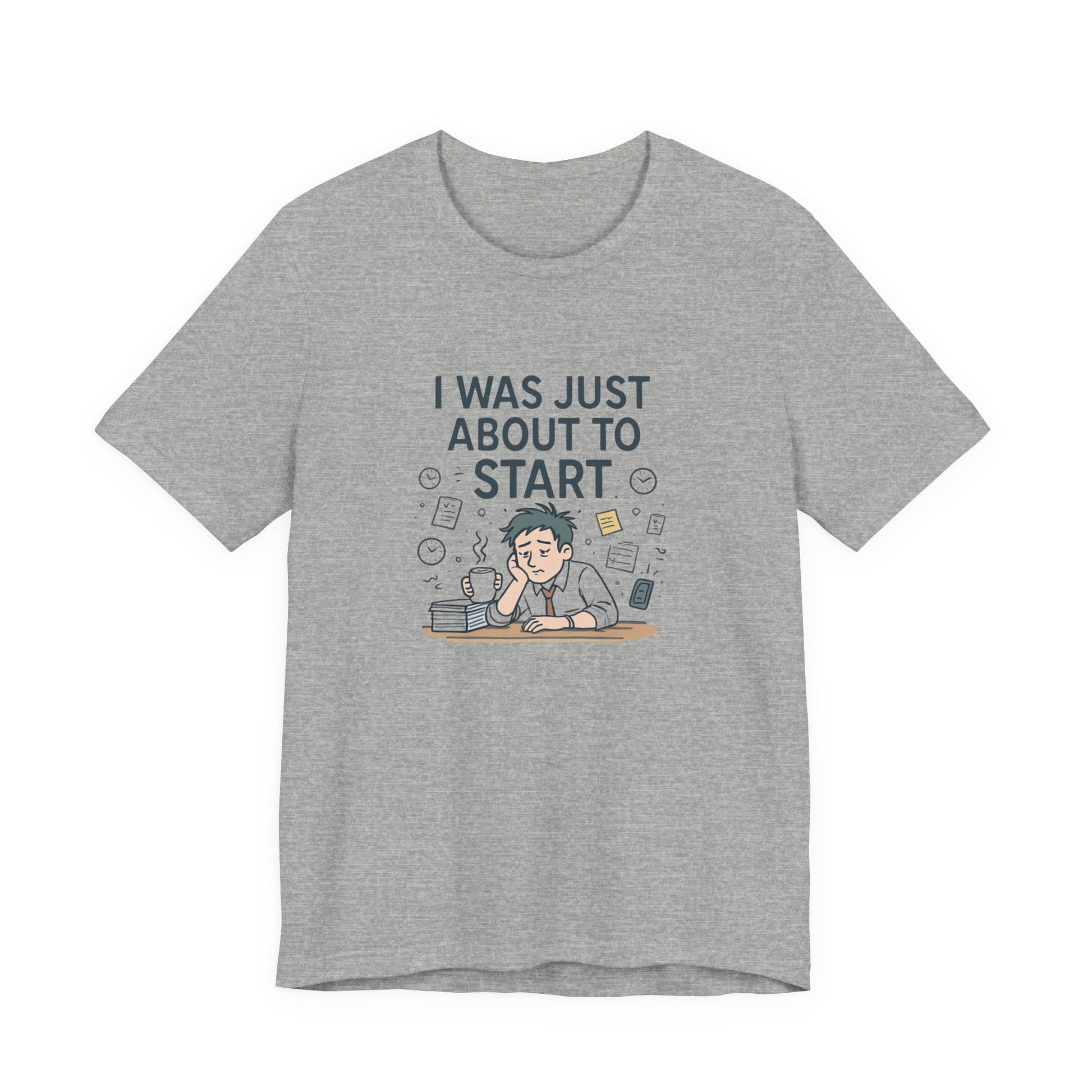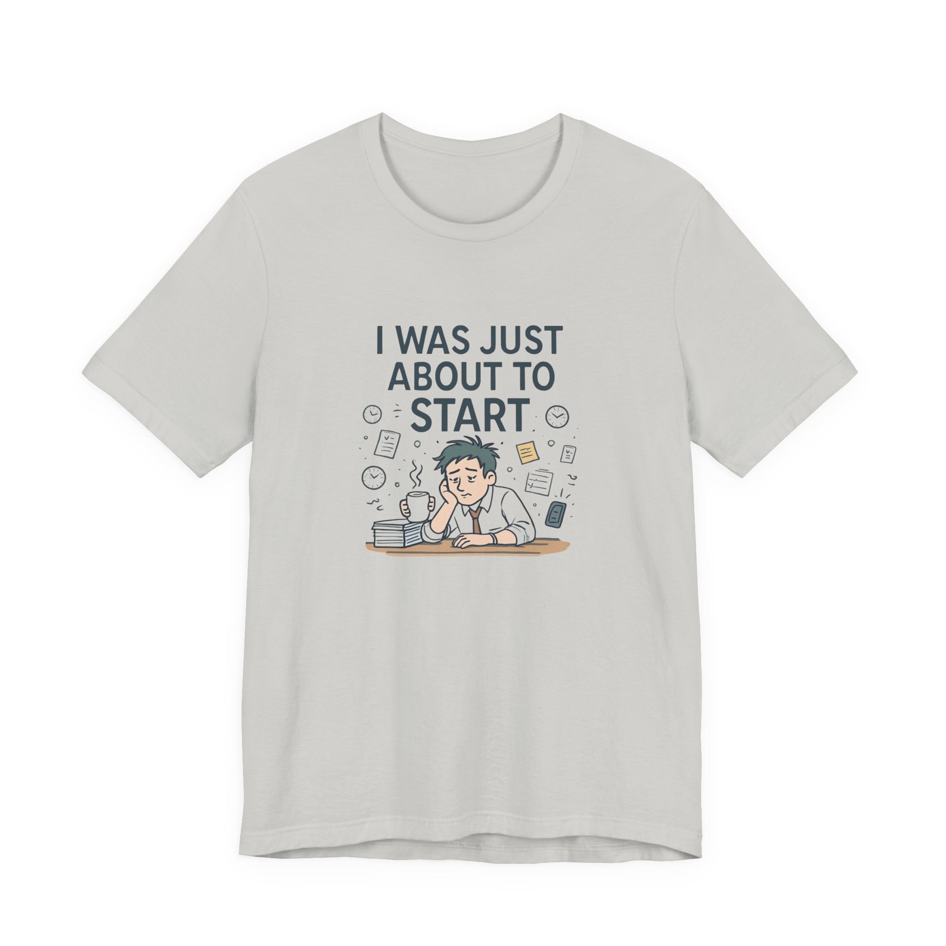 I Was Just About to Start T-Shirt — Funny Procrastination Graphic Tee for Students & Office Workers