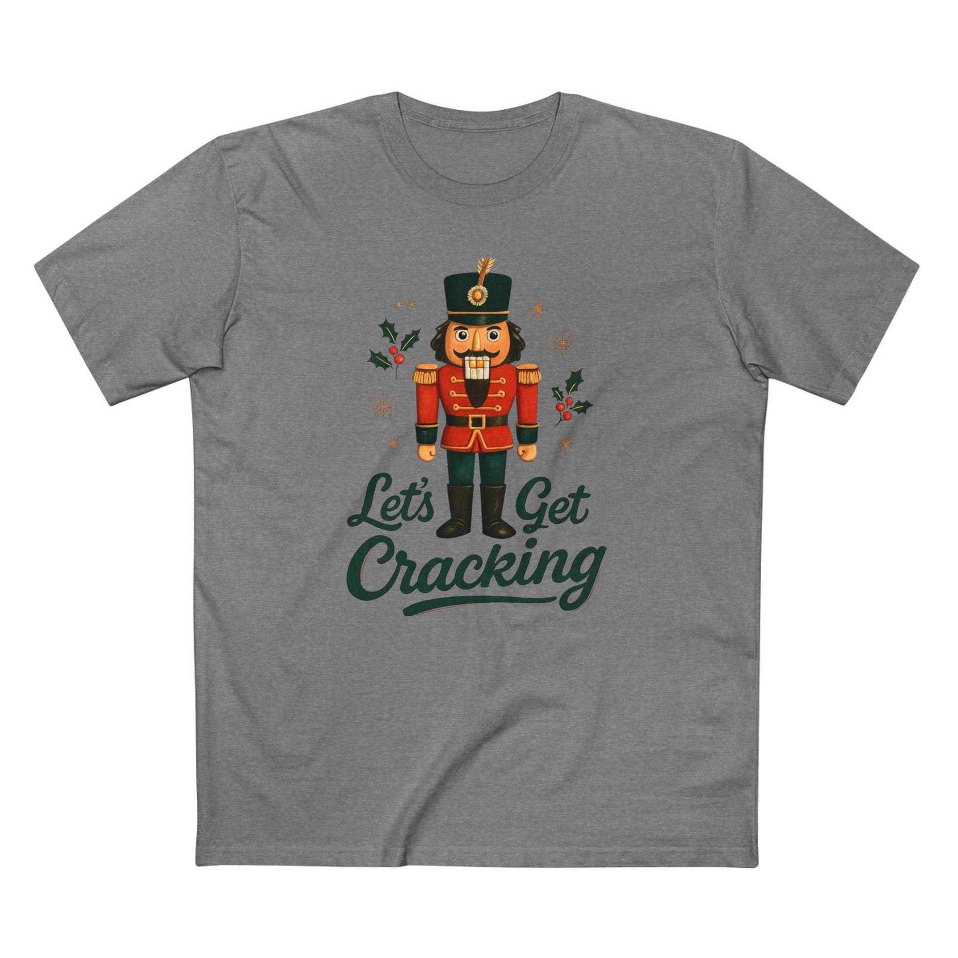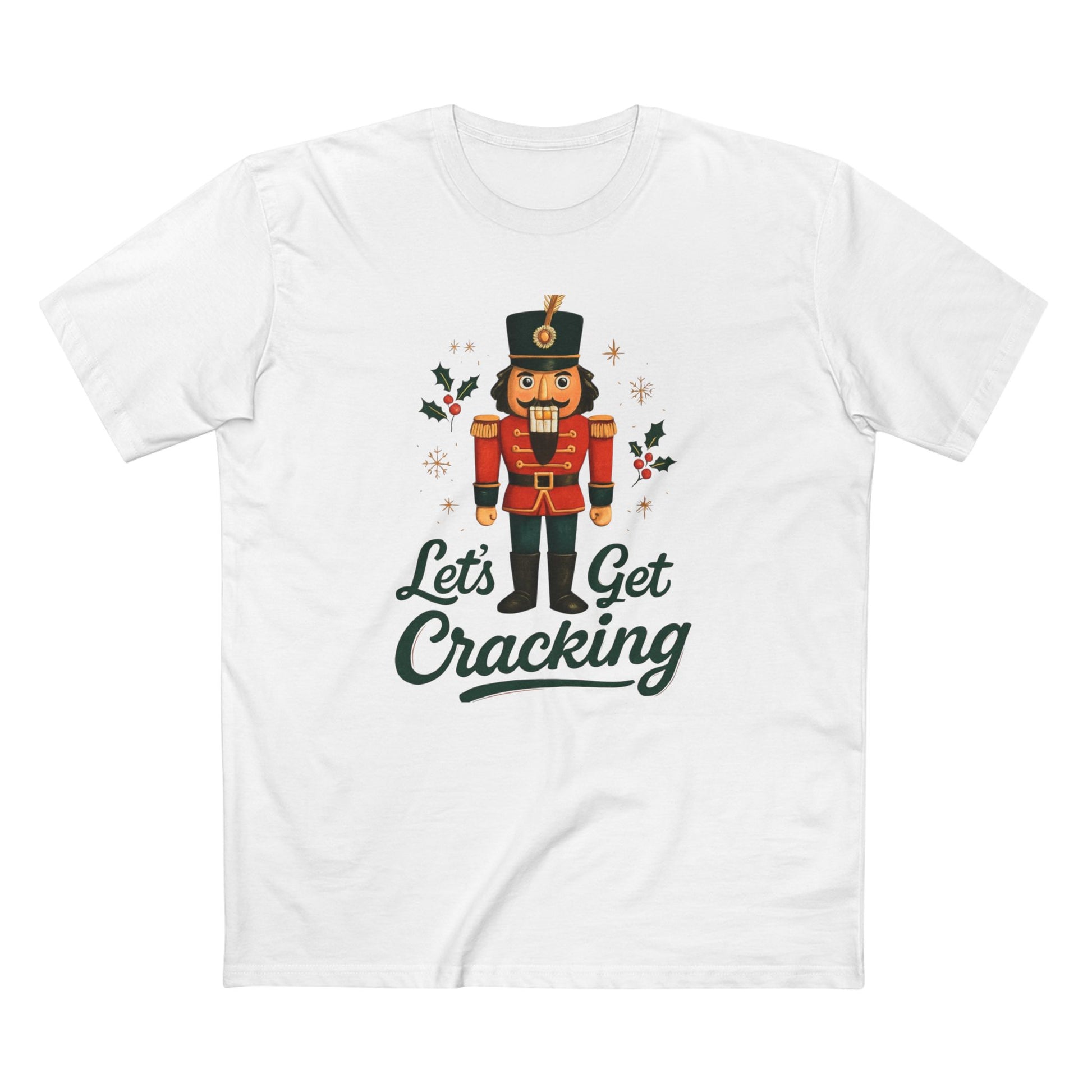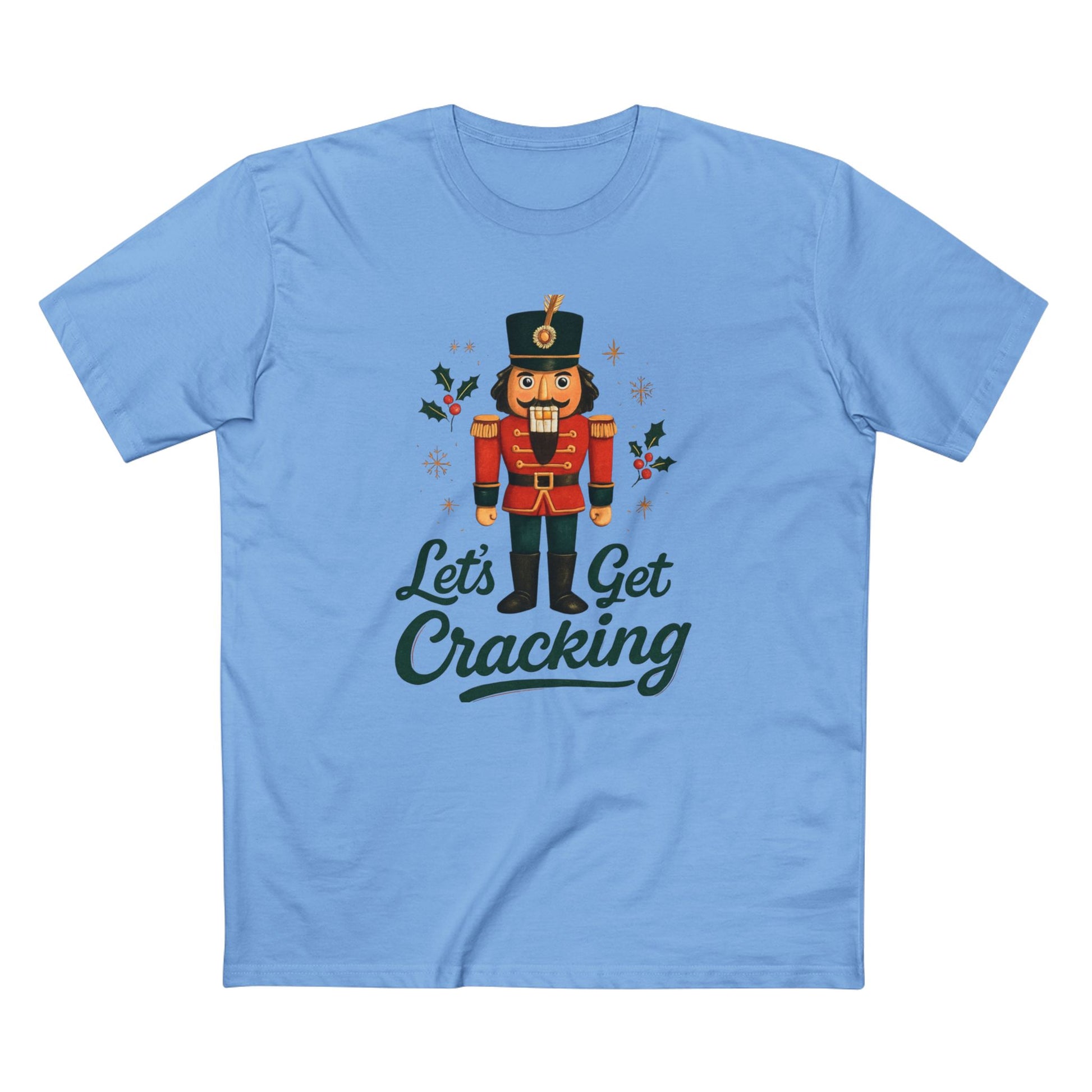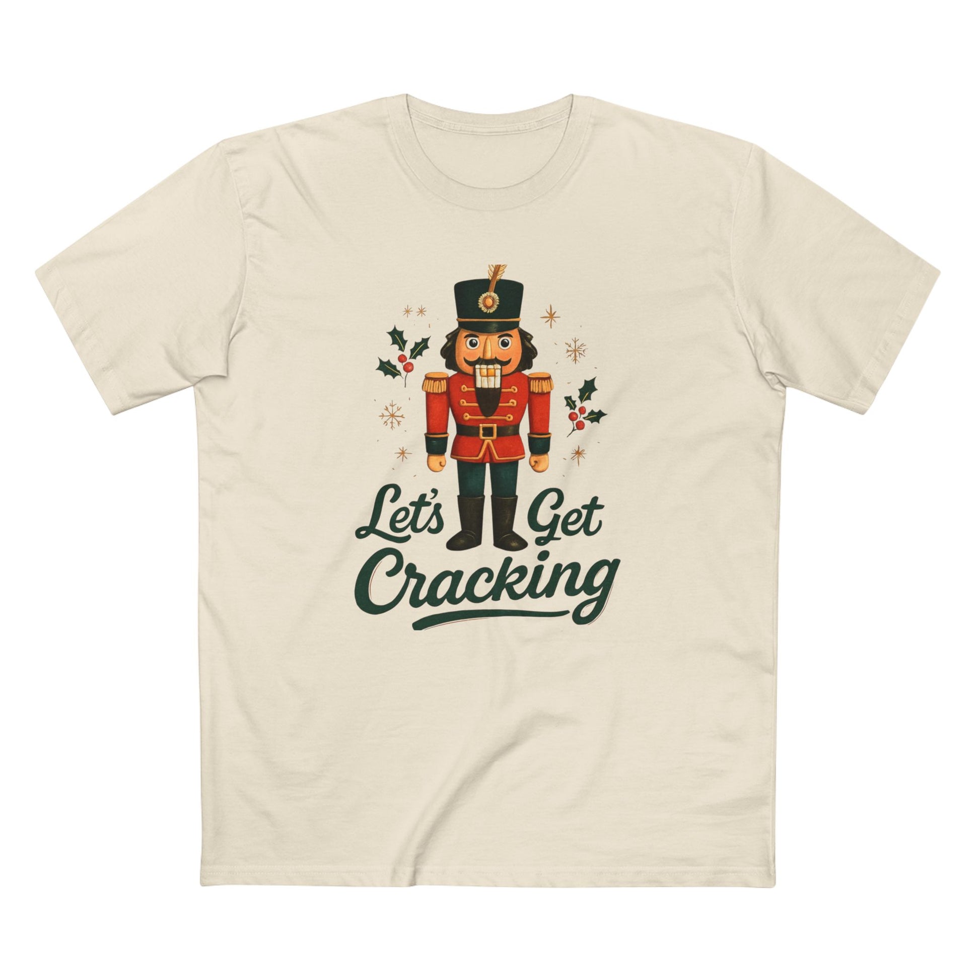 This soft, mid-weight tee brings playful holiday cheer with a vintage nutcracker illustration and the cheeky line “Let’s Get Cracking.” The comfortable, regular-fit silhouette sits true to size and keeps its shape thanks to side seams and neck-and-shoulder twill tape. Ribbed knit at the collar adds stretch and recovery, while the tear-away label and DTF inner neck print make it comfortable against skin. Wear it to cozy gatherings, tree-trimming nights, or relaxed holiday parties — it feels lived-in from the first wear and becomes a go-to for seasonal fun.