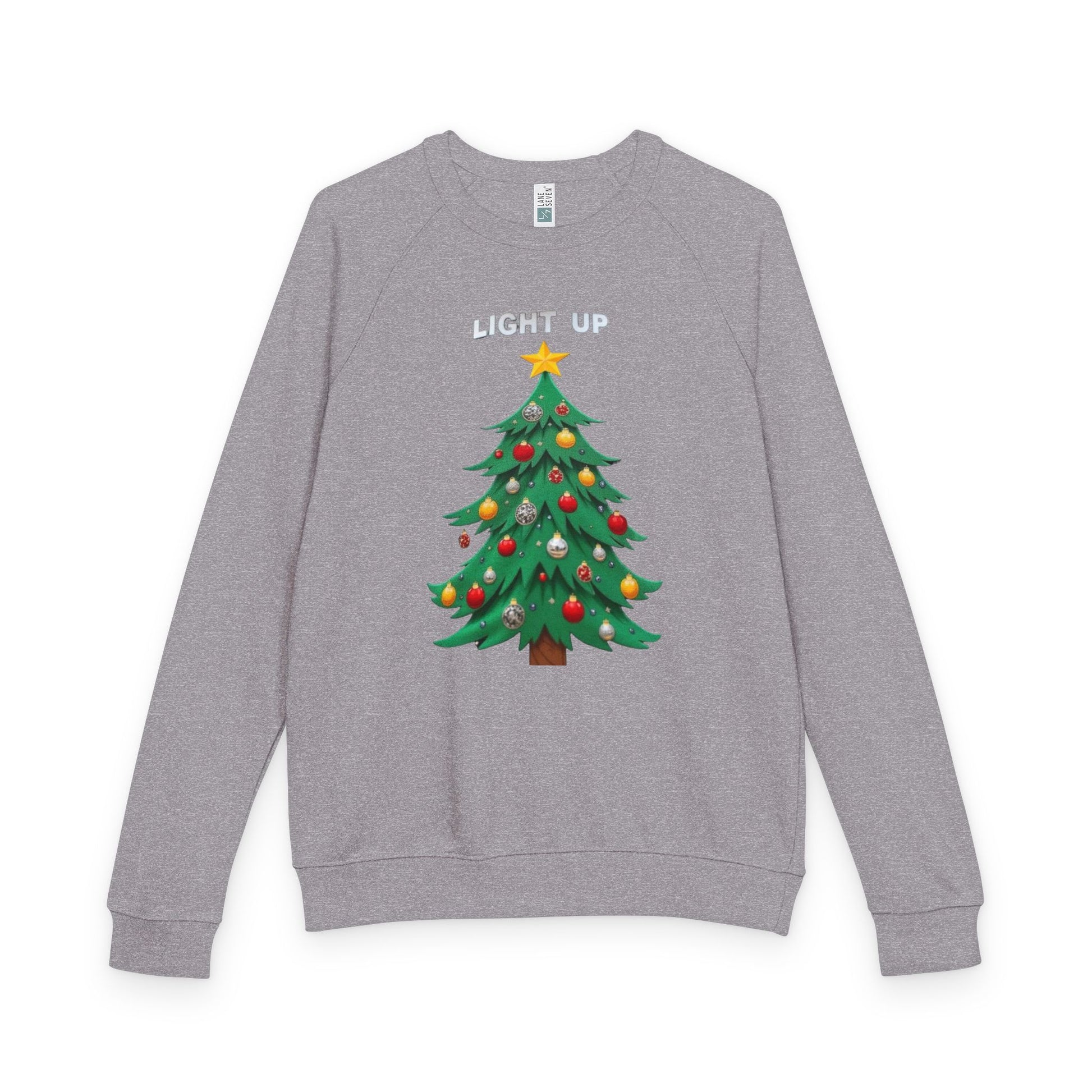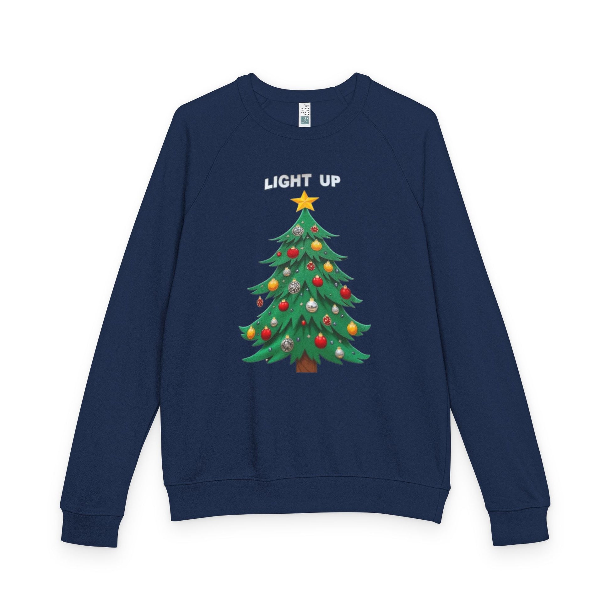 This cozy raglan crewneck brings a soft, lived-in feel to quiet winter evenings. The vintage-style holiday tree print reads “LIGHT UP” above glowing ornaments, creating a gentle, nostalgic spark that suits slow nights by the window or low-key seasonal gatherings. The relaxed raglan cut and medium-weight French terry drape comfortably over layers, while ribbed cuffs and waistband keep warmth where you want it. Wear it with jeans, leggings, or pajama bottoms — it settles into the background of the day while adding a subtle, joyful nod to the season.