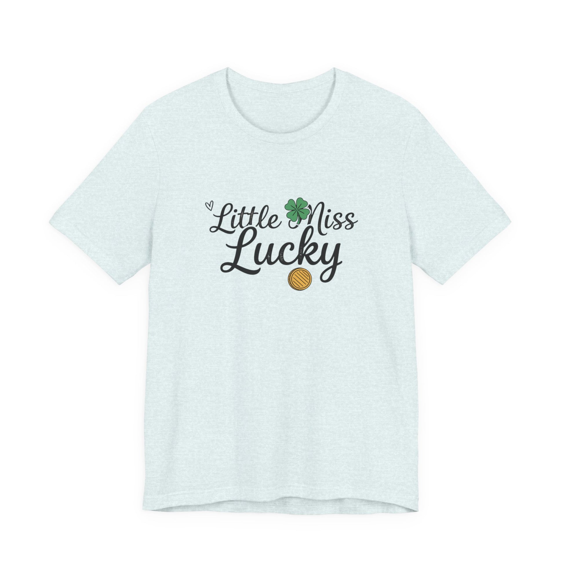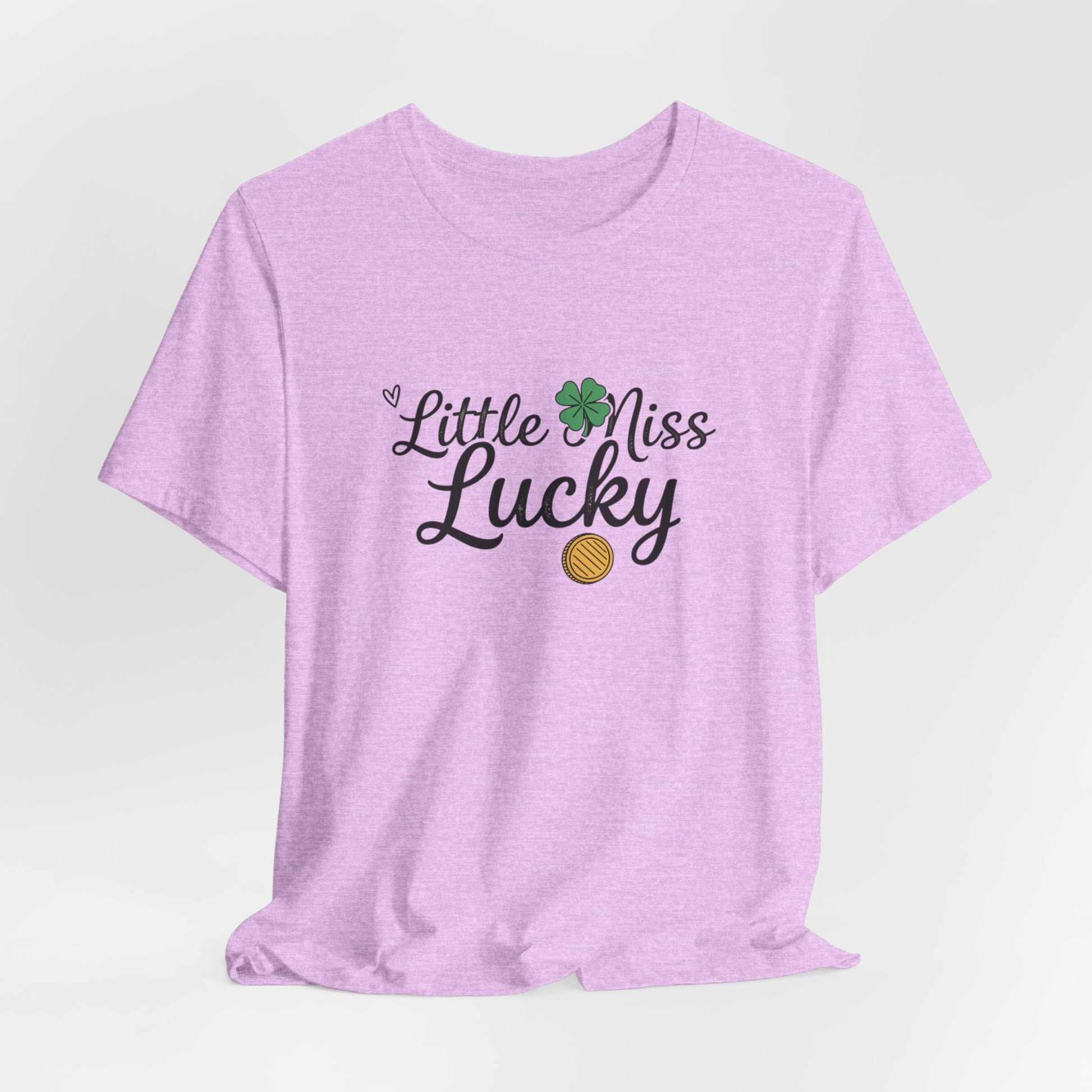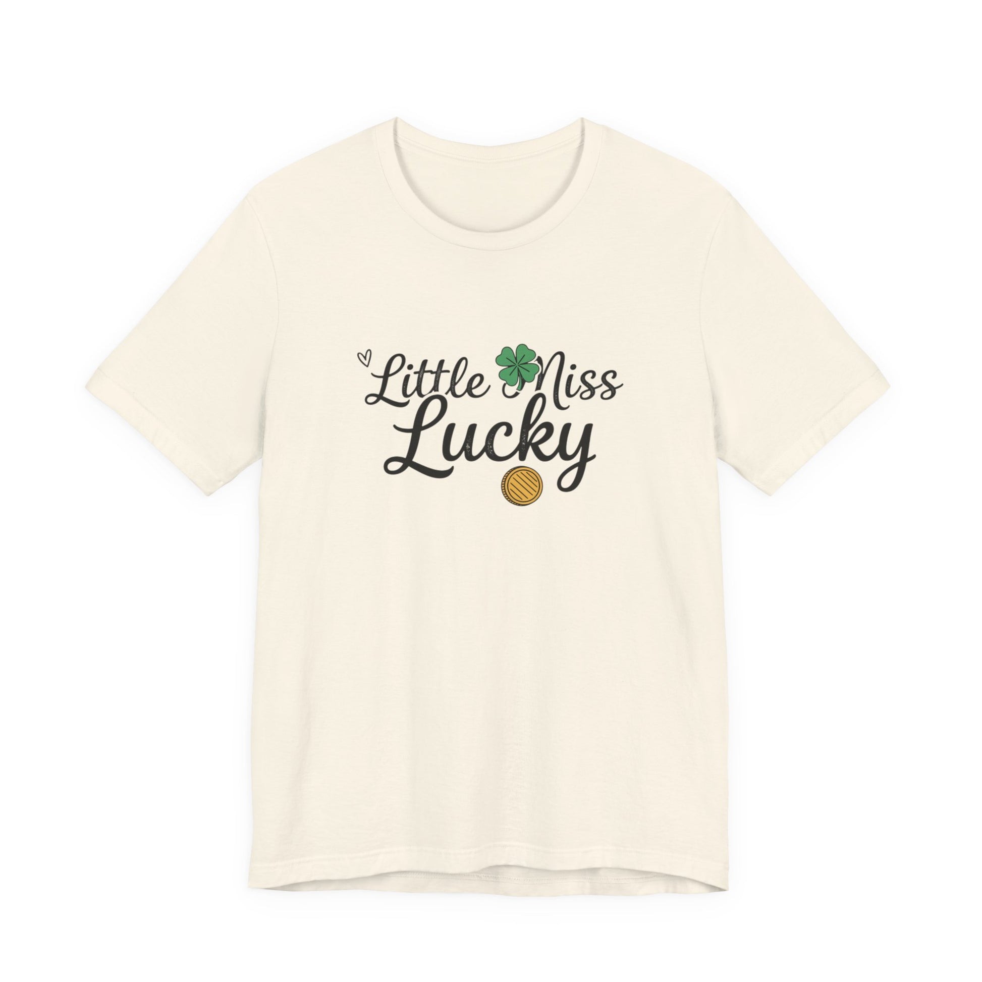 Soft, breathable tee with a playful “Little Miss Lucky” design — a small clover and gold coin tucked into cheerful script. Lightweight Airlume combed cotton feels gentle on the skin and layers easily under jackets or over a favorite tank. The crew neck and retail fit keep the silhouette clean and wearable, while side seams and shoulder tape preserve shape through repeated wear. Wear it at parades, family gatherings, or casual days when you want a subtle nod to good fortune and springtime charm.