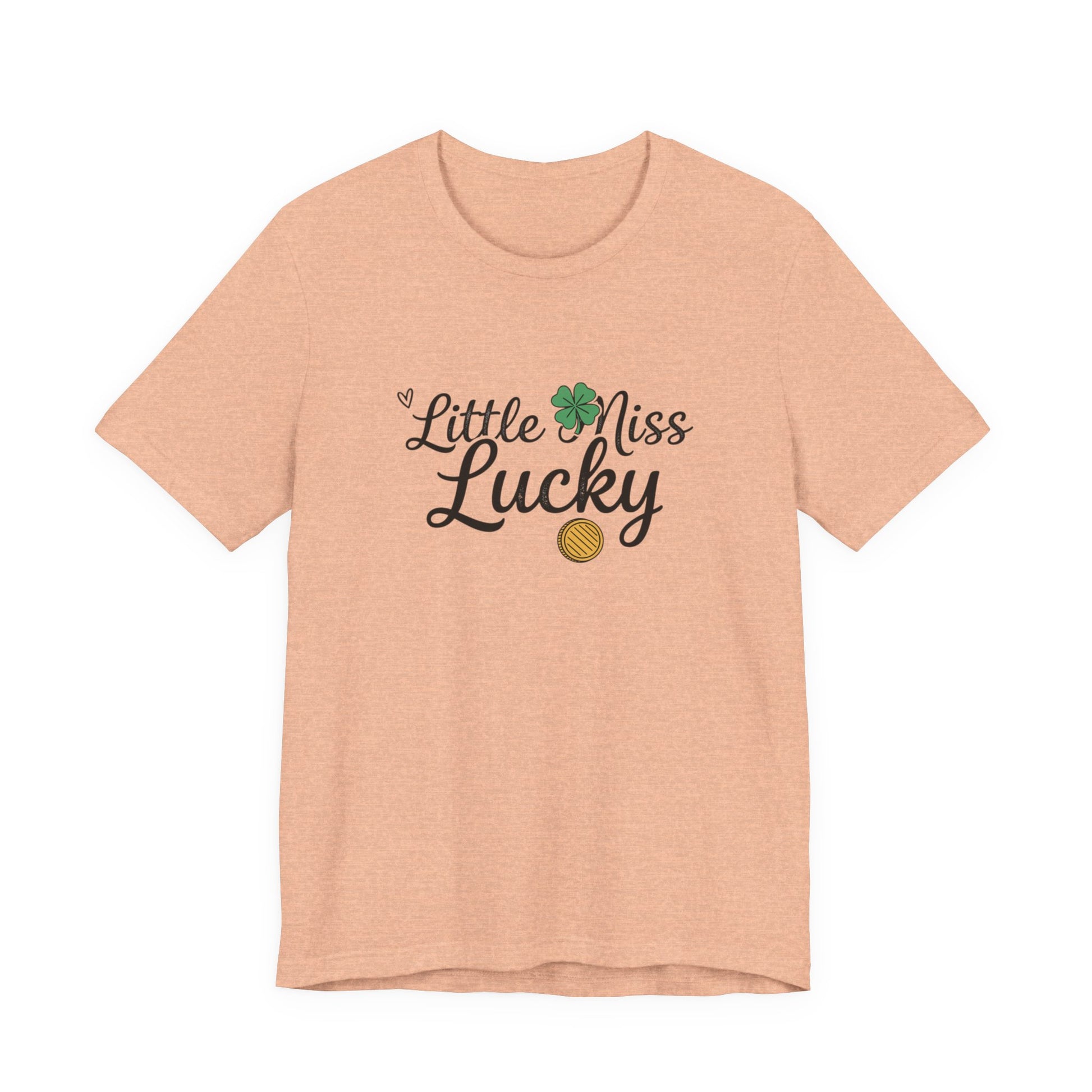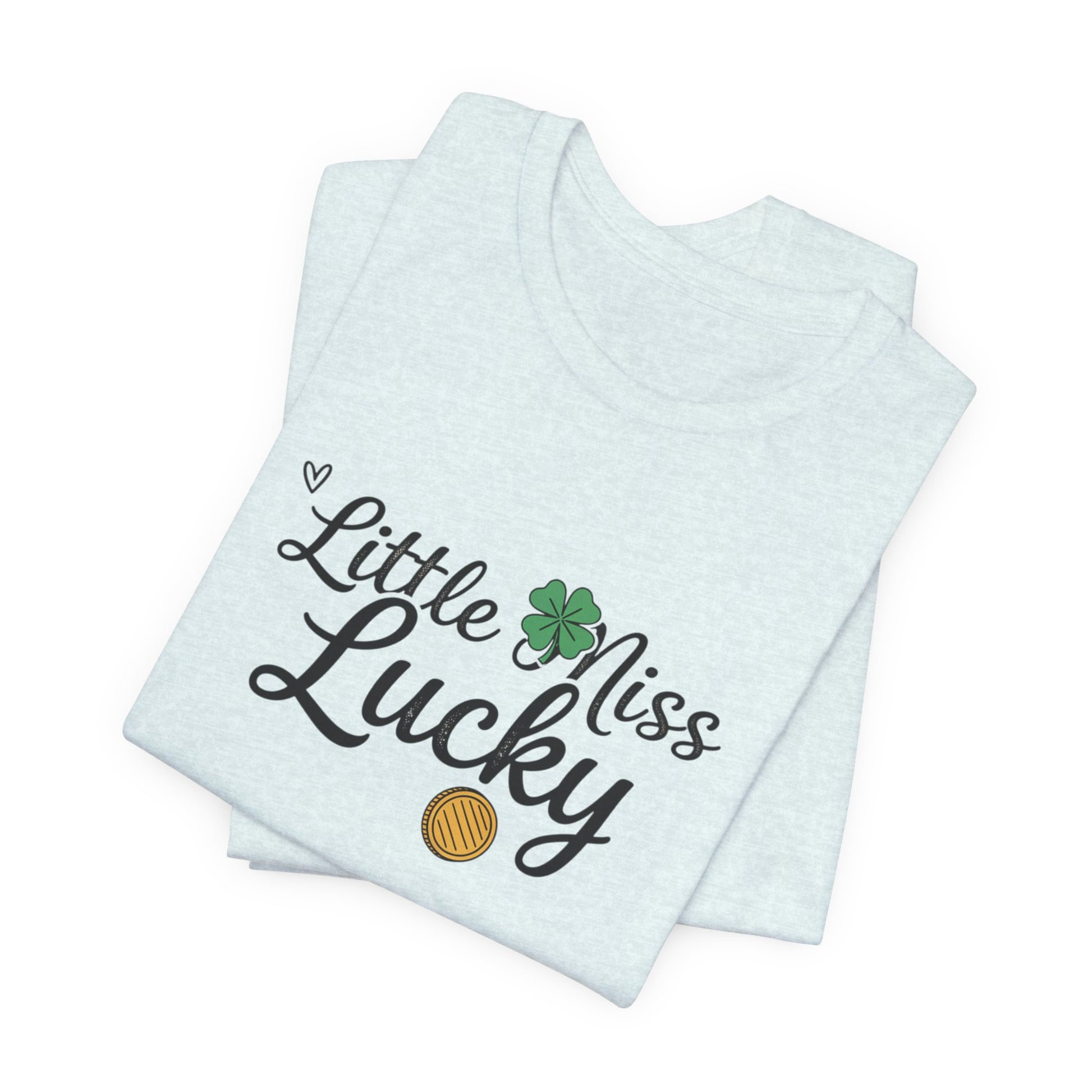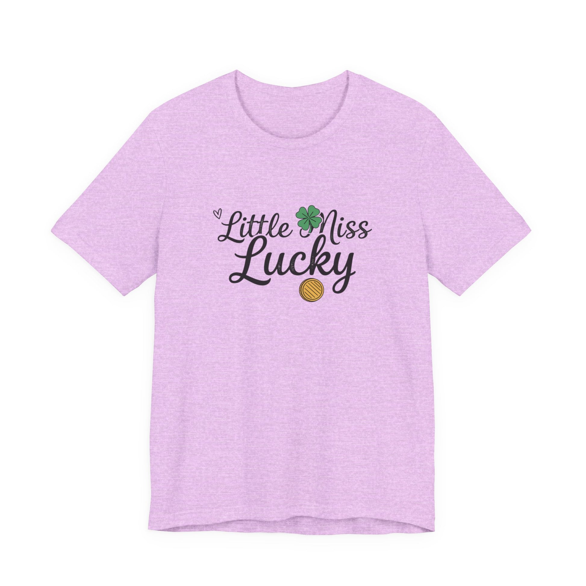 Soft, breathable tee with a playful “Little Miss Lucky” design — a small clover and gold coin tucked into cheerful script. Lightweight Airlume combed cotton feels gentle on the skin and layers easily under jackets or over a favorite tank. The crew neck and retail fit keep the silhouette clean and wearable, while side seams and shoulder tape preserve shape through repeated wear. Wear it at parades, family gatherings, or casual days when you want a subtle nod to good fortune and springtime charm.