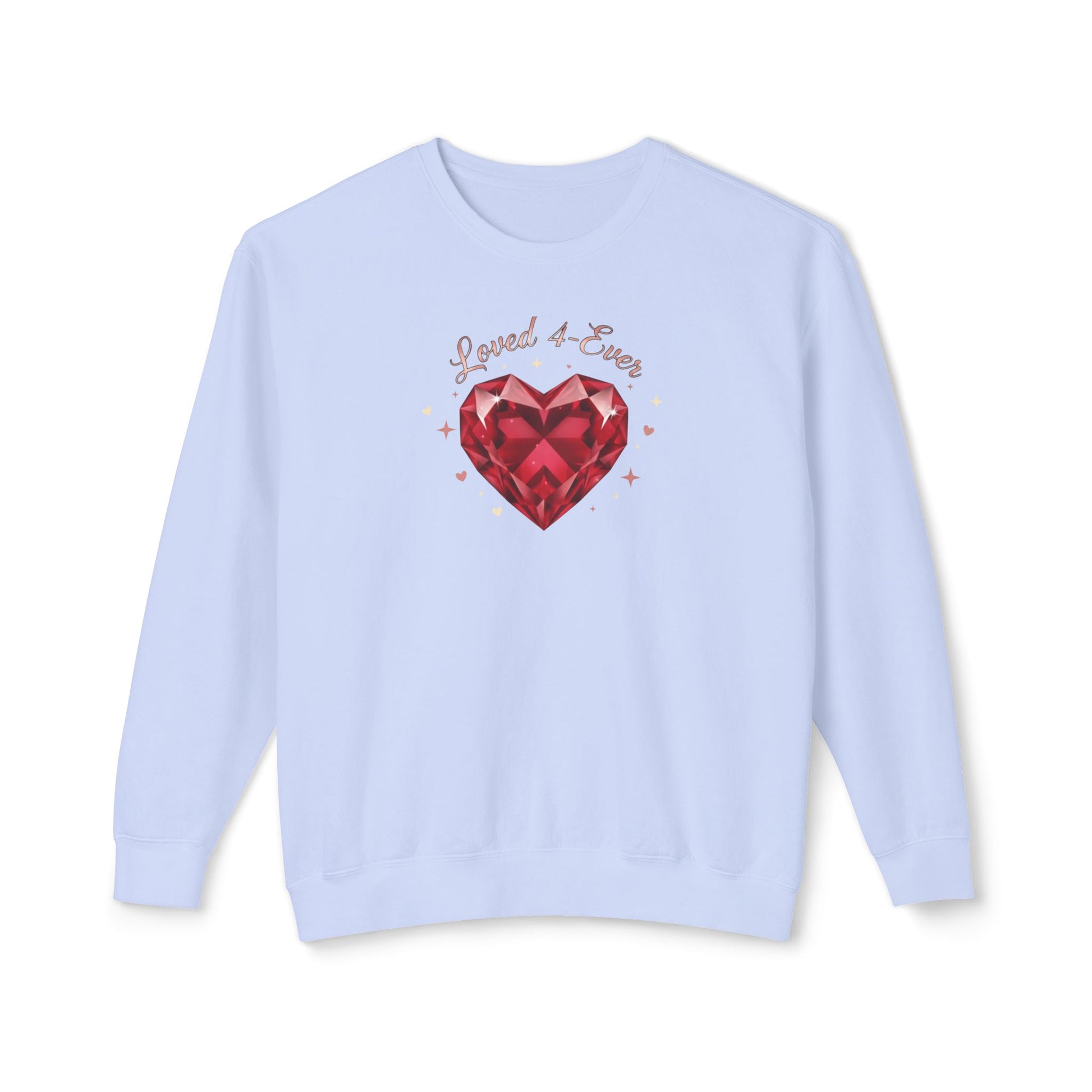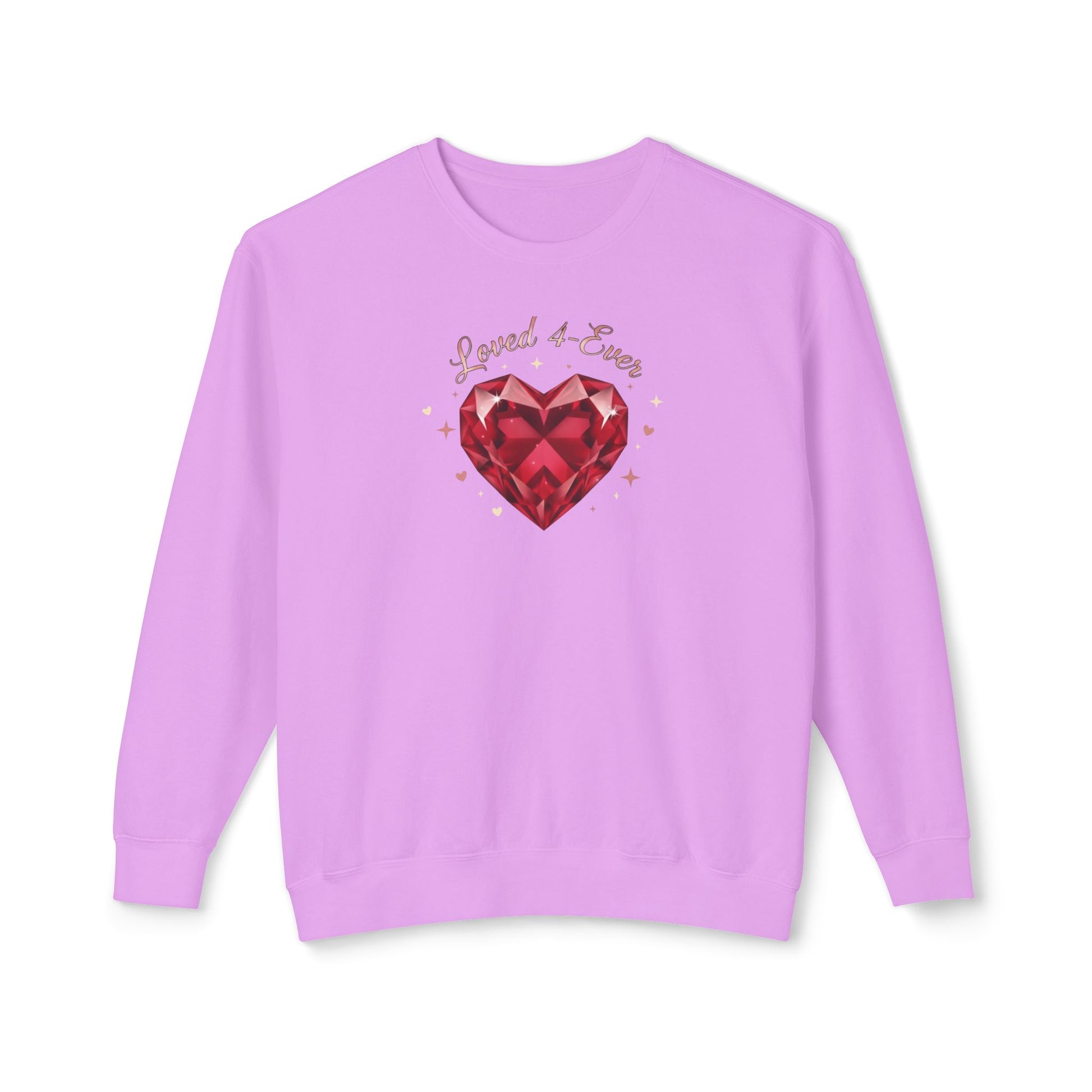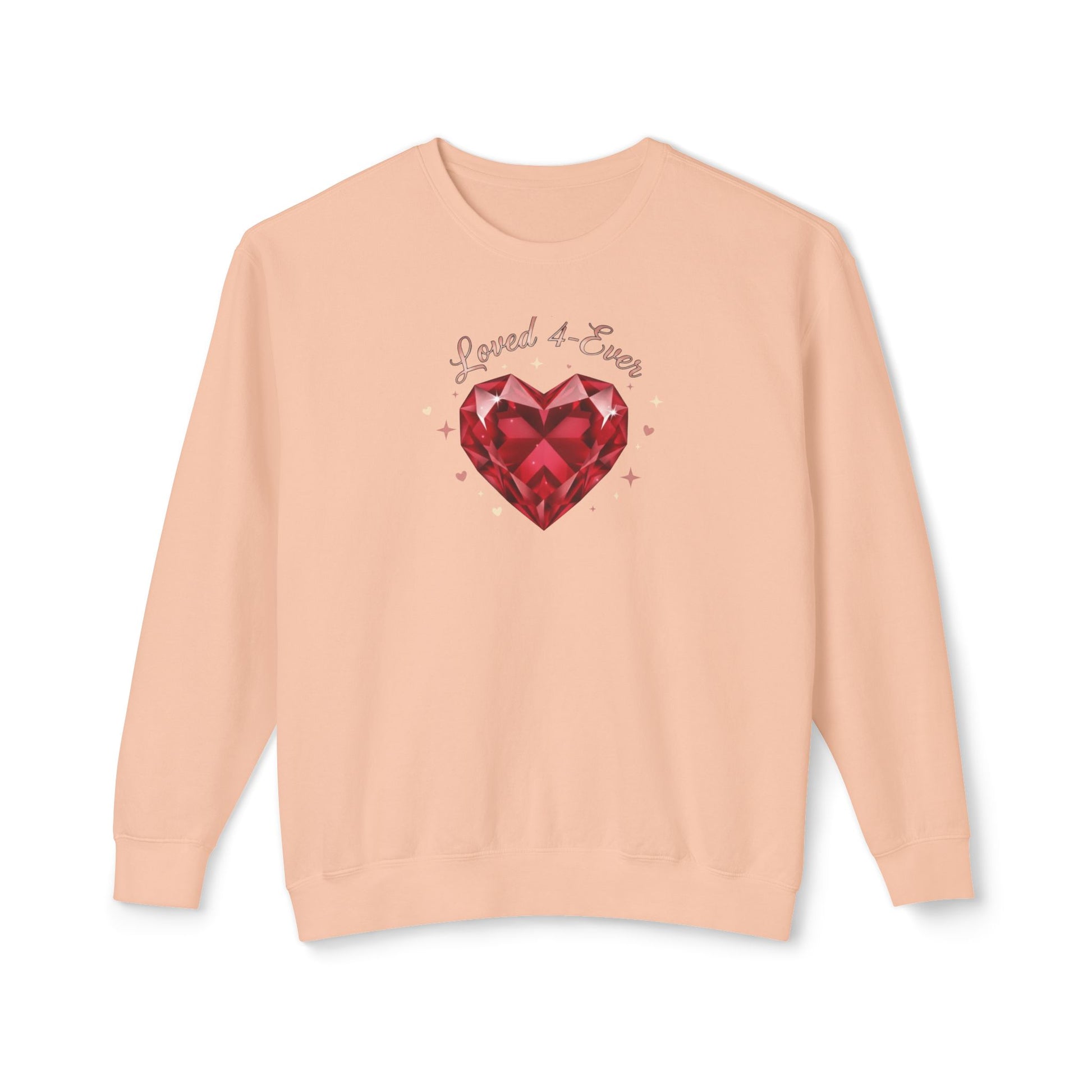 A lightweight, relaxed-fit sweatshirt that brings a soft, nostalgic warmth to quiet weekends and cozy nights in. The front showcases a faceted ruby-heart illustration surrounded by tiny sparkles and the handwritten phrase “Loved & True,” giving the piece a handcrafted, sentimental feel. Breathable ring-spun cotton keeps it airy while the ribbed cuffs and hem hold shape, so it layers easily over tees or under a coat. Wear it when you want a calm, affectionate look — for slow coffee mornings, movie nights at home, or casual meetups where comfort and personality matter.
