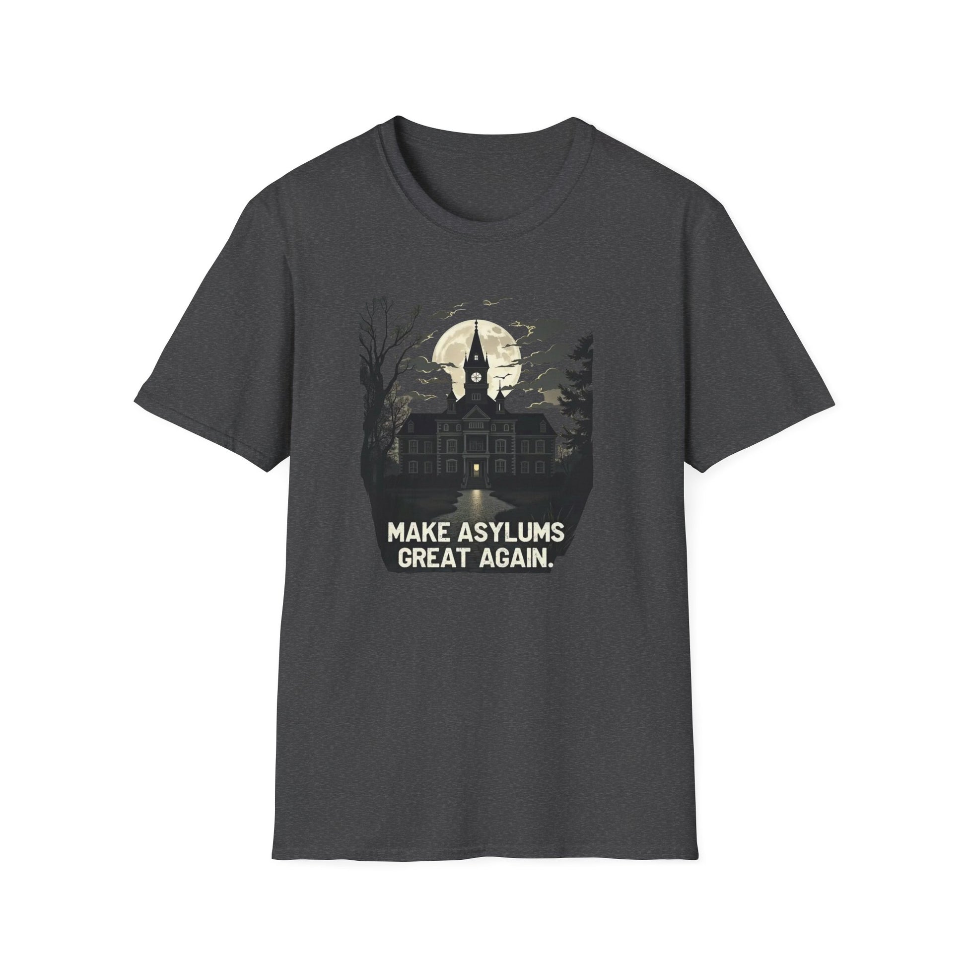 This black crew-neck tee carries a darkly playful vibe — an illustrated gothic asylum silhouette under a pale moon, flanked by bats, with the cheeky slogan “MAKE ASYLUMS GREAT AGAIN..”. The lightweight ring-spun cotton feels soft against skin and drapes cleanly in the classic fit. Wear it layered under a leather jacket for late-night events, or with worn jeans for eerie-fun meetups. The shirt’s muted palette and distressed illustration read like a favorite midnight tale: spooky, ironic, and quietly clever.