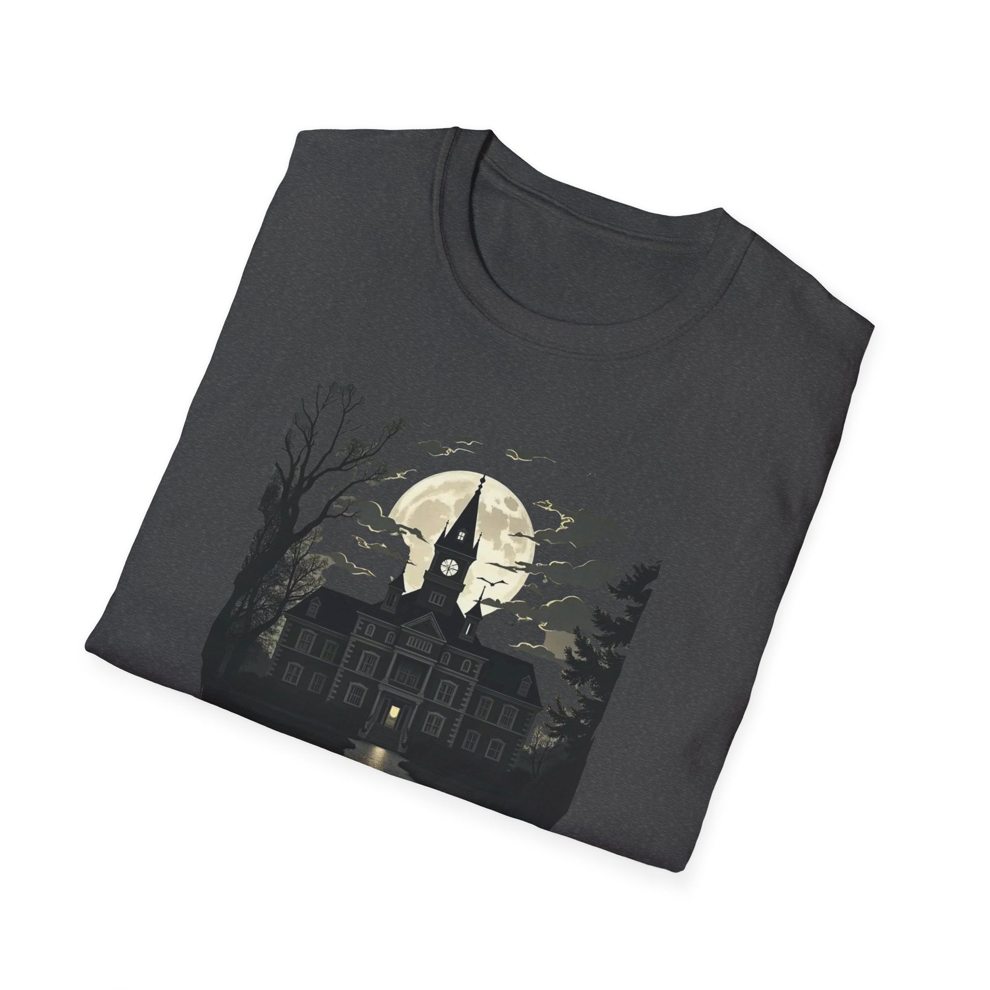 The design speaks to people who love offbeat horror humor, vintage-inspired gothic graphics, and low-key statements at concerts, haunted-house nights, Halloween meetups, or themed gatherings. It fits into a closet built around late-night walks, indie playlists, and collecting oddball pins and patches. The tee is breathable for year-round wear and holds prints crisply so the artwork keeps its moody details wash after wash.