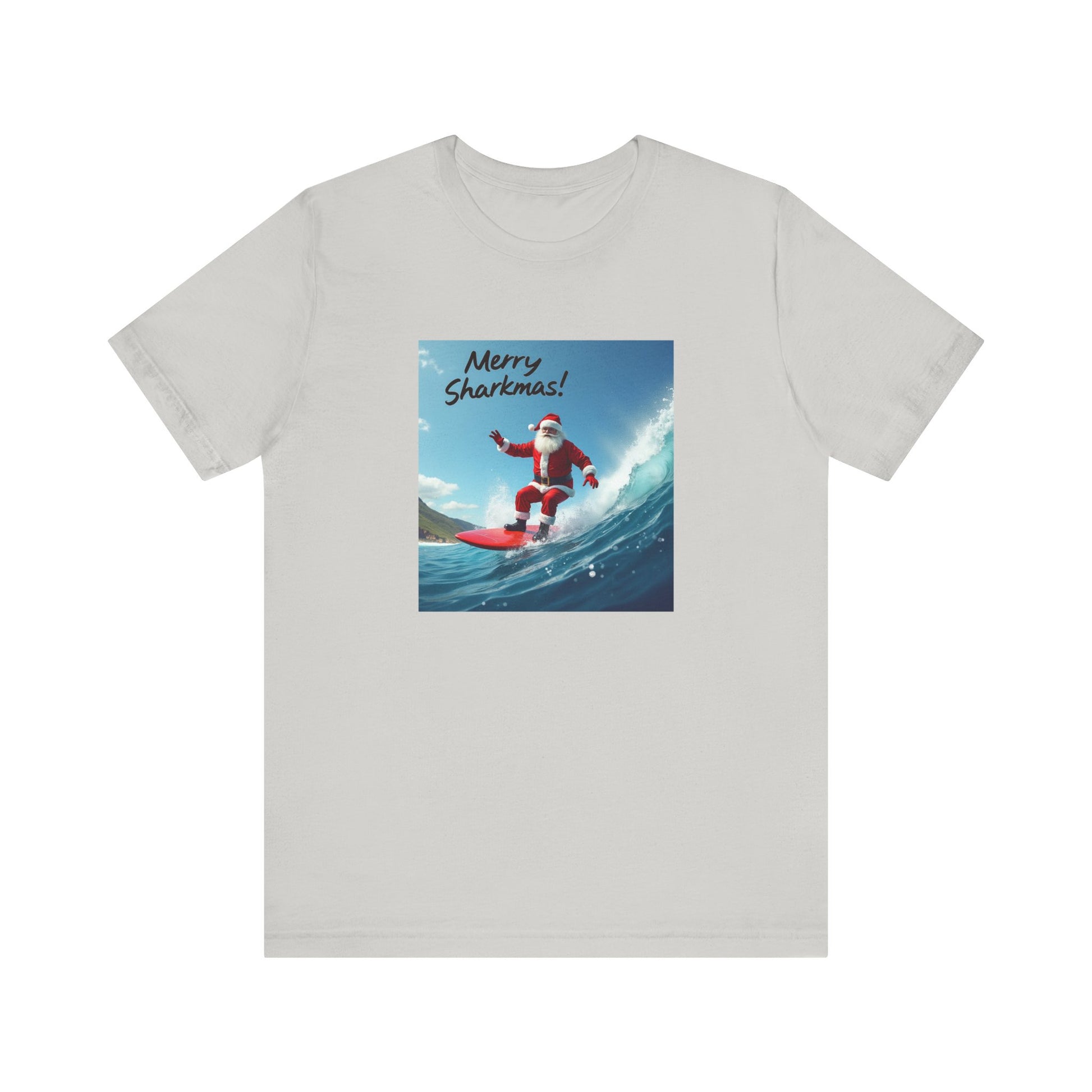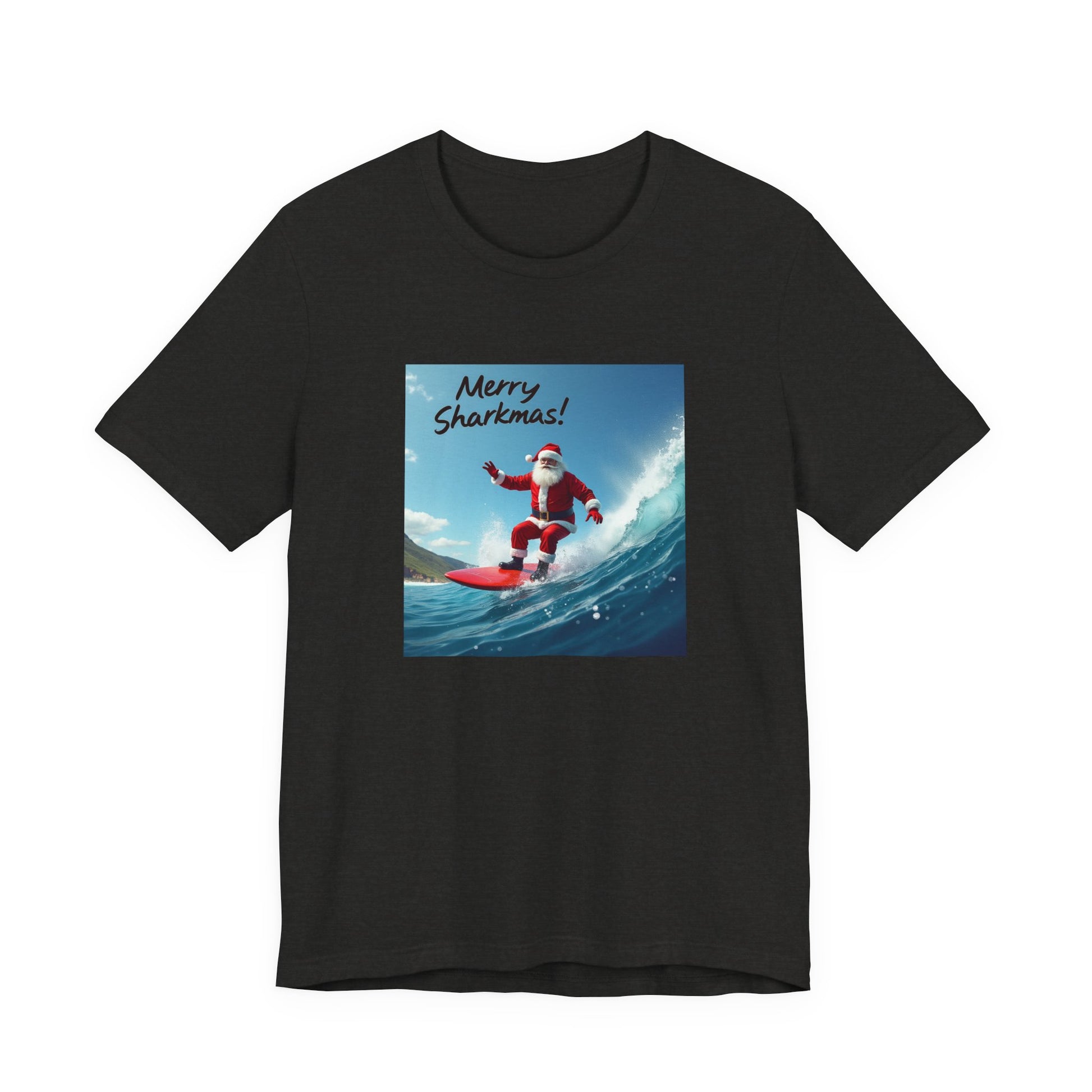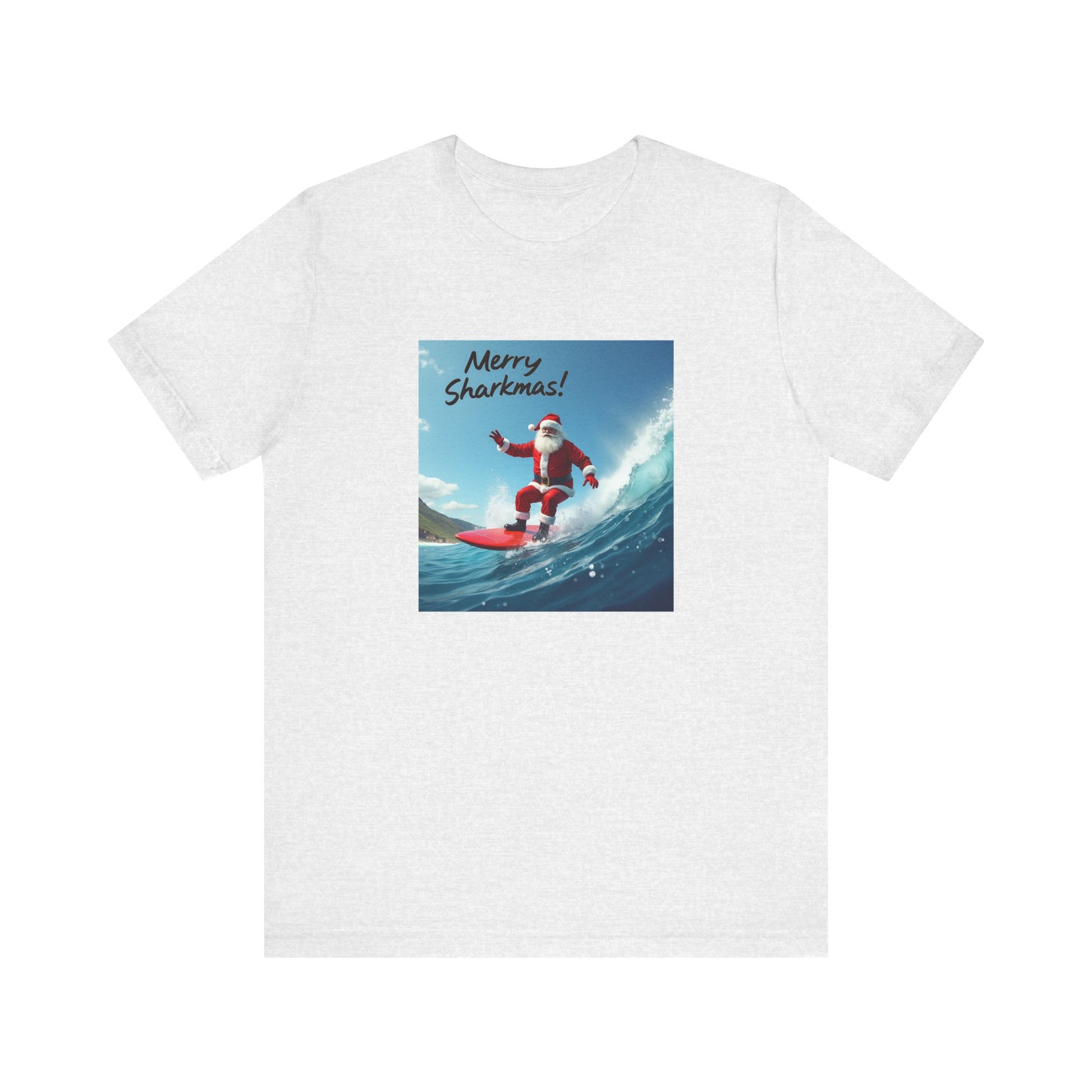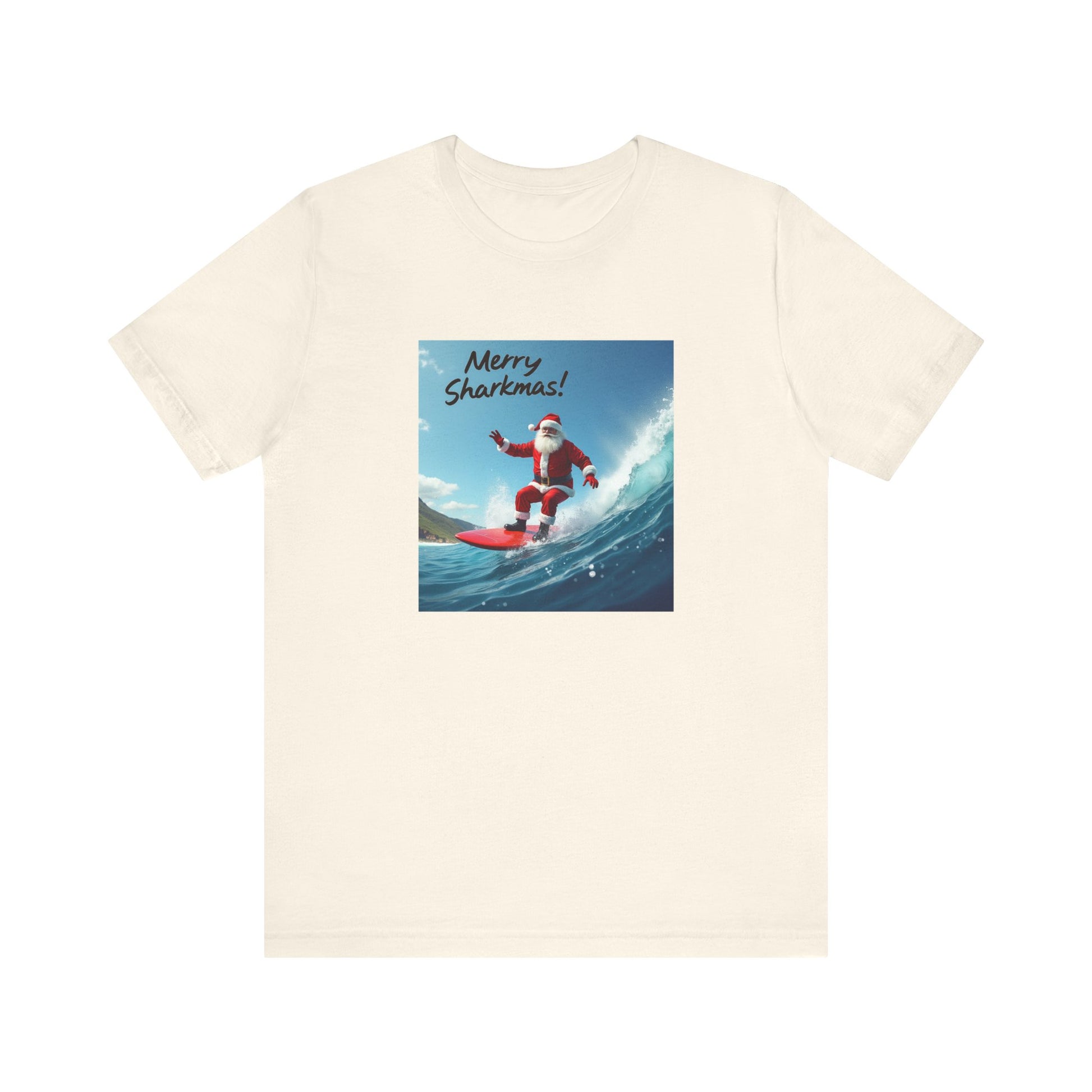 This lightweight jersey tee brings sun-soaked surf energy to holiday cheer. A casual crew-neck shirt printed with a vibrant image of Santa shredding a wave — ‘Merry Sharkmas!’ — it feels easy and familiar: breathable cotton that moves with you, a clean neckline for layering, and a pared-back silhouette that sits comfortably whether you’re at the beach bonfire or running errands. The design pops with crisp sleeve and label printing techniques, and the shirt’s construction (side seams, shoulder tape, ribbed collar) keeps its shape wash after wash. Wear it to spread playful, coastal holiday vibes without sacrificing comfort.