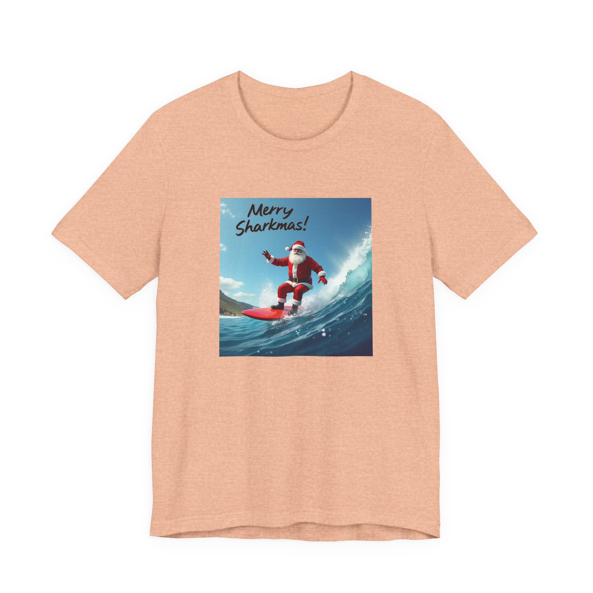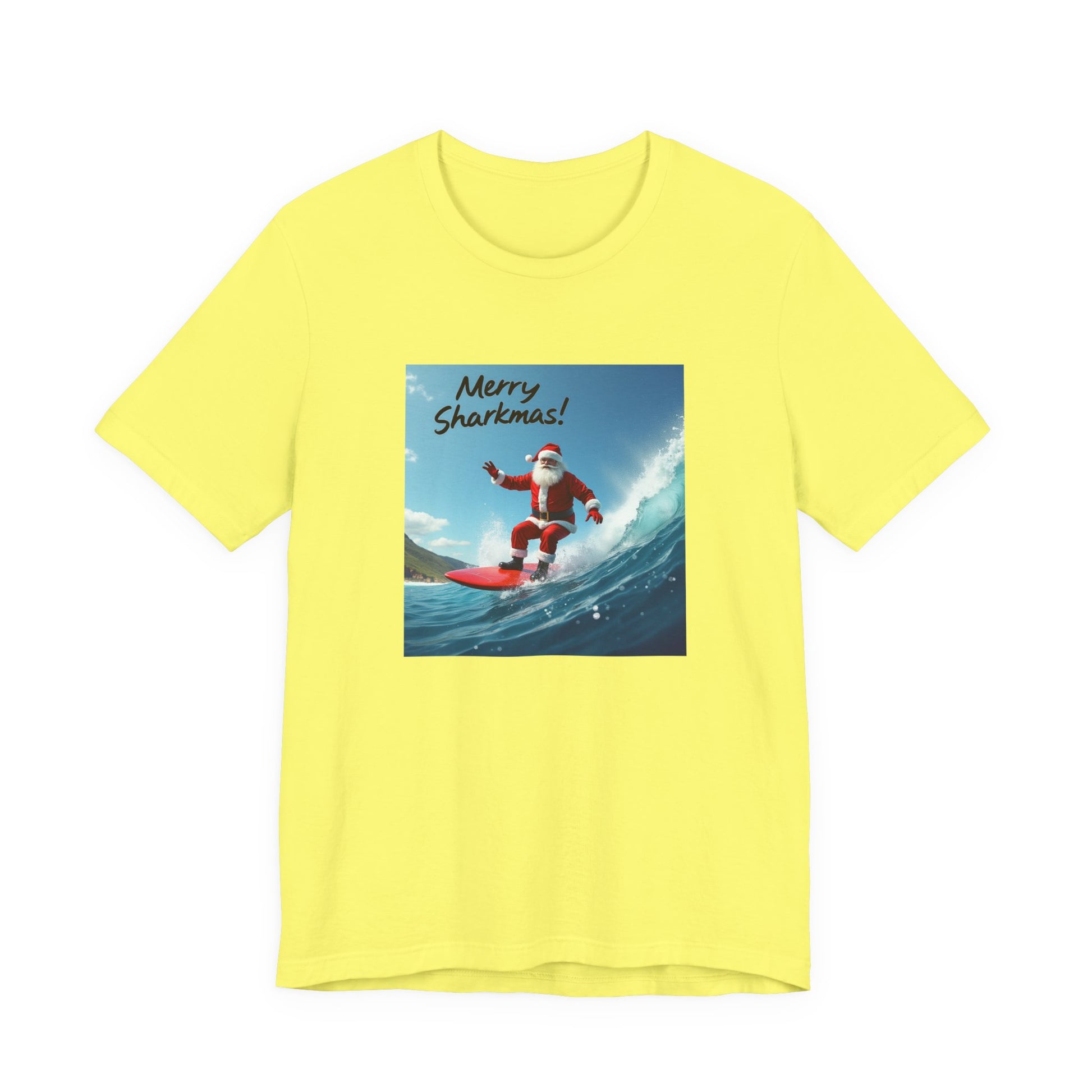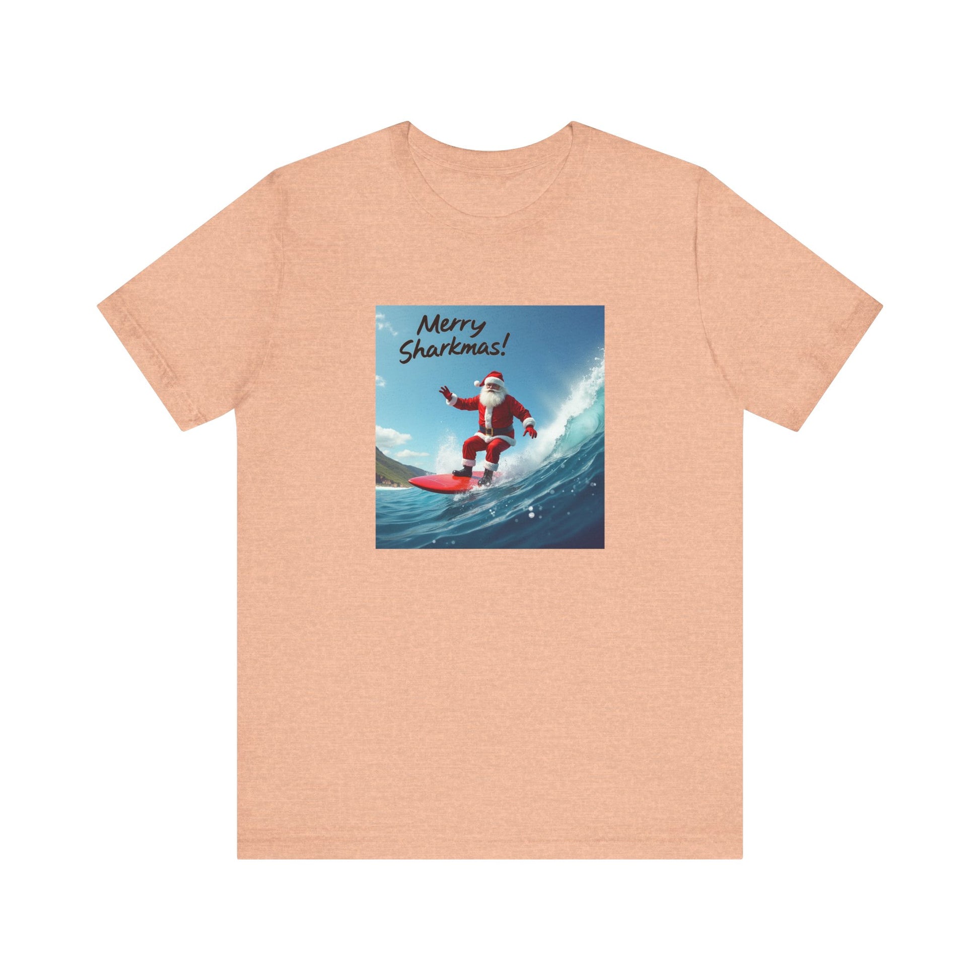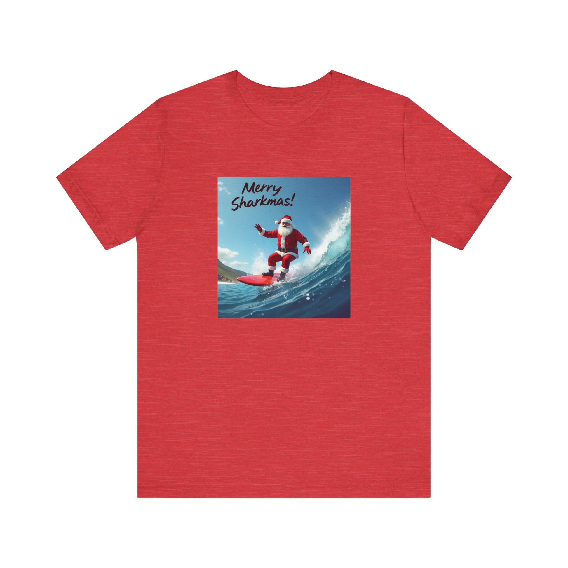 This lightweight jersey tee brings sun-soaked surf energy to holiday cheer. A casual crew-neck shirt printed with a vibrant image of Santa shredding a wave — ‘Merry Sharkmas!’ — it feels easy and familiar: breathable cotton that moves with you, a clean neckline for layering, and a pared-back silhouette that sits comfortably whether you’re at the beach bonfire or running errands. The design pops with crisp sleeve and label printing techniques, and the shirt’s construction (side seams, shoulder tape, ribbed collar) keeps its shape wash after wash. Wear it to spread playful, coastal holiday vibes without sacrificing comfort.