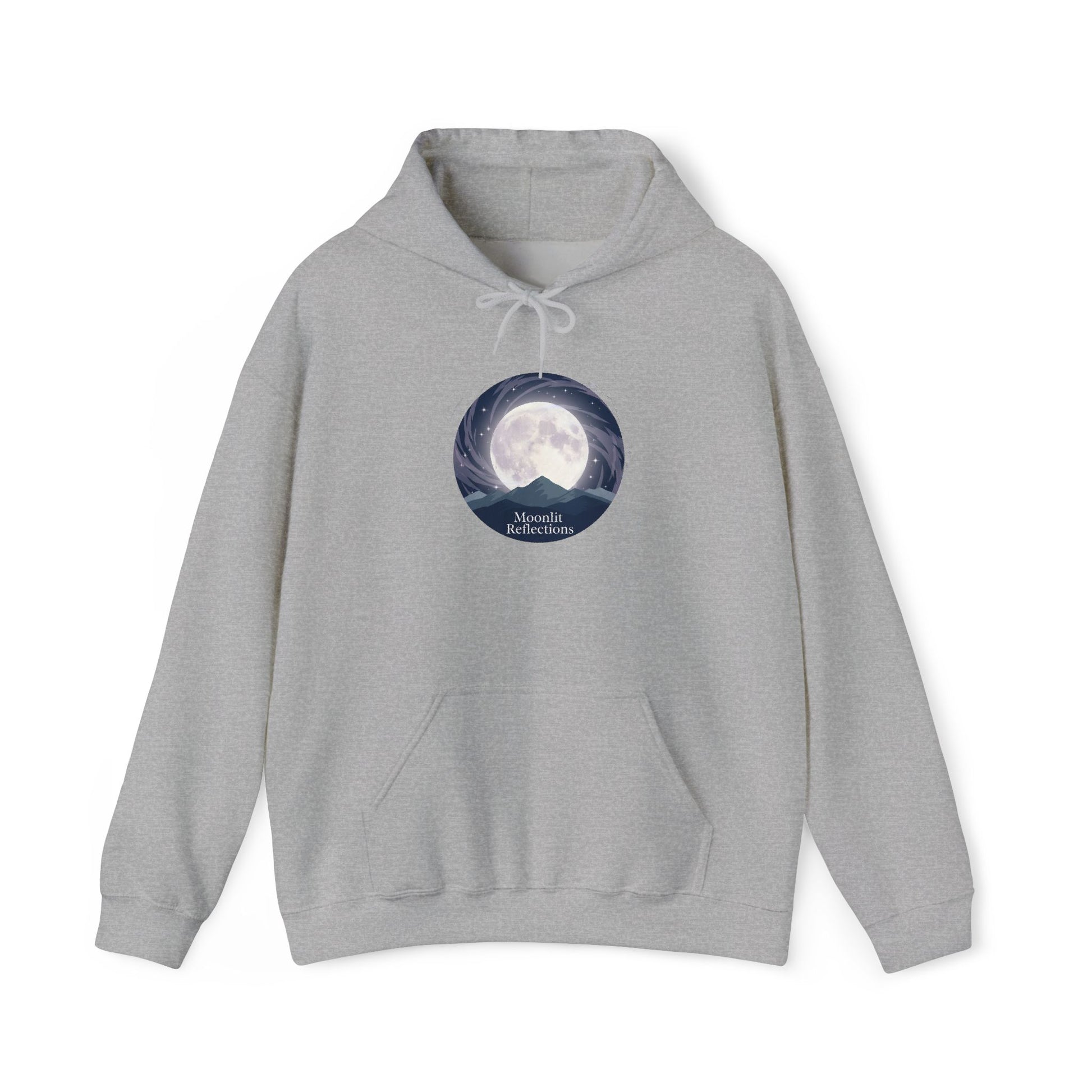 A soft, cozy hoodie tuned for quiet nights and slow mornings. A muted moonlit illustration sits on the chest, its cool blues and soft grays pulling the eye inward—like a small window to a calm, starless night. The fabric has a comforting weight that holds warmth without feeling bulky. Wear it over a tee for a walk through foggy streets, or layer it under a coat for late-night drives. The kangaroo pocket keeps hands warm; the double-lined hood and color-matched drawcord add subtle, lasting details. This sweatshirt reads like a calm companion: low-key, tactile, and made to be reached for when you want to slow down.