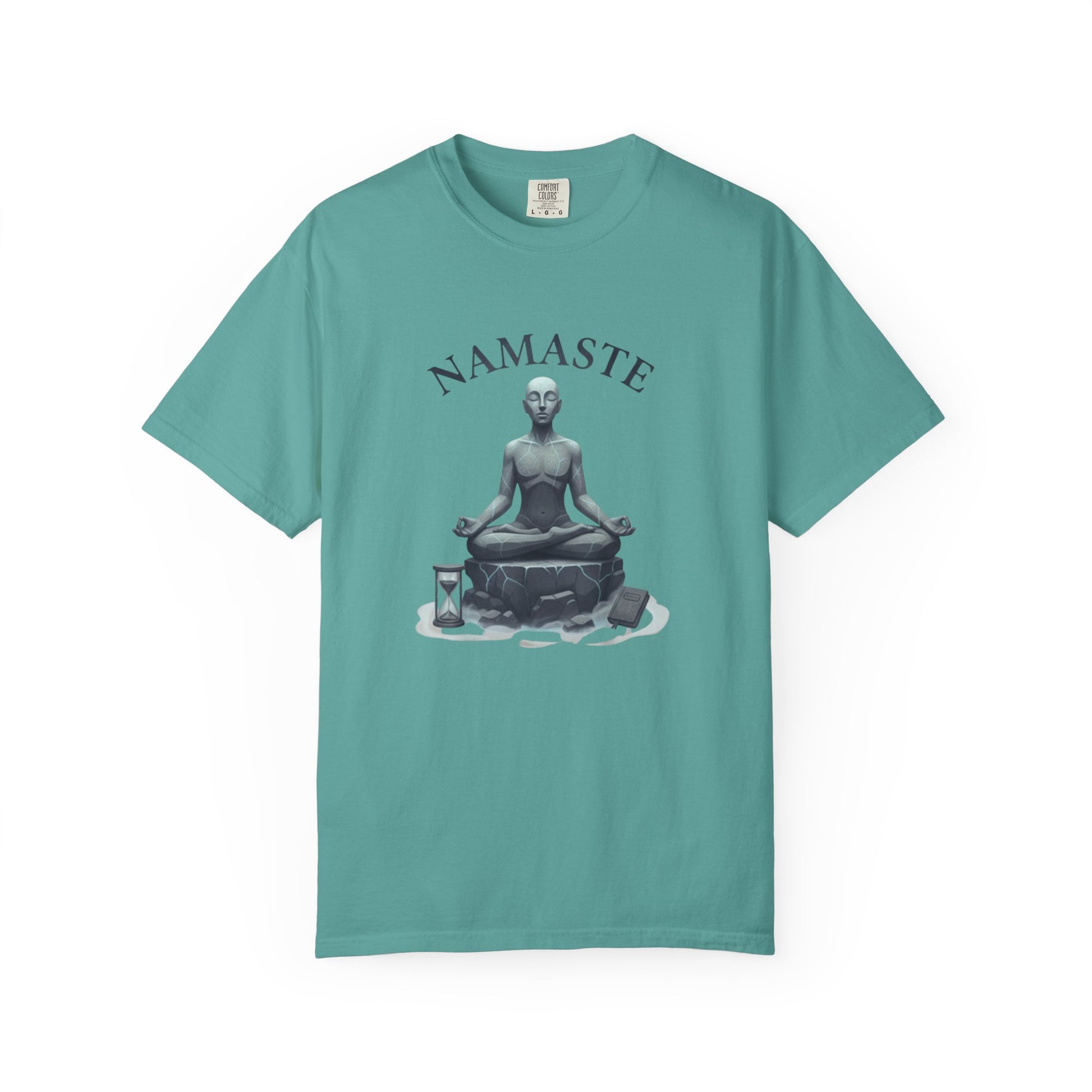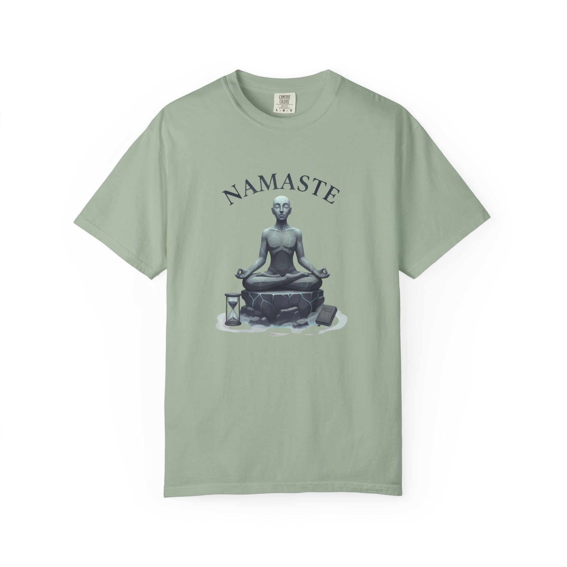 Soft, lived-in comfort meets quiet mindfulness. This garment-dyed tee carries a meditative statue illustration and the word "NAMASTE" above it — a subtle nod to breath, stillness, and slow mornings. The heavyweight cotton drapes with a relaxed silhouette, letting the image sit gently on the chest without feeling stiff. Reach for it after a yoga flow, on a lazy weekend with tea, or when you want an everyday reminder to pause. The natural, muted dye gives the shirt a slightly vintage, earthy look that blends easily with well-worn jeans, linen pants, or layered under a cardigan for cooler evenings.