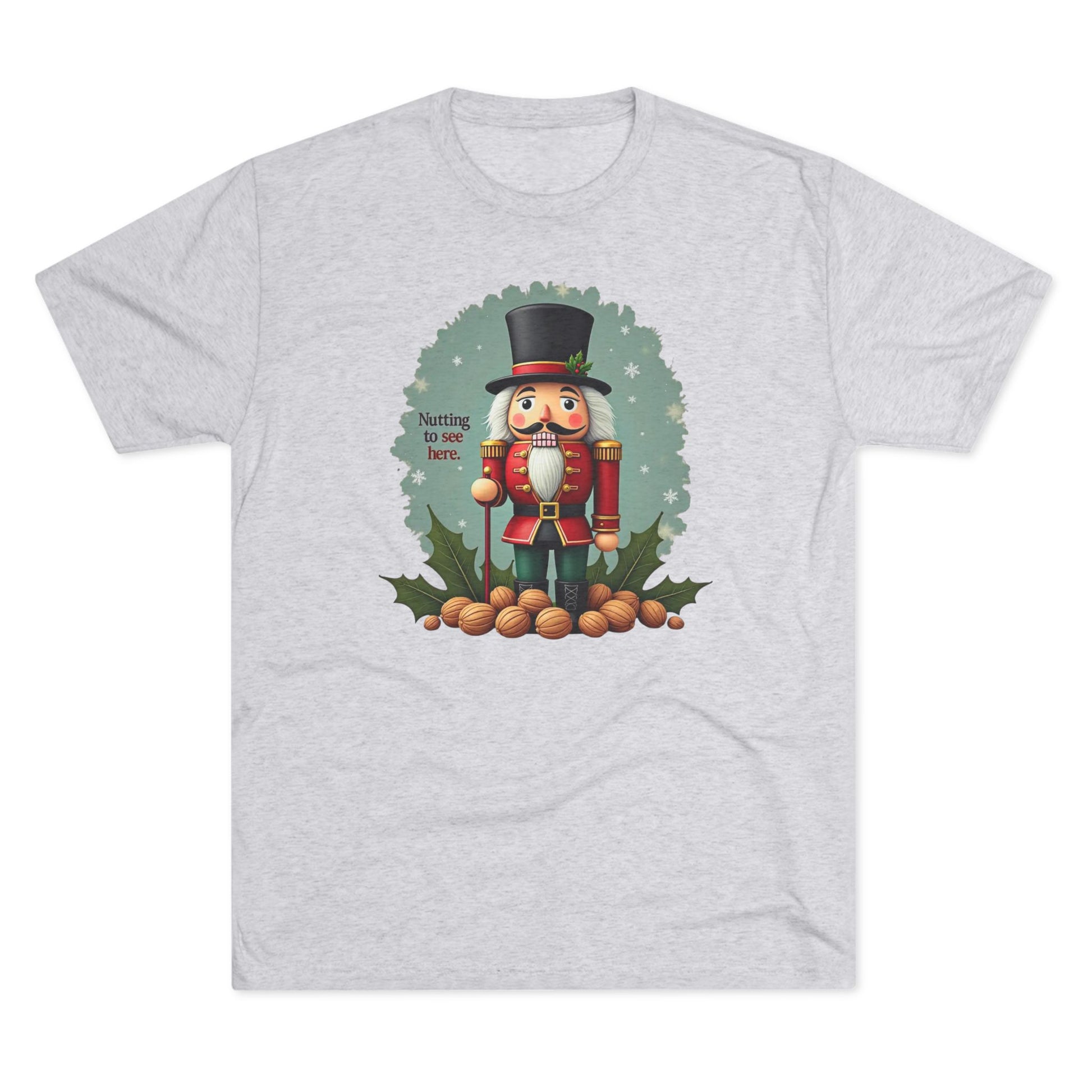 This lightweight crew tee brings a touch of old-world holiday charm to everyday wear. A classic nutcracker illustration stands centered on soft heather fabric, framed by holly leaves and scattered nuts for a cozy, storybook feel. The shirt drapes gently and moves with you—great for layering under a cardigan on a crisp evening or worn solo at a neighborhood cookie exchange. It reads like a small, nostalgic scene on fabric: warm, a little whimsical, and quietly festive. The muted green background behind the nutcracker keeps the design grounded so the colors pop without feeling loud. Easy to wear from morning coffee runs to low-key holiday gatherings, it feels like a familiar seasonal companion rather than shouted holiday gear.