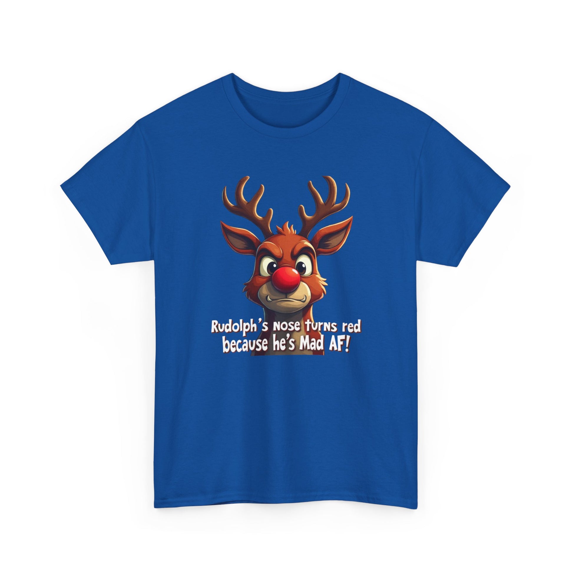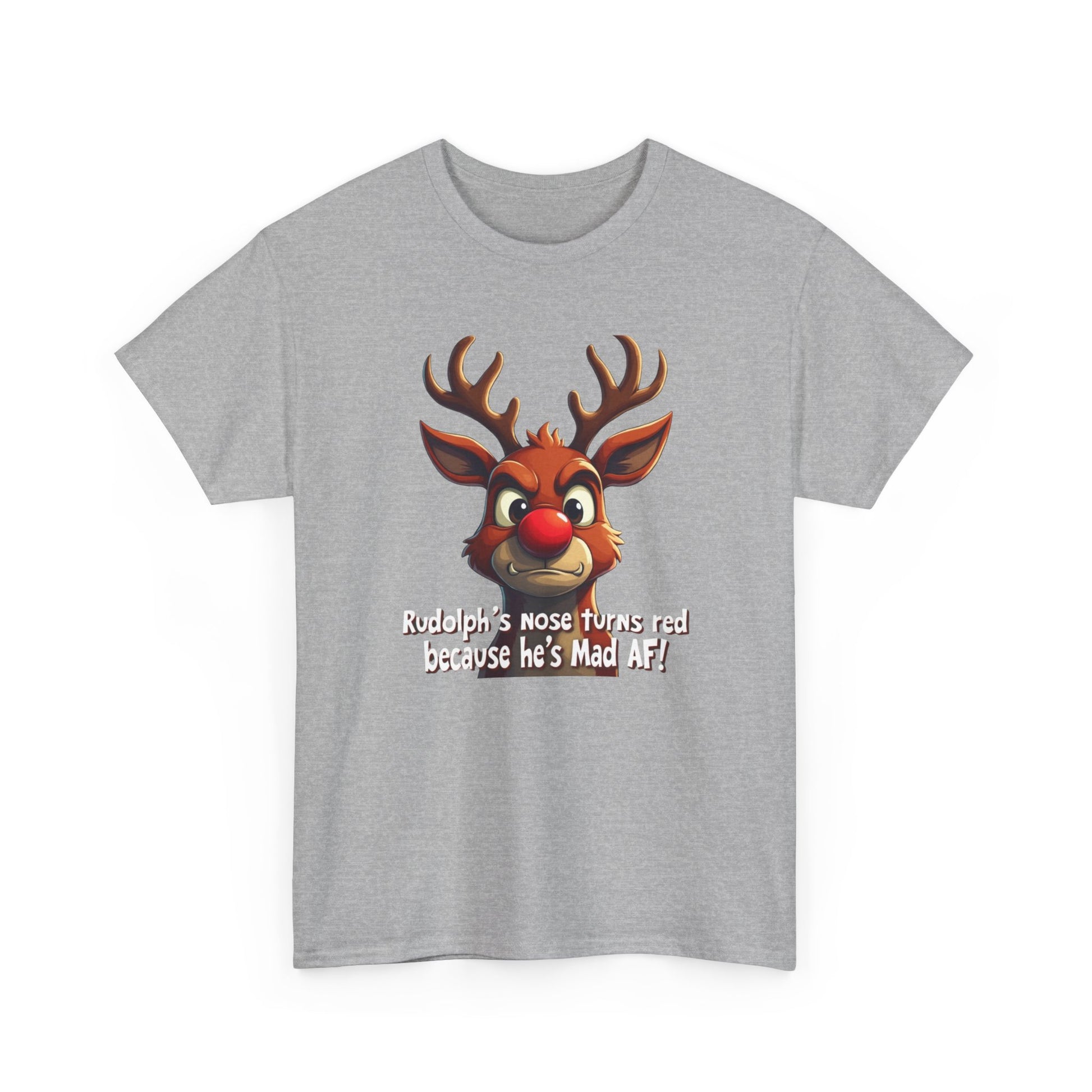 Rudolph Funny Christmas T-Shirt — "Rudolph's Nose Turns Red Because He's Mad AF" Holiday Tee