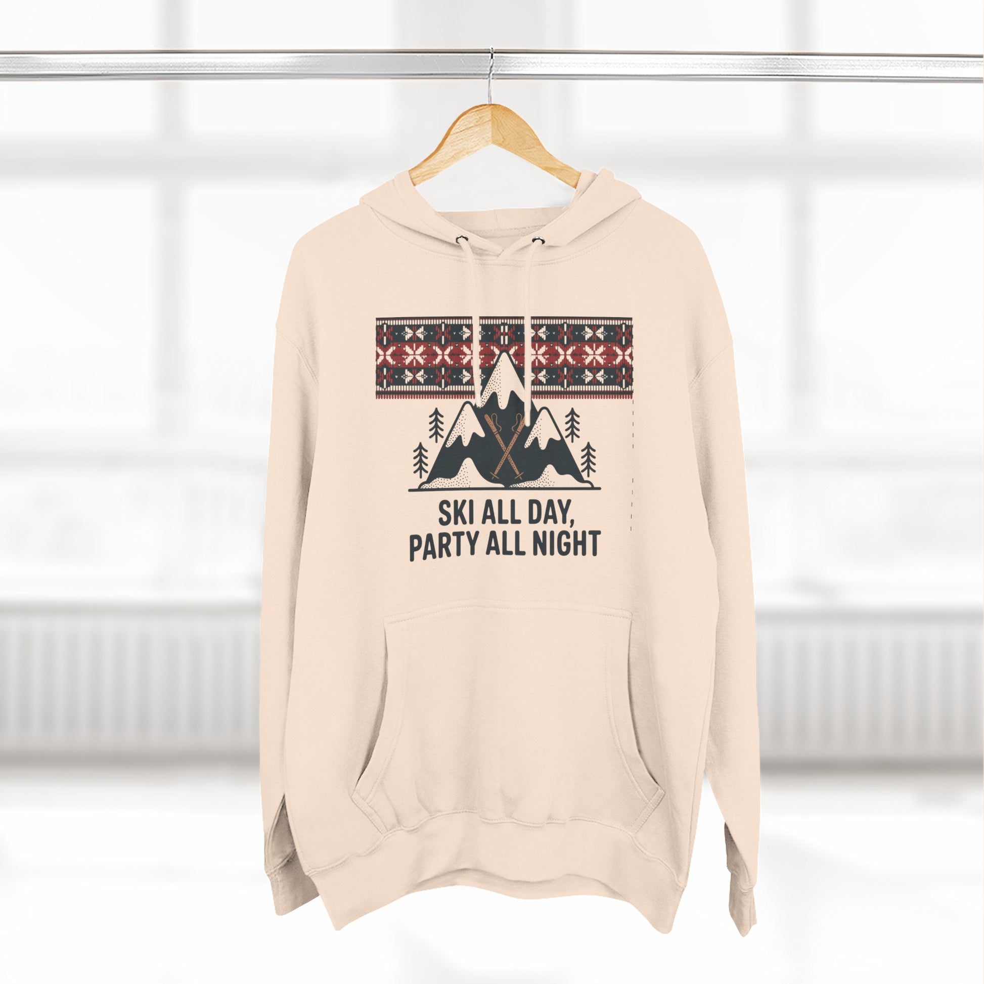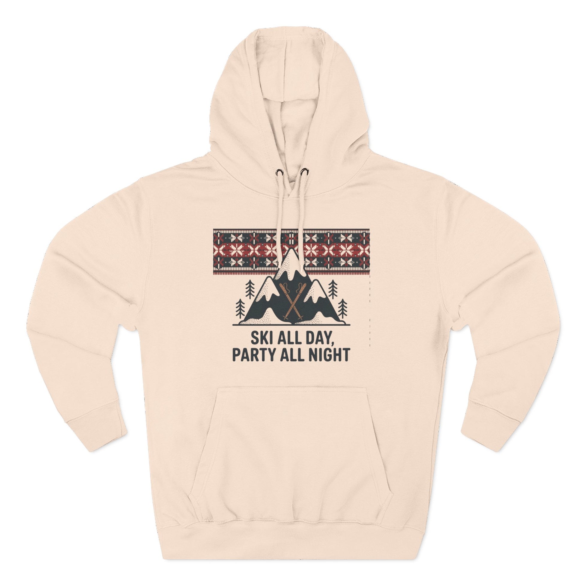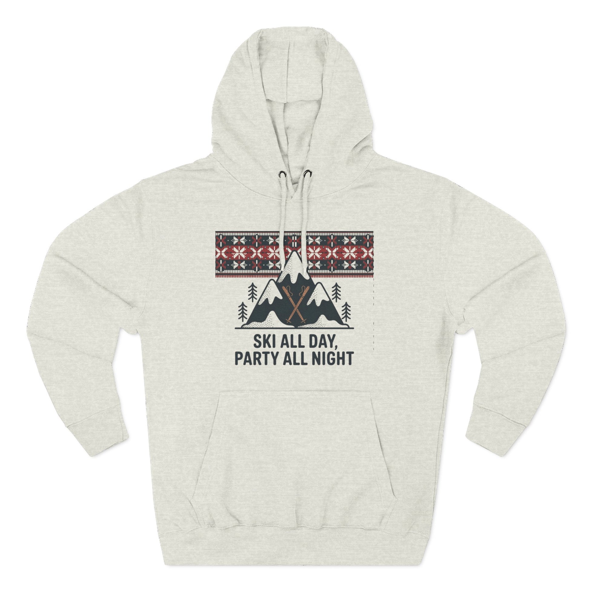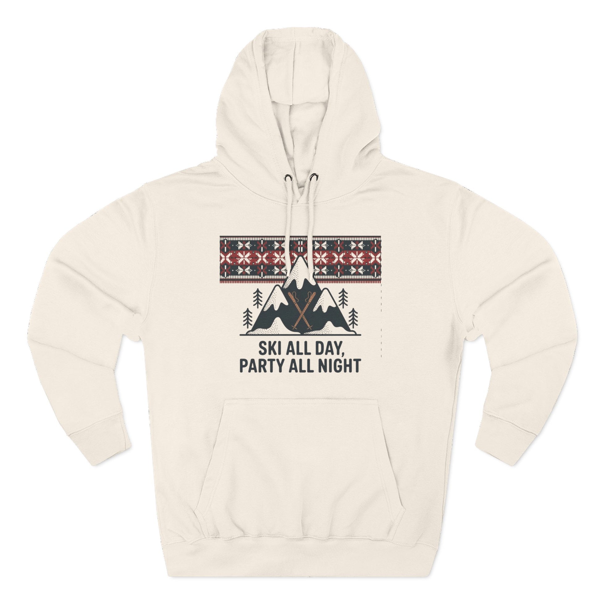 This cozy fleece hoodie carries the spirited hush of mountain mornings and the cheerful buzz of lodge nights. A soft, medium‑heavy fabric wraps you in warmth while a playful alpine graphic — peaks, pines, and a Nordic-inspired fair isle band — reads like a weekend itinerary: 'Ski all day, party all night.' The roomy kangaroo pocket keeps hands warm between chairlift runs. A structured hood with metal-grommet drawstrings and twill neck tape keep the fit secure and comfortable. Subtle details like double-needle topstitching, a tear-away label and the option for small chest embroidery give it a refined, lived-in feel. Wear it layered after a day on the slopes, around a roaring lodge fire, or out with friends when the après-ski mood takes over.