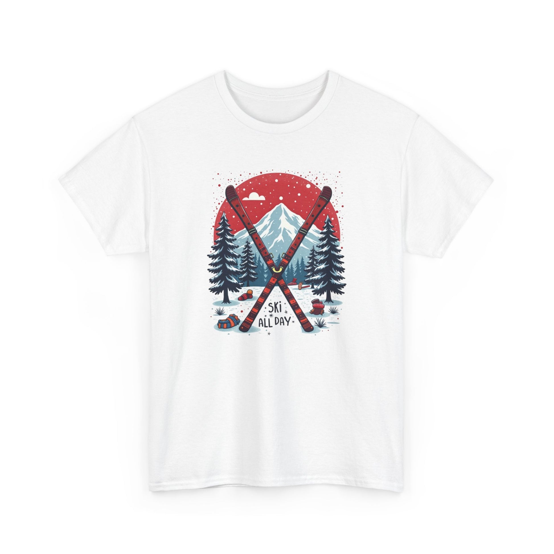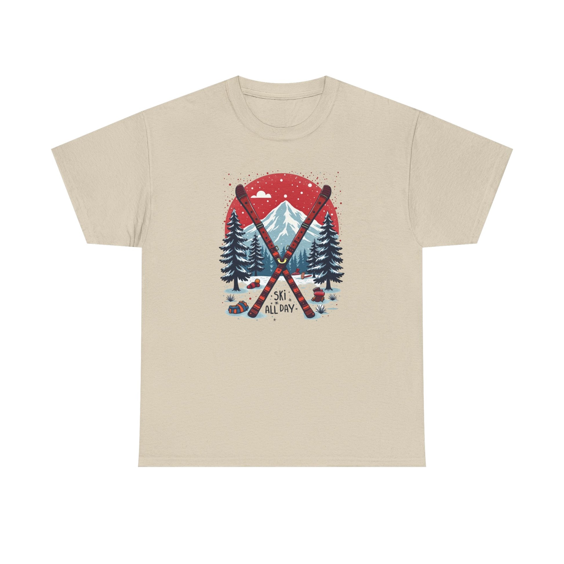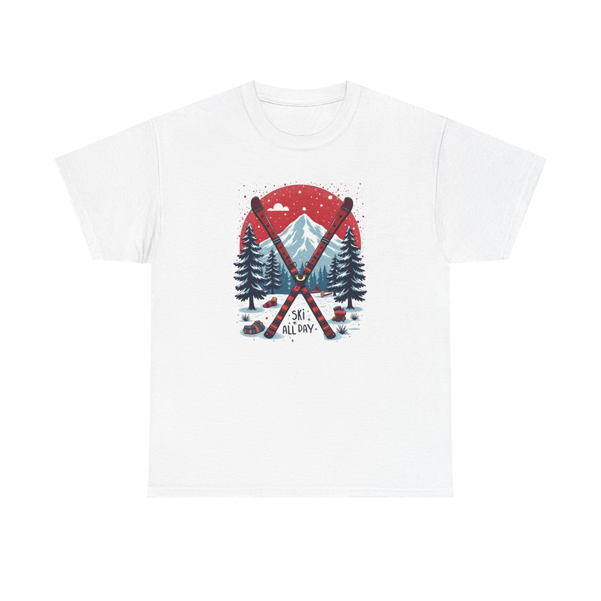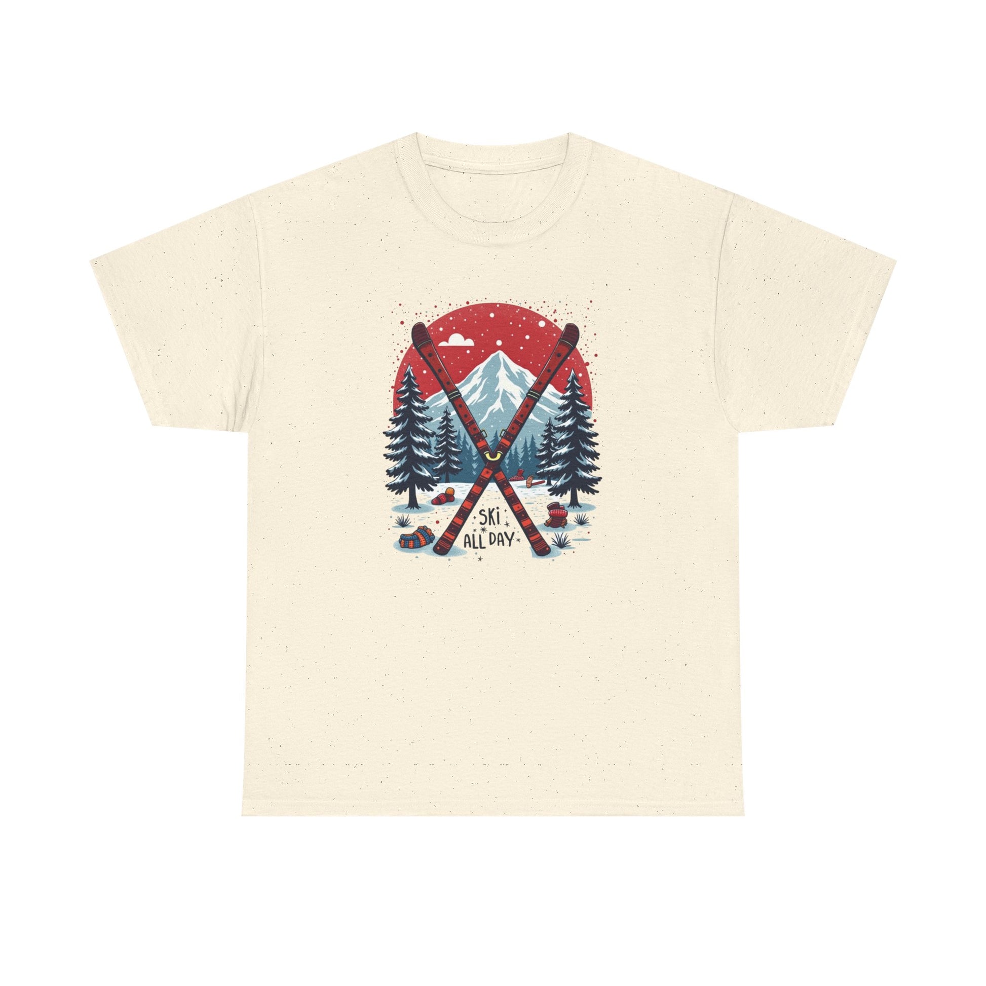 Ski All Day T-Shirt – Vintage Mountain Skis, Trees & Snow Graphic