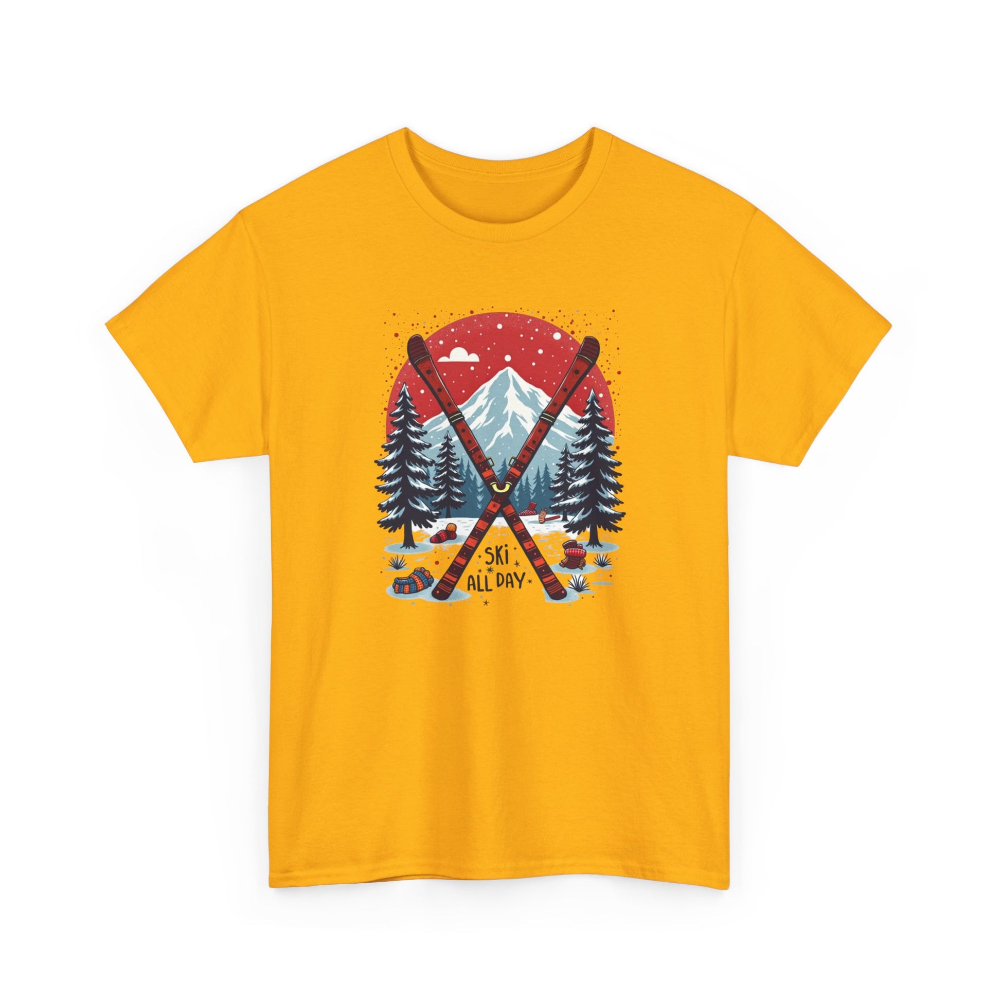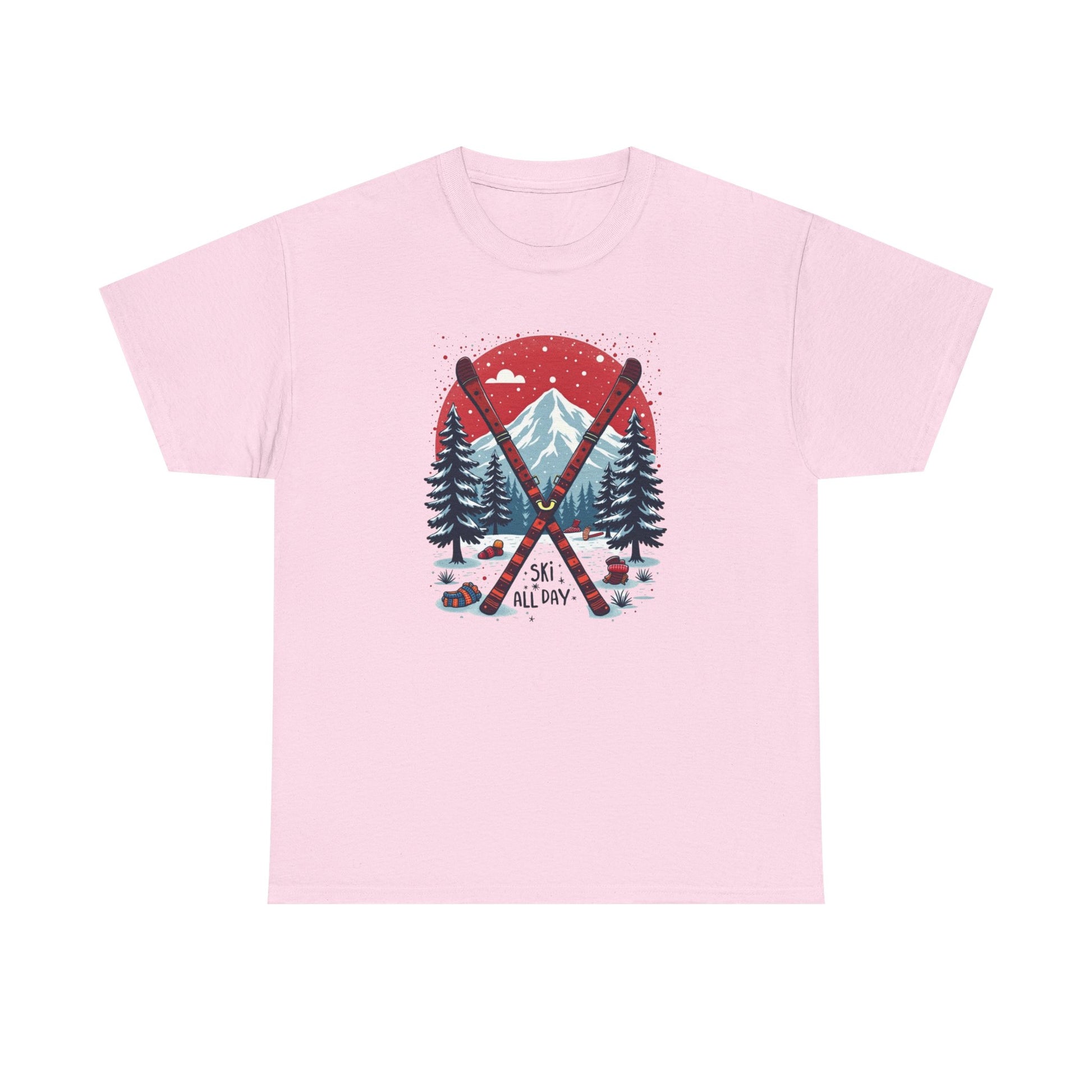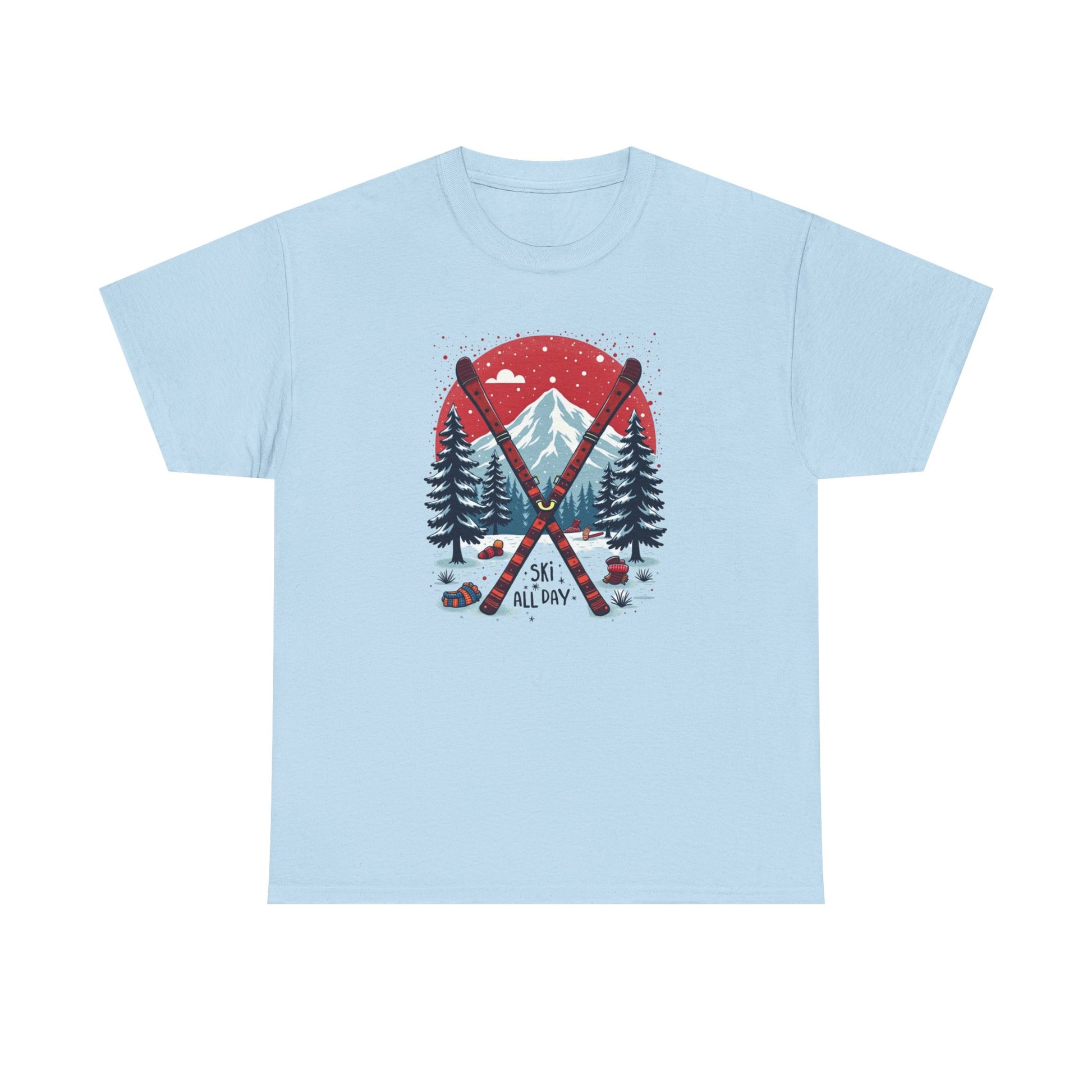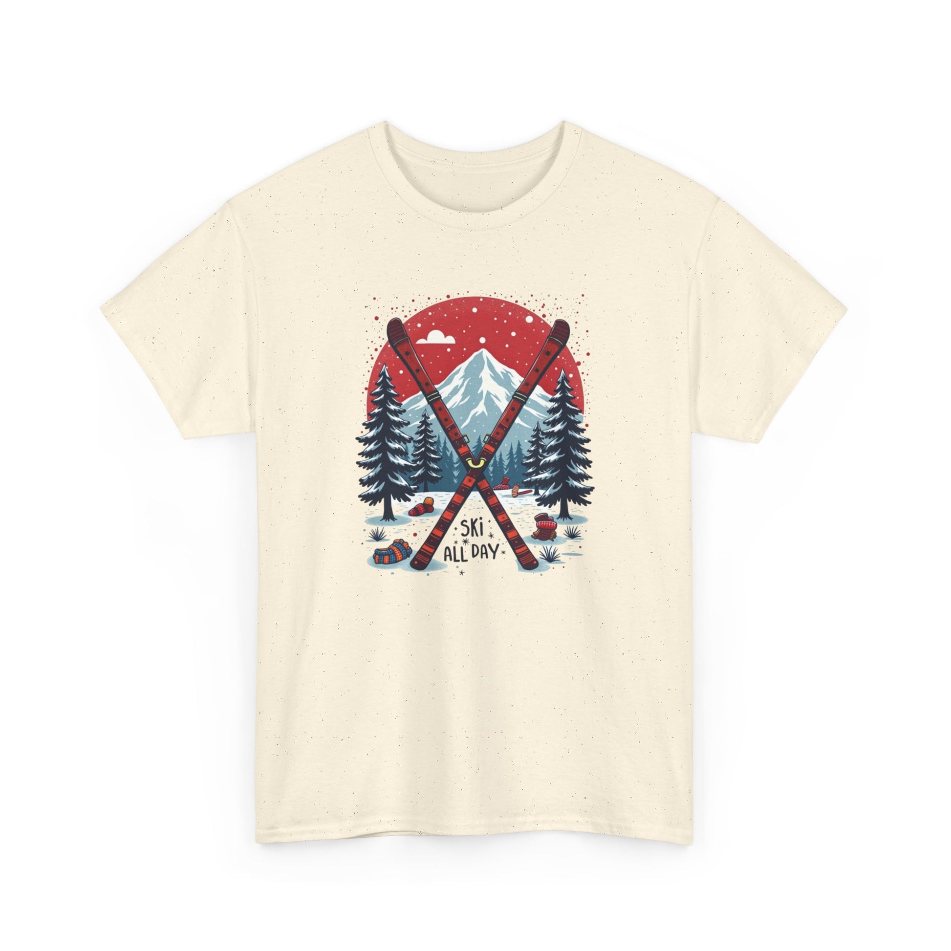 Ski All Day T-Shirt – Vintage Mountain Skis, Trees & Snow Graphic