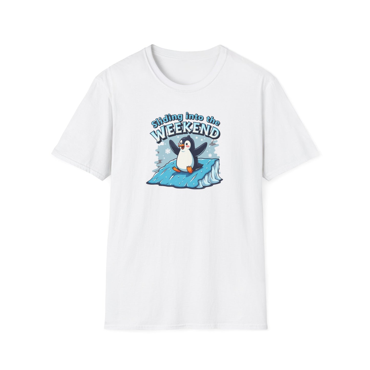 Sliding Penguin, Weekend Vibes T-Shirt, Funny Graphic Tee, Penguin Design Shirt, Casual Apparel, Unisex Softstyle T-Shirt