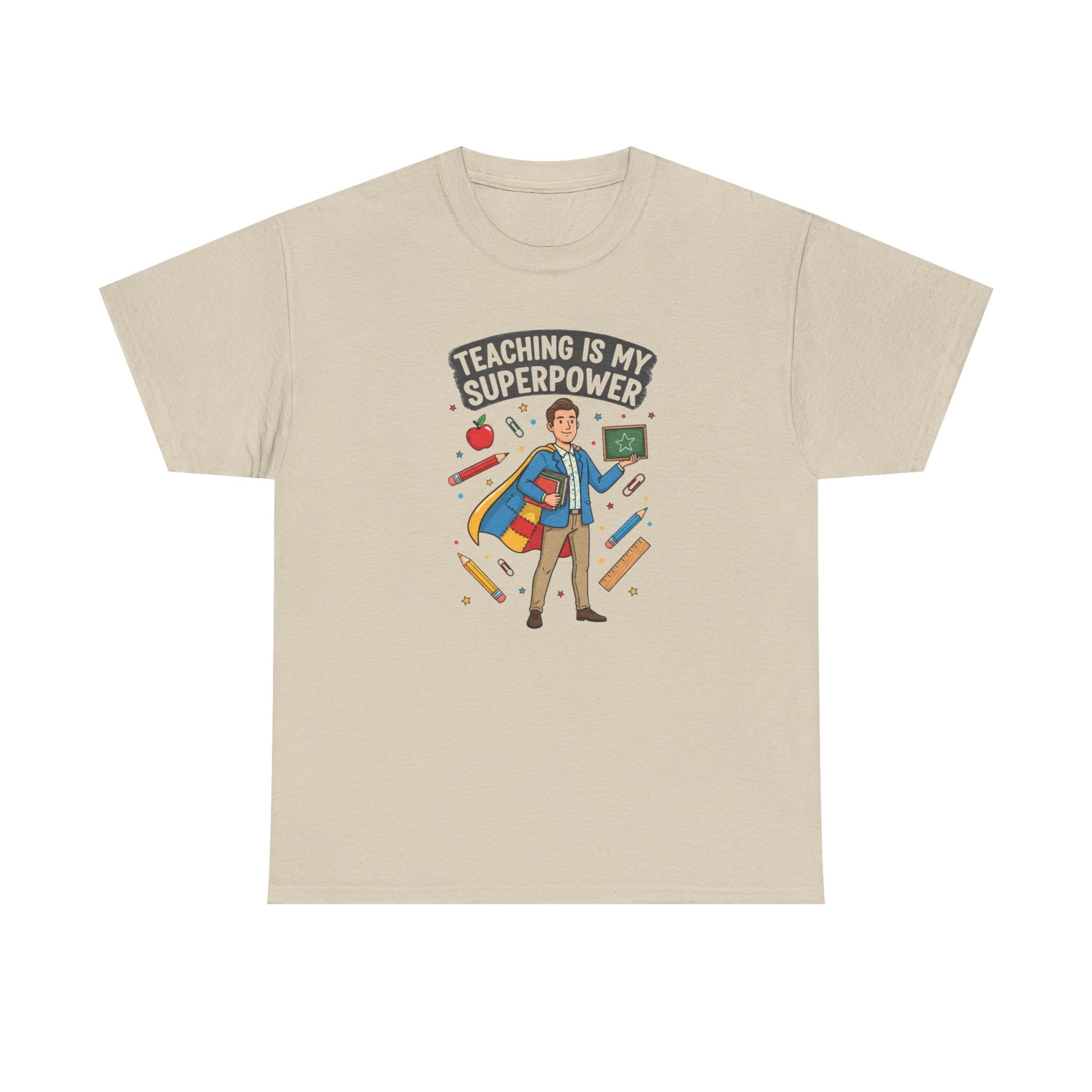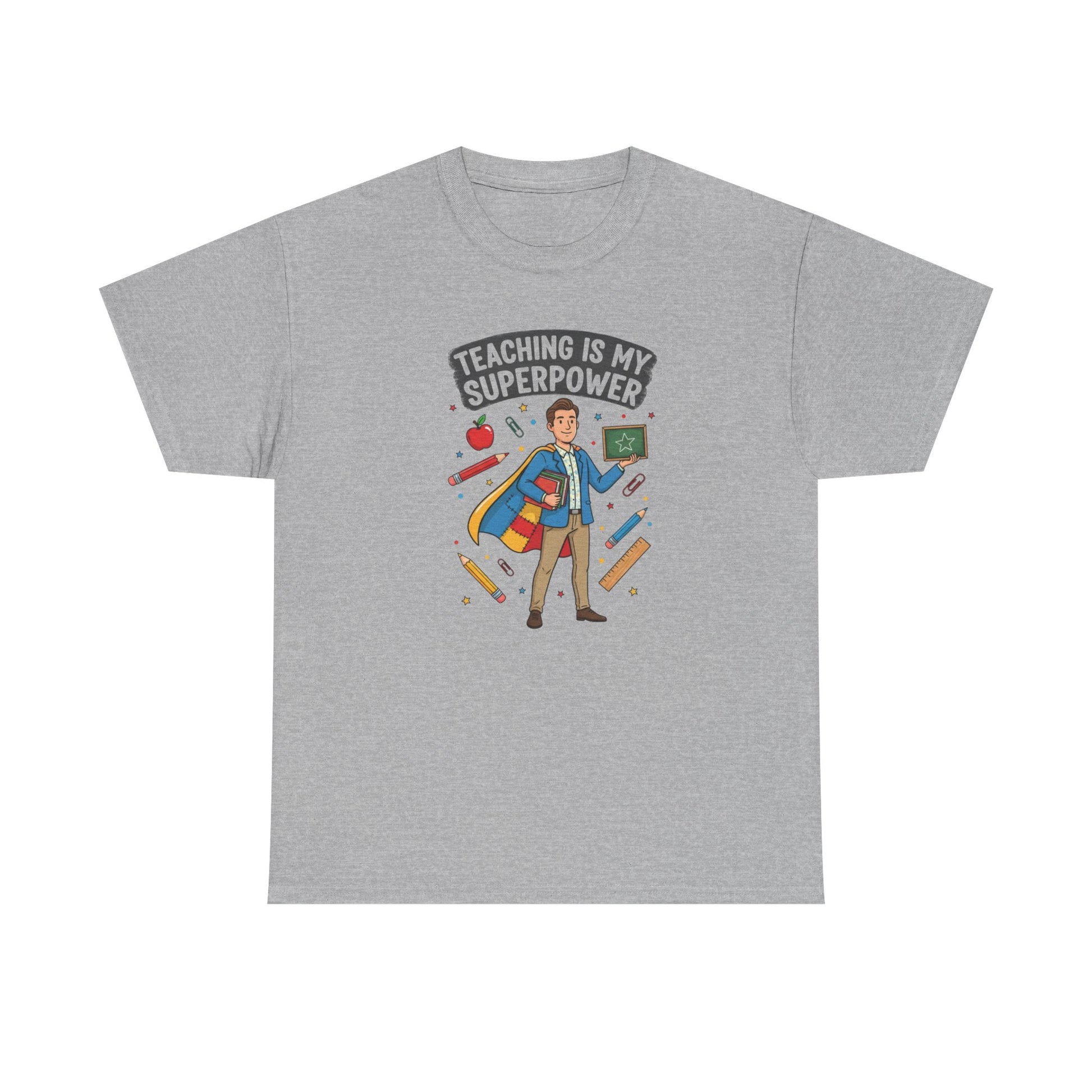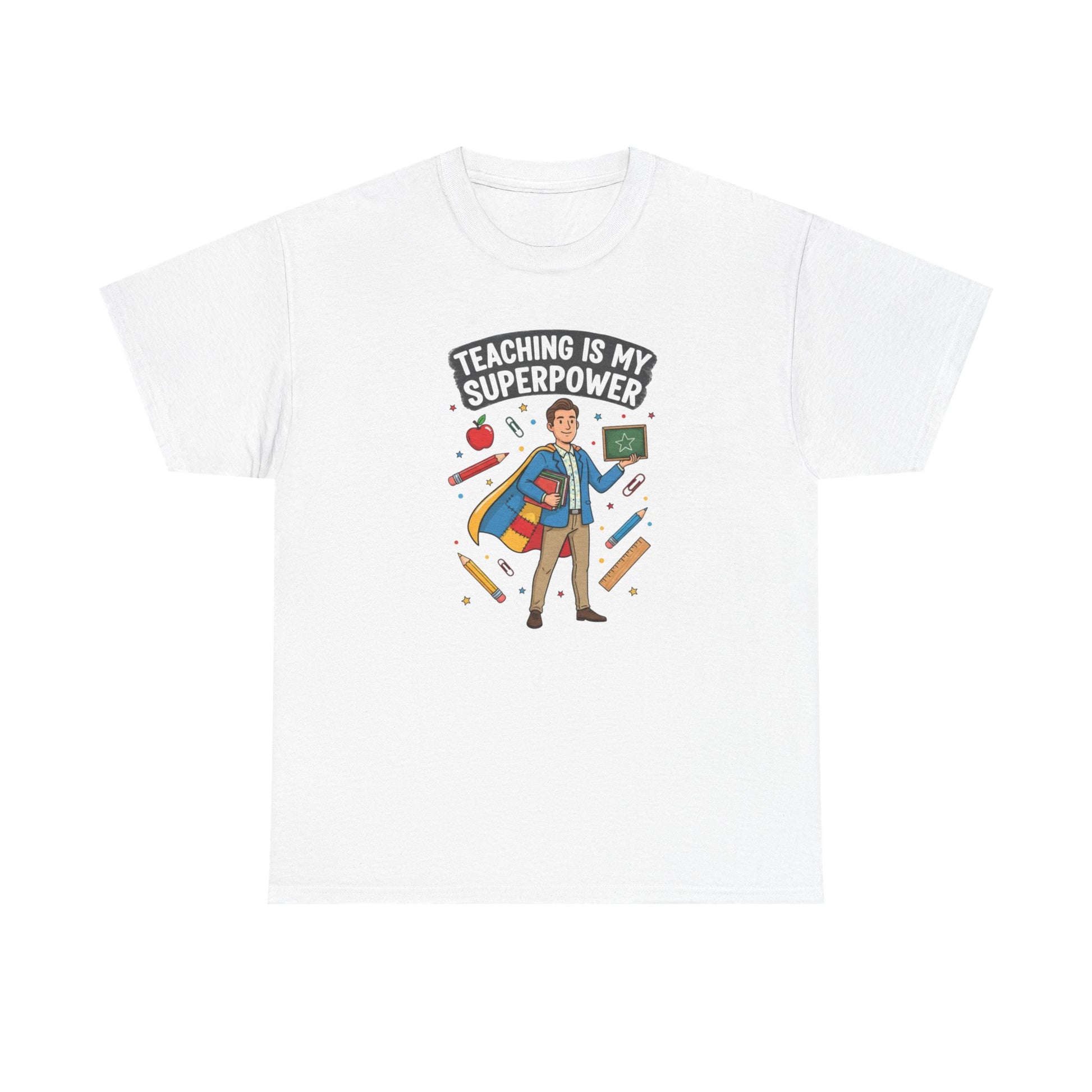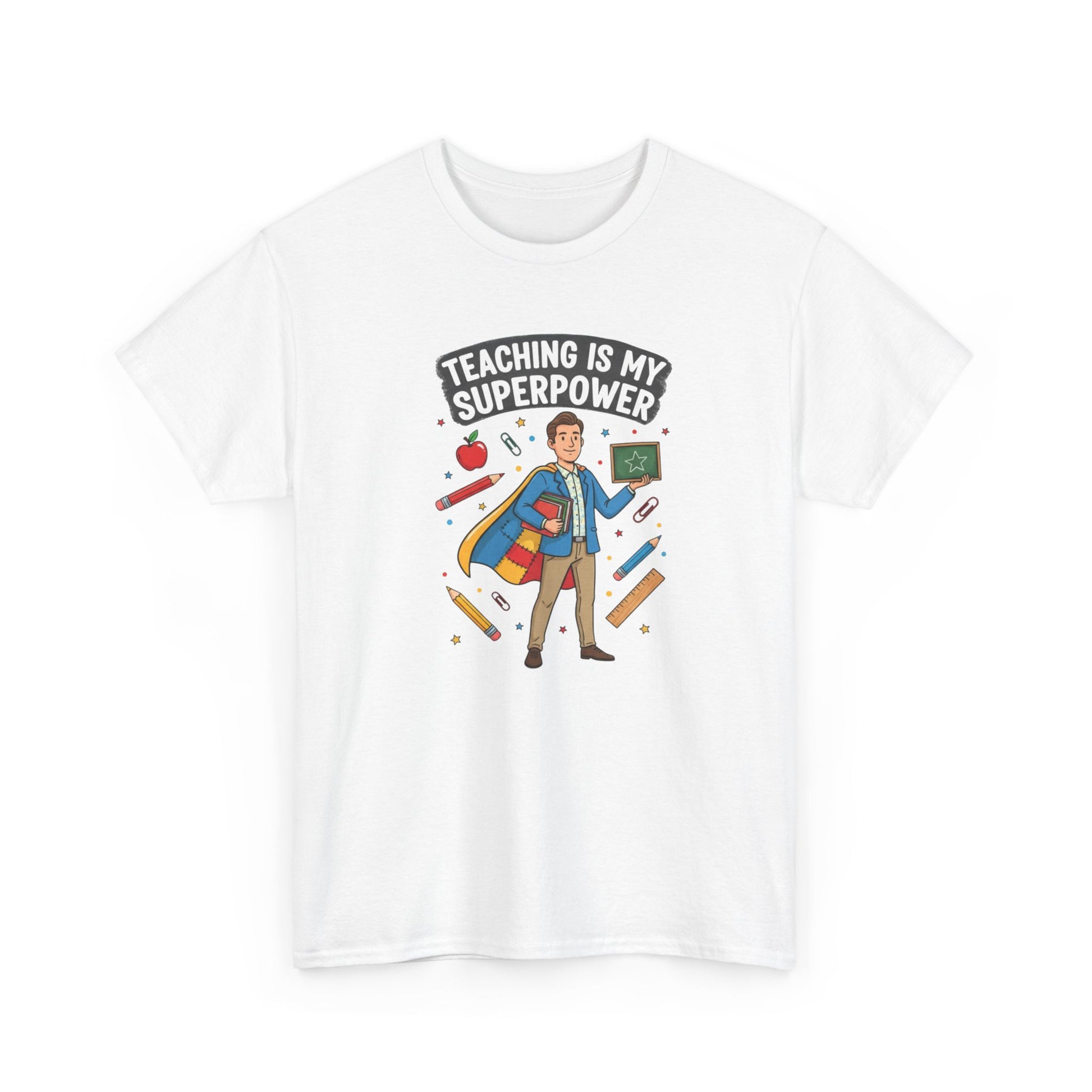 A cheerful, soft cotton tee made for teachers who carry energy, patience, and a little bit of magic into the classroom every day. The bright, playful graphic shows a confident teacher in a cape surrounded by pencils and hearts, with the bold headline “Teaching is My Superpower.” Wear it on casual school days, parent-teacher nights, or weekend hangouts to quietly celebrate the work you do and spark smiles from colleagues and students. The shirt’s classic crew neck and relaxed fit let you move through lessons and recess with ease, while durable printing keeps the illustration vivid wash after wash. Ethical cotton and thoughtful construction make this a comfortable, dependable layer whether you’re grading at your kitchen table or leading a lively lesson plan.