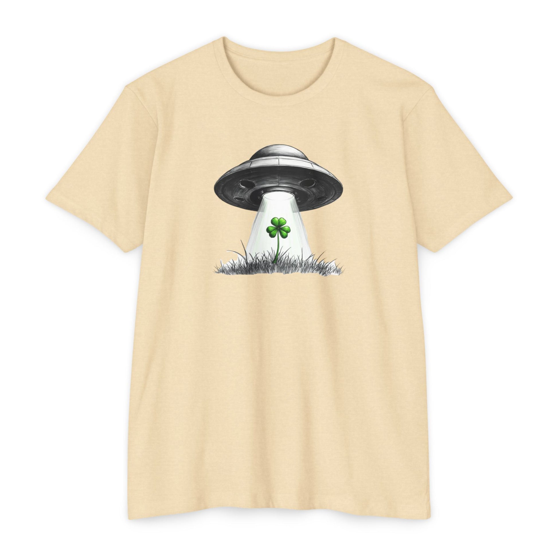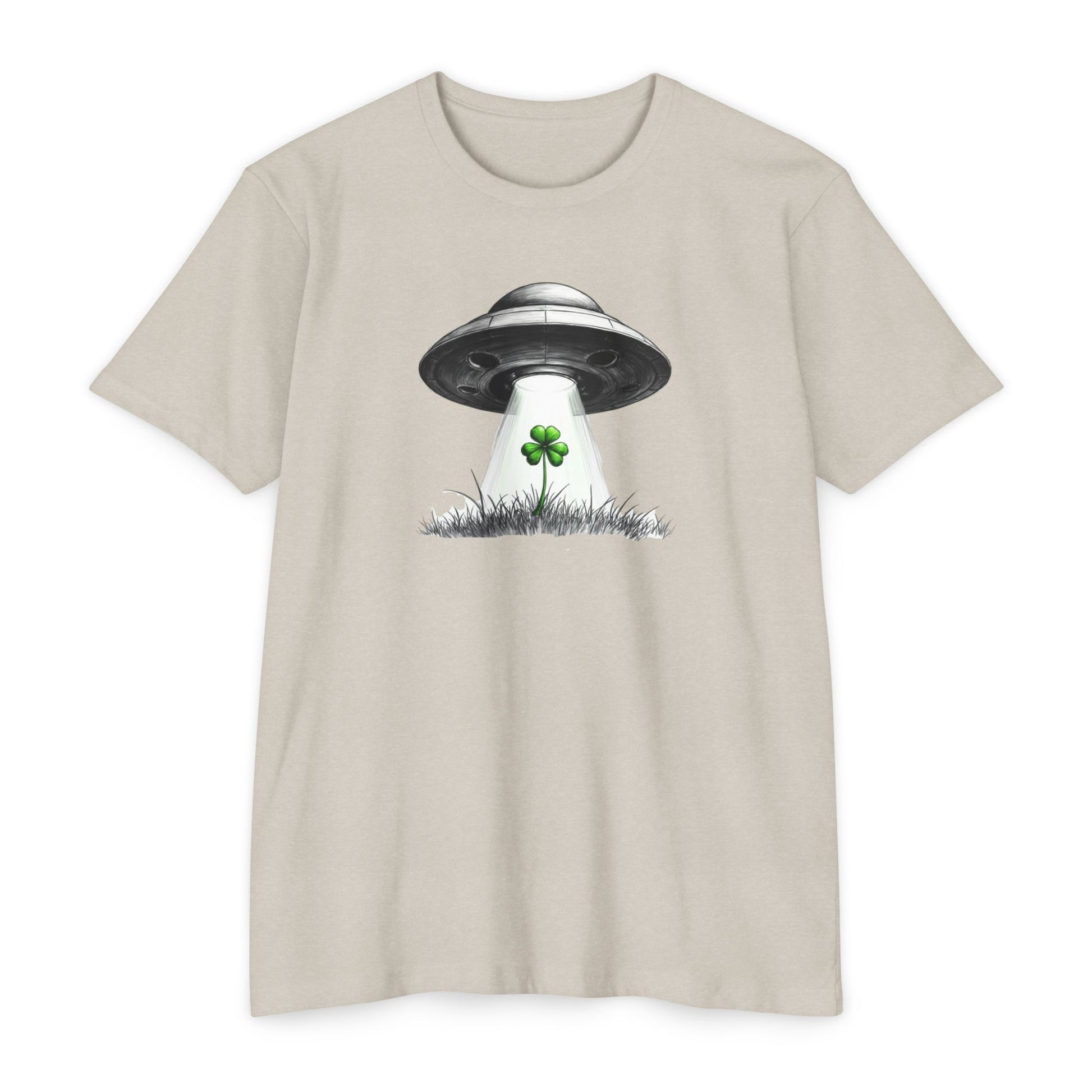 Soft cream cotton meets a wink of the weird. This lightweight tee wears like an easy companion for days when you want to blend subtle humor with low-key style. A retro UFO hovers above a single four-leaf clover, beam of light catching the tiny blades of grass — a quiet, playful image for anyone who likes their luck served with a side of sci-fi. Comfortable and breathable, it layers under jackets or stands alone on warmer days. The illustration sits centered and small enough to feel personal, like a secret nod to fellow oddball nature lovers during spring gatherings or casual St. Patrick’s strolls.